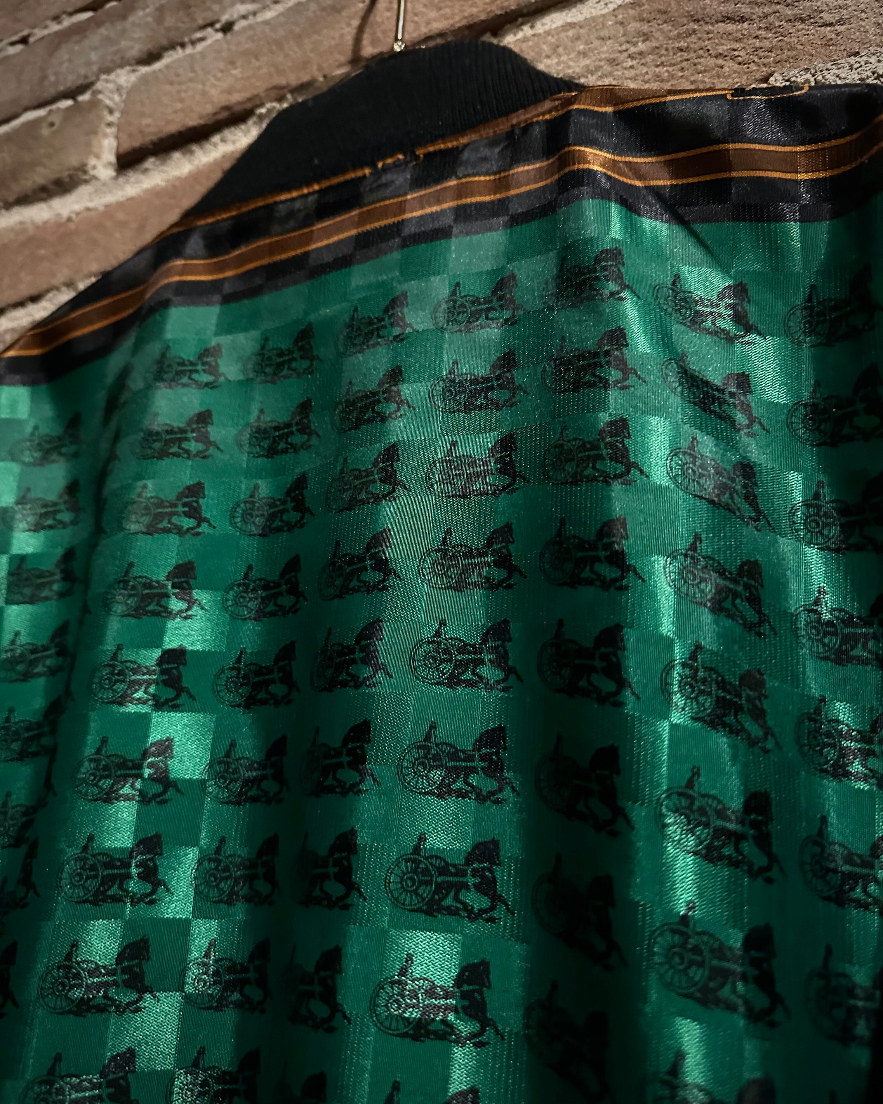 表面は鮮やかなグリーンのボディに、織りでチェック柄を載せ、エルメスやバーバリー、ラルフローレン等の名だたる名門ブランドから愛され、アイコンとしても用いられている馬を表現。