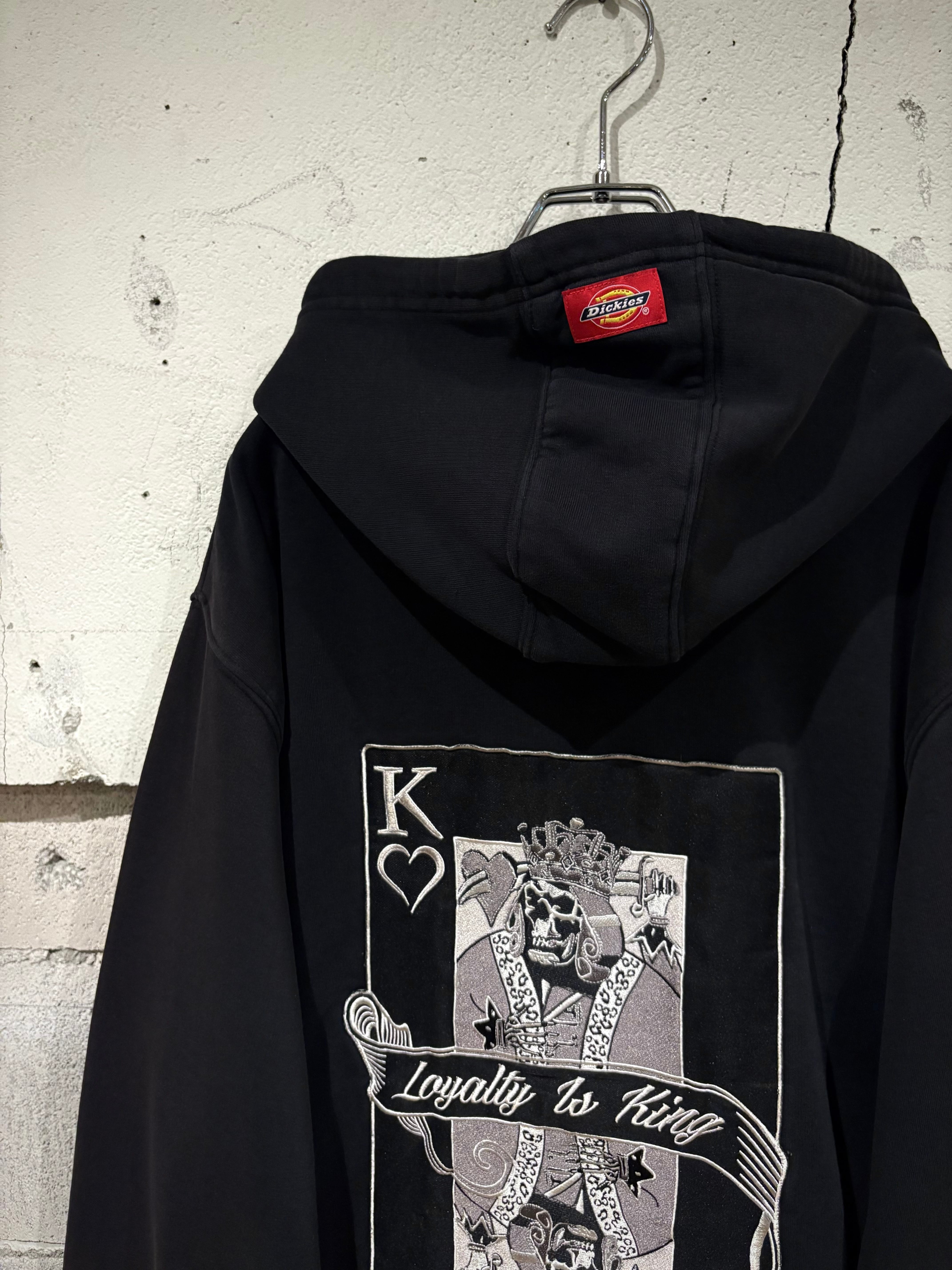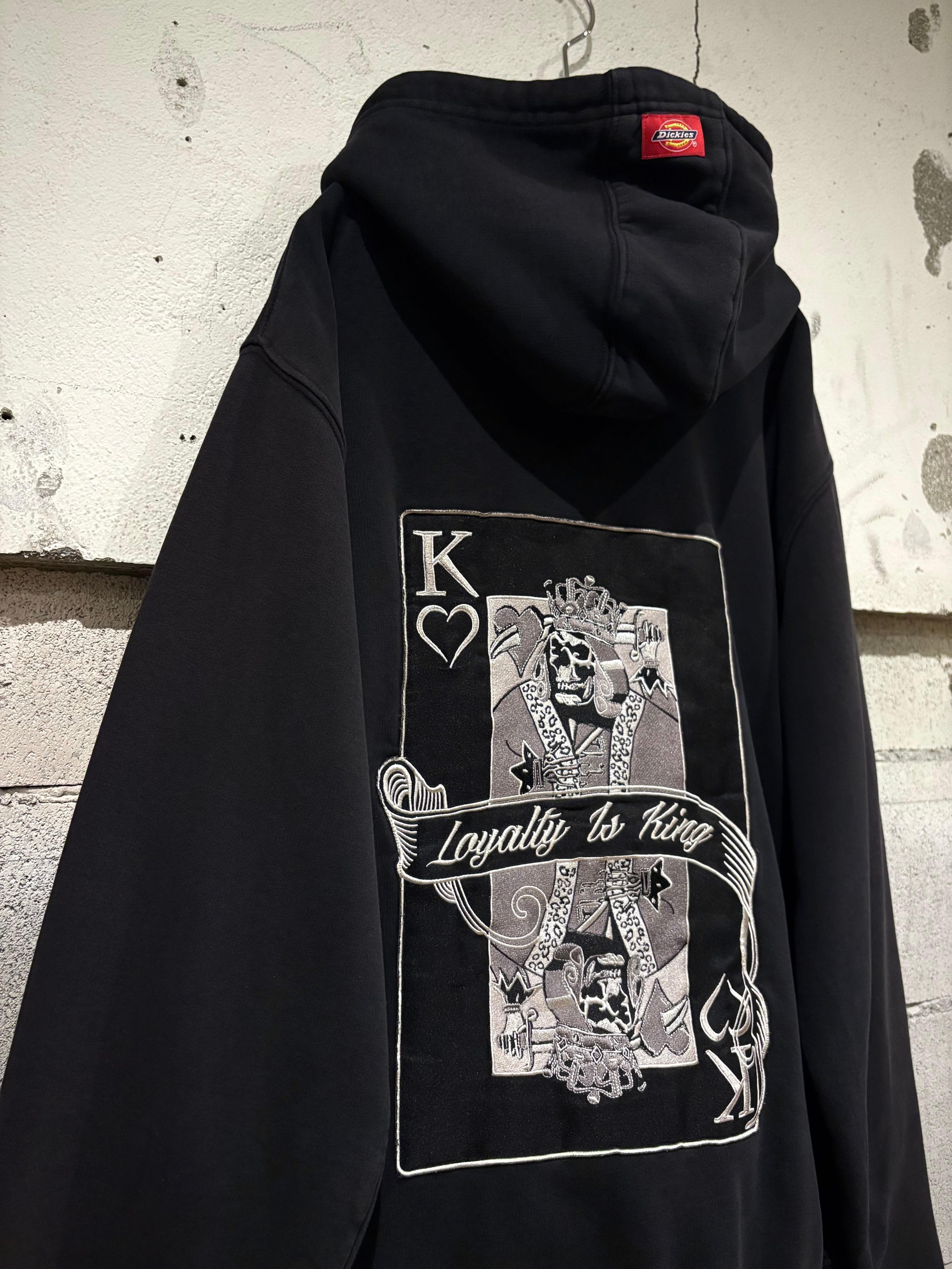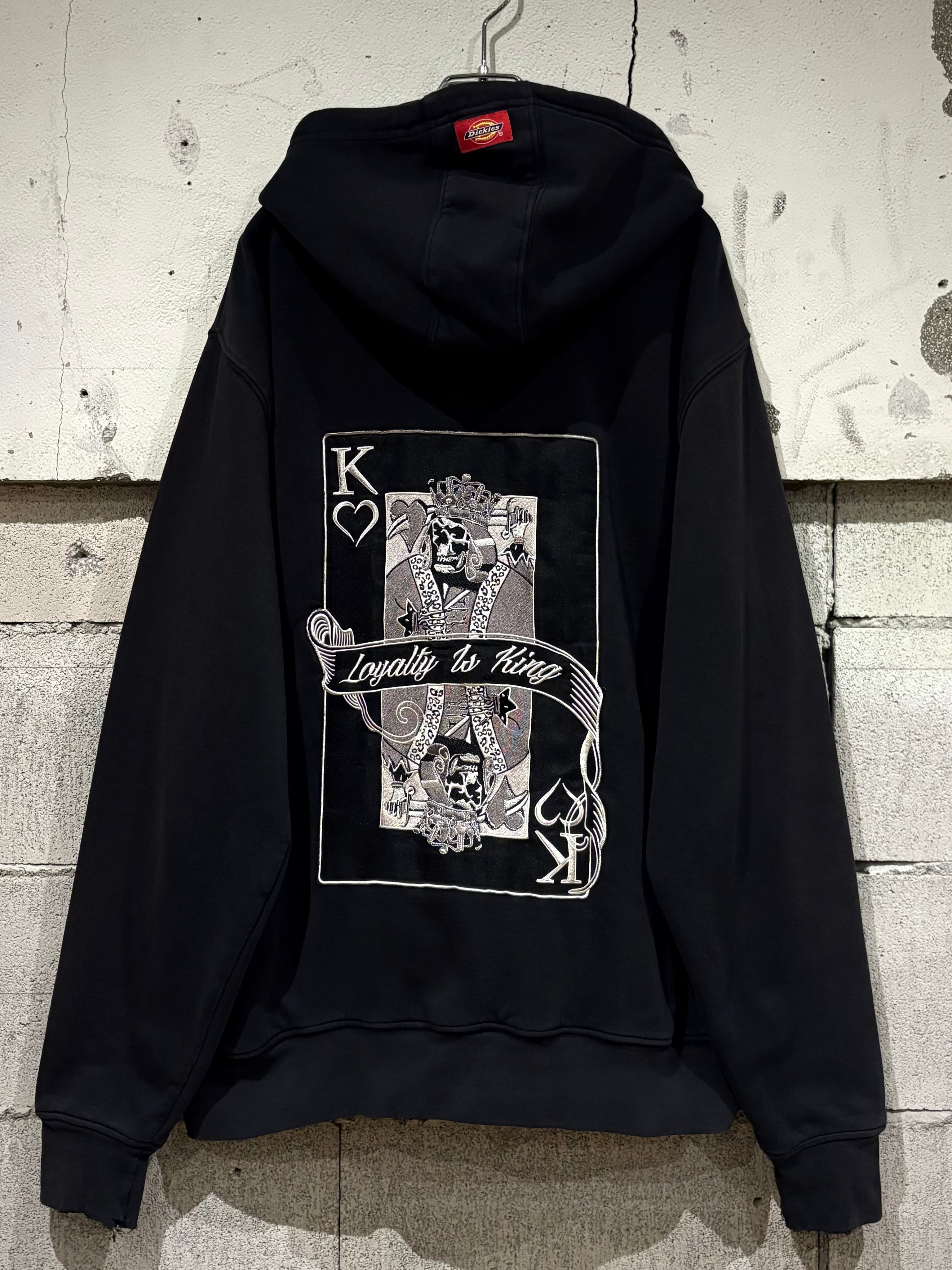 ブラックのボディをベースに、背面にトランプのキングをスカルでデザインし、超イケてるパッチを載せたジップアップフーディ。