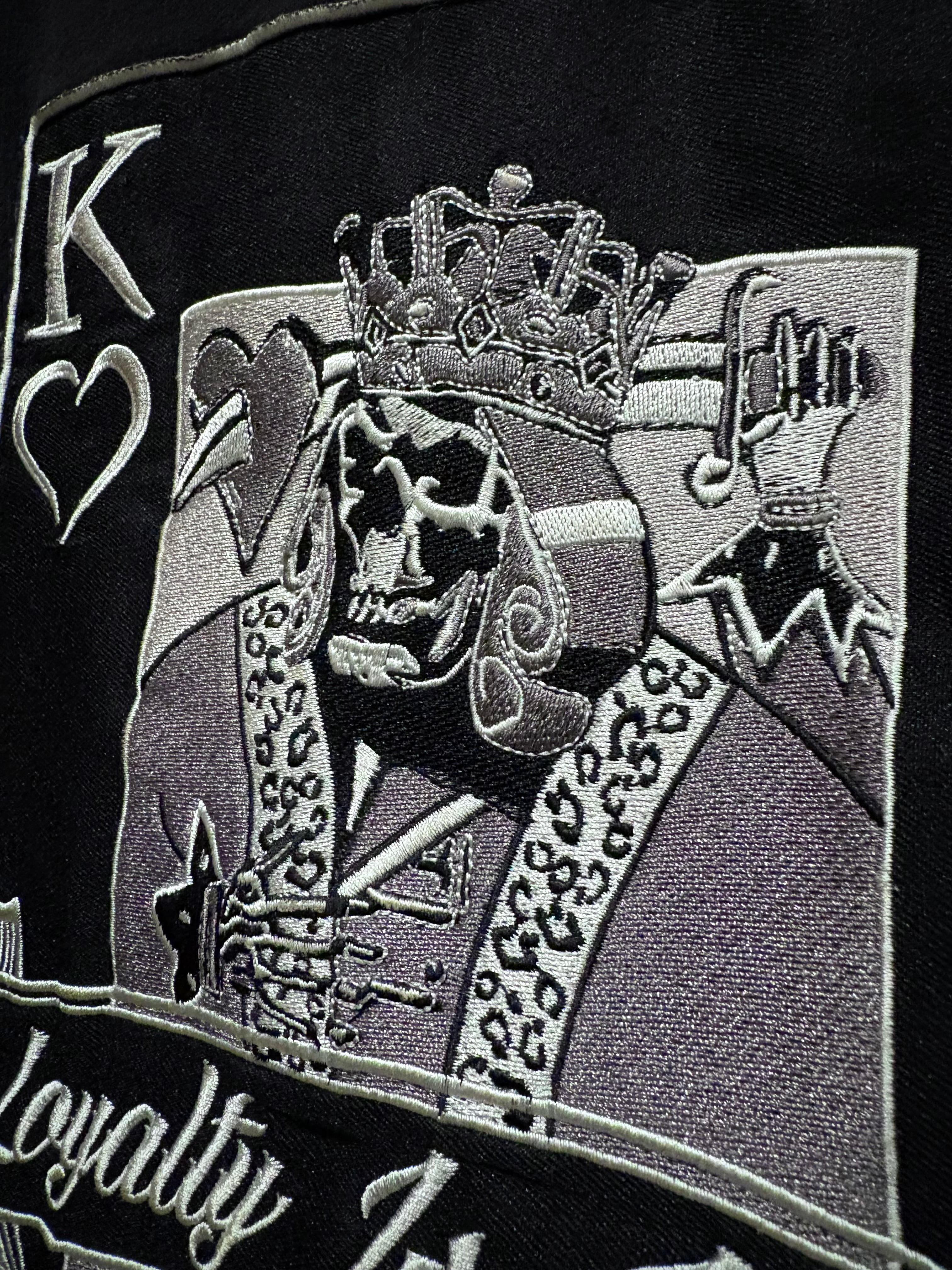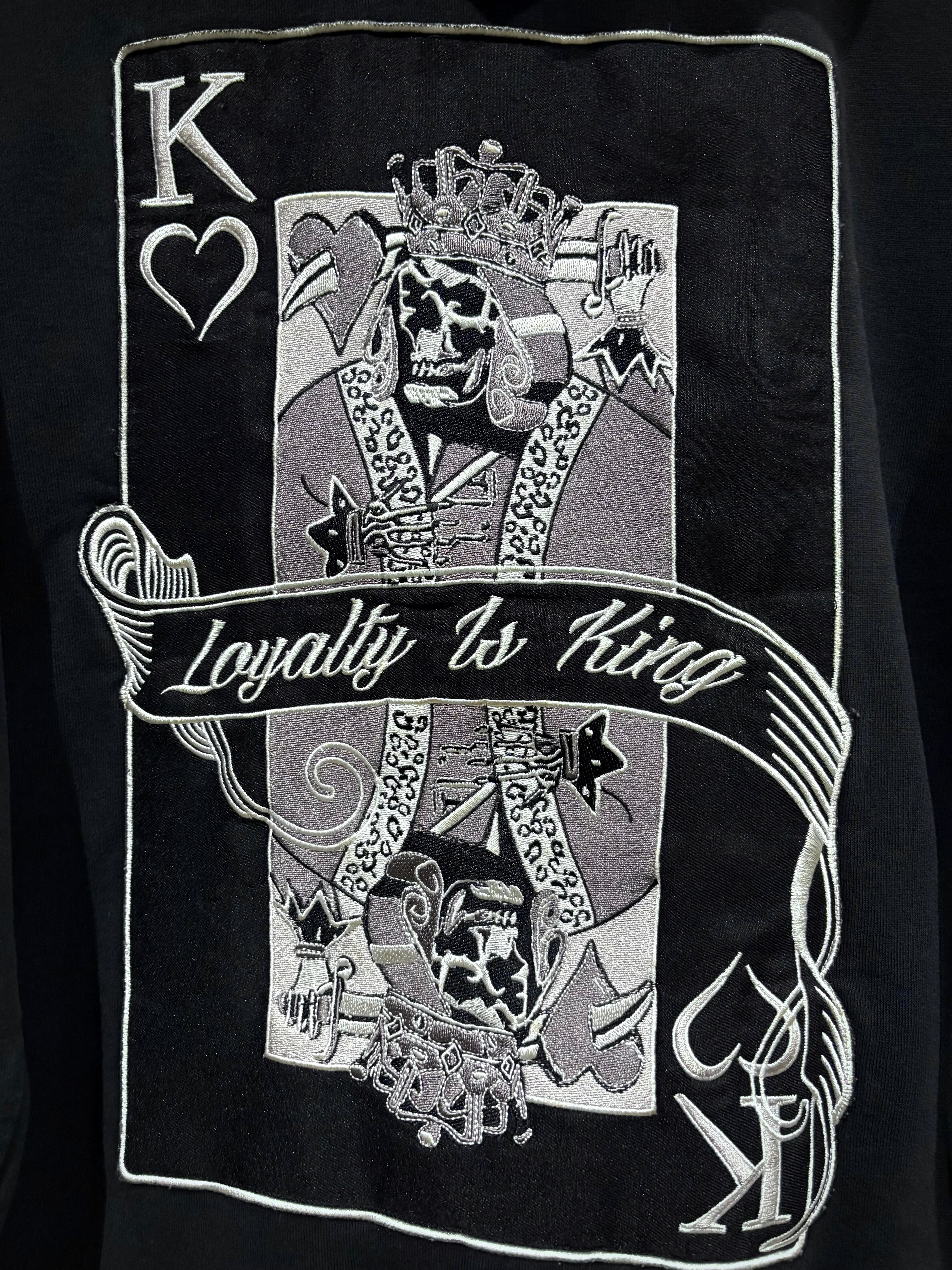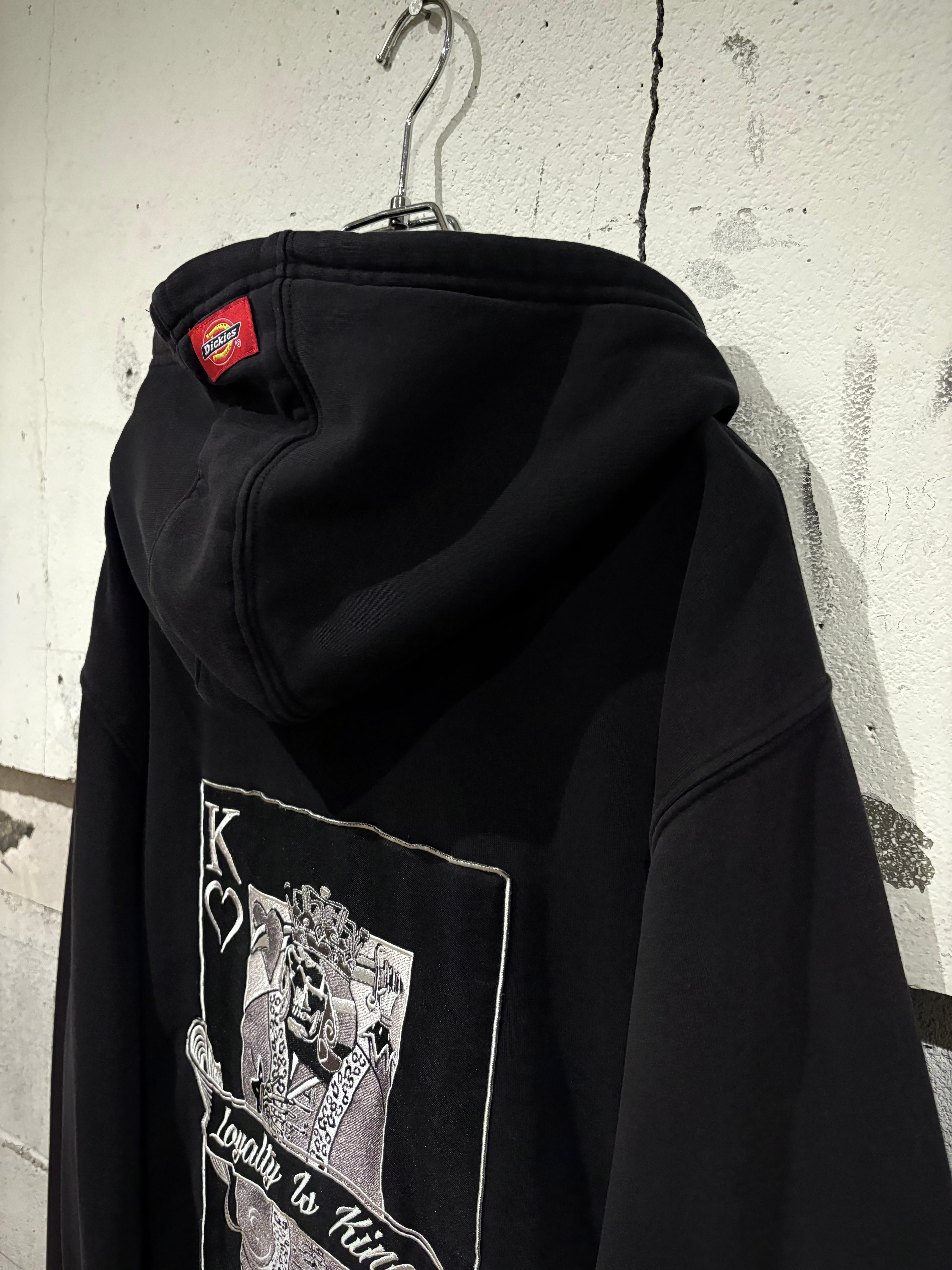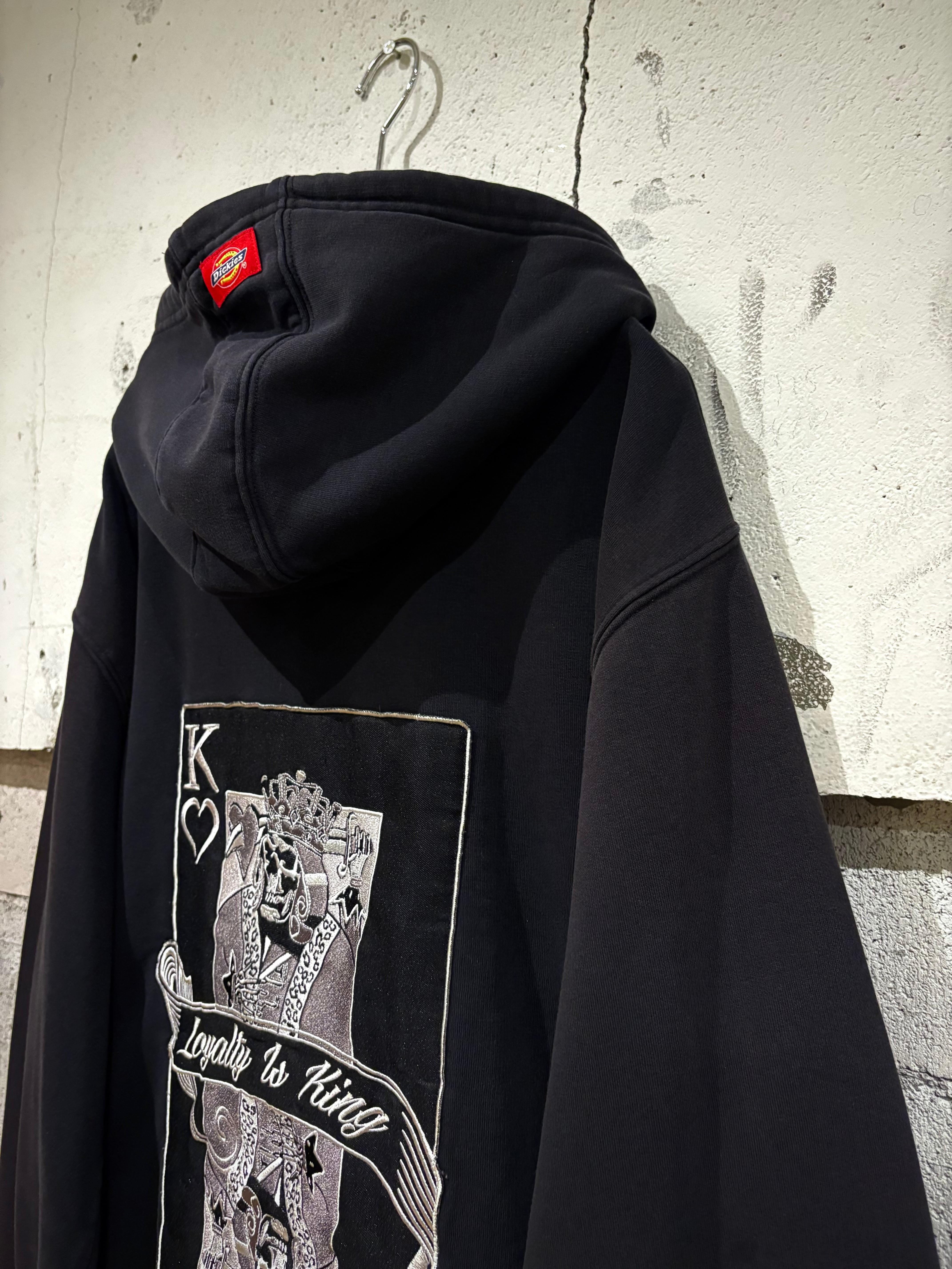 ブラックのボディをベースに、背面にトランプのキングをスカルでデザインし、超イケてるパッチを載せたジップアップフーディ。