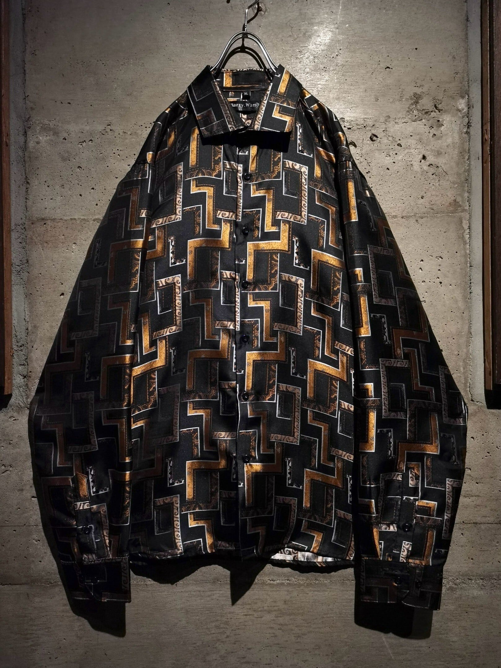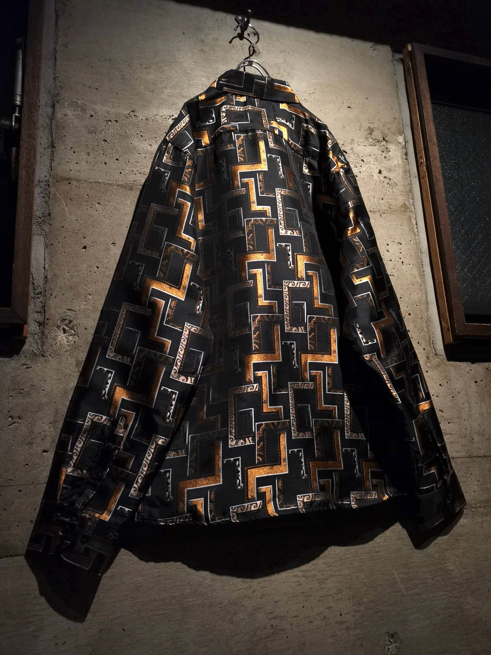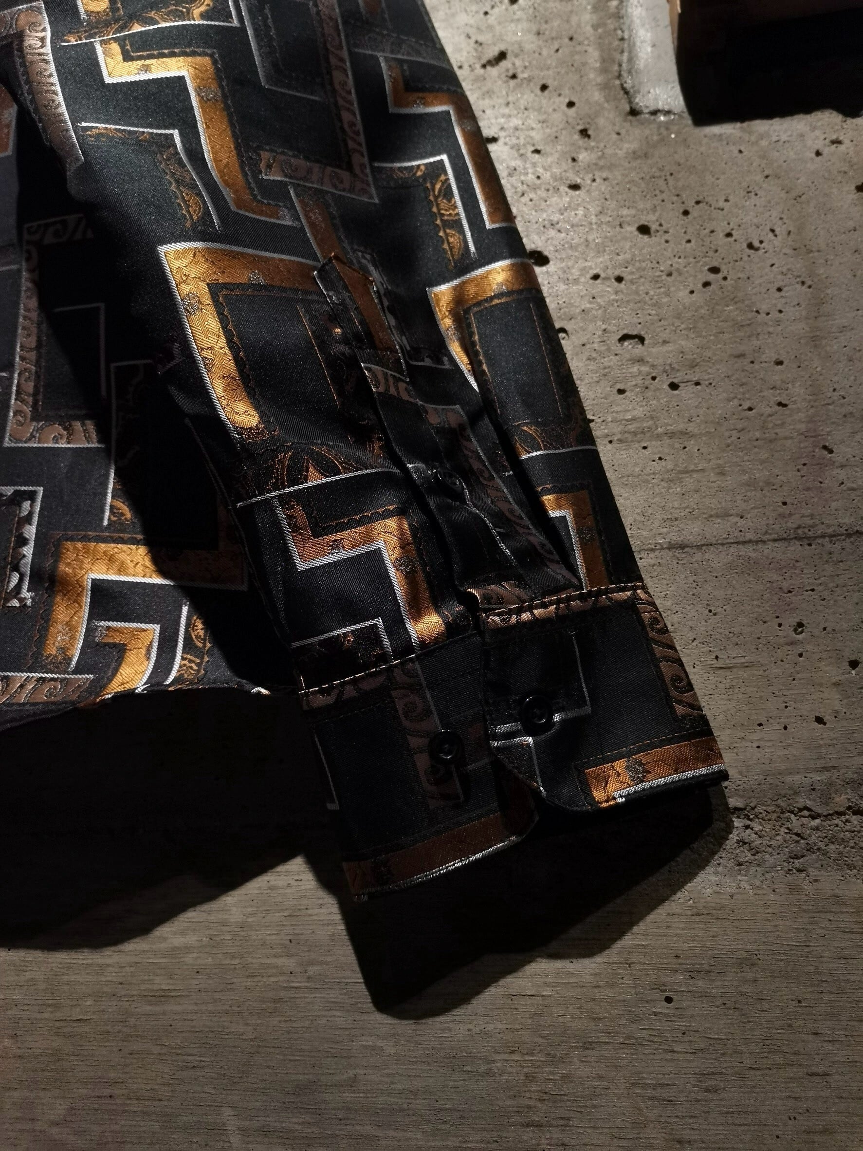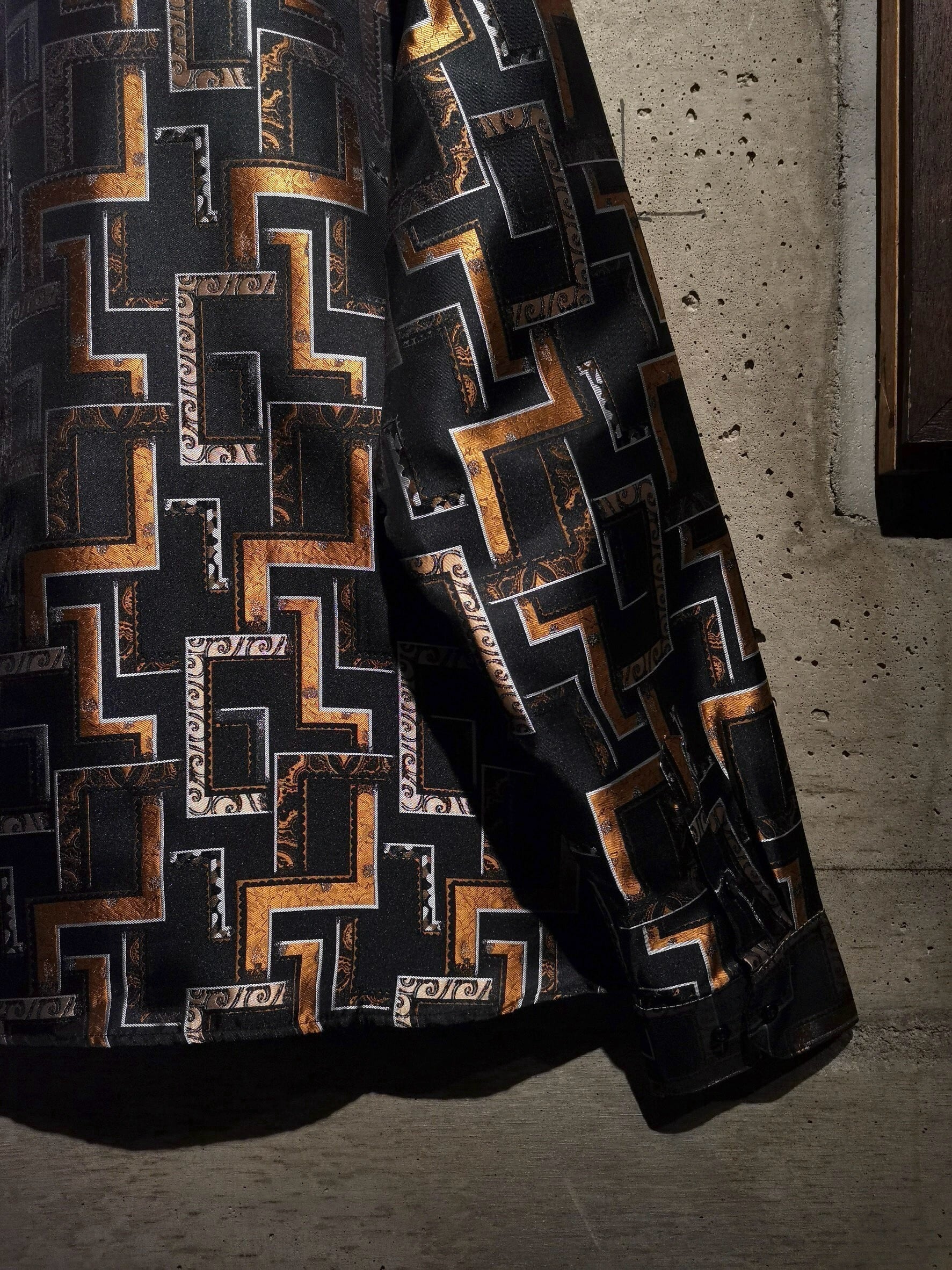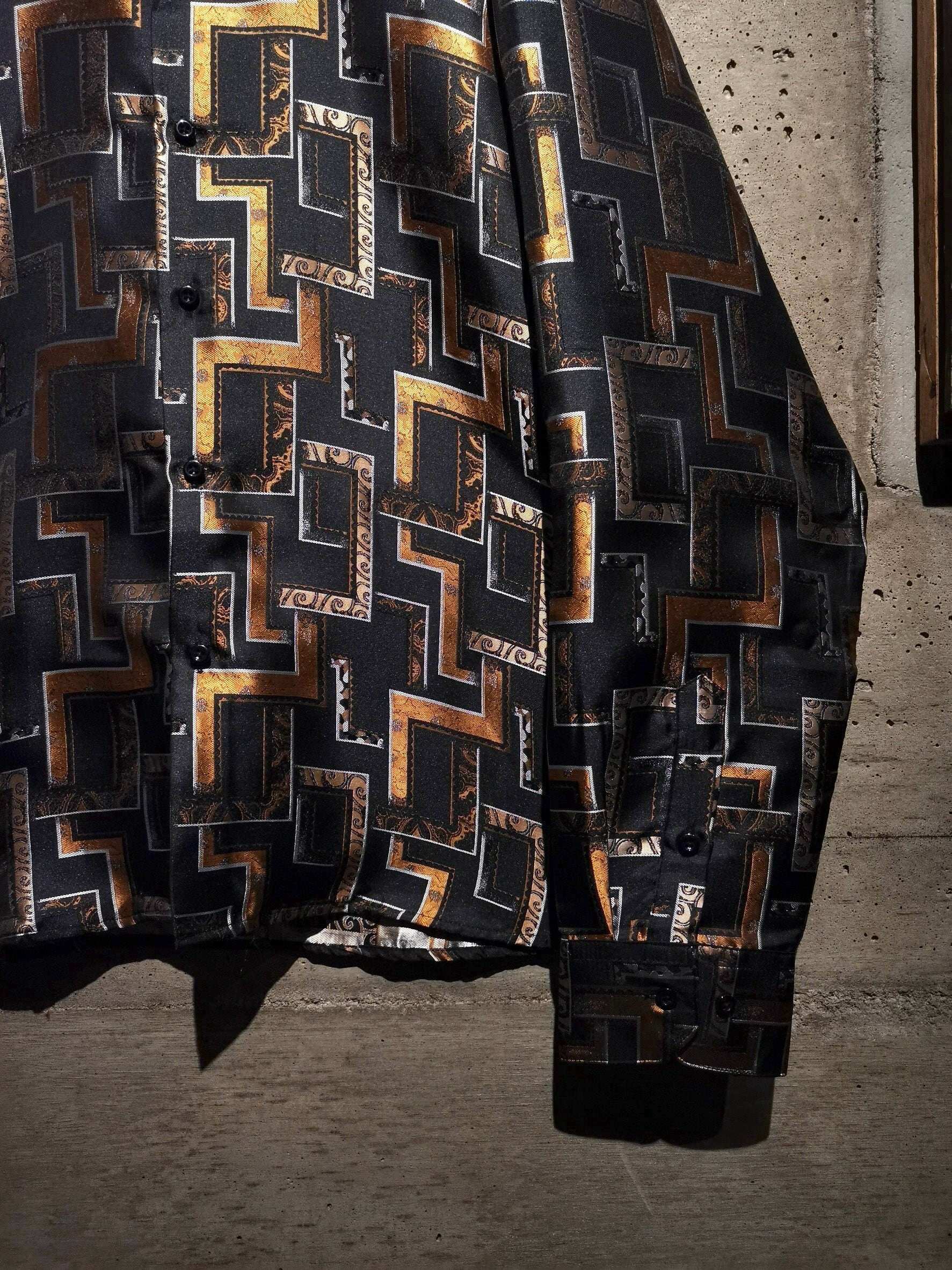 光沢を帯びたハリのある質感のブラックボディに、シルバー、キャメルの配色で幾何学柄を載せた長袖シャツ。