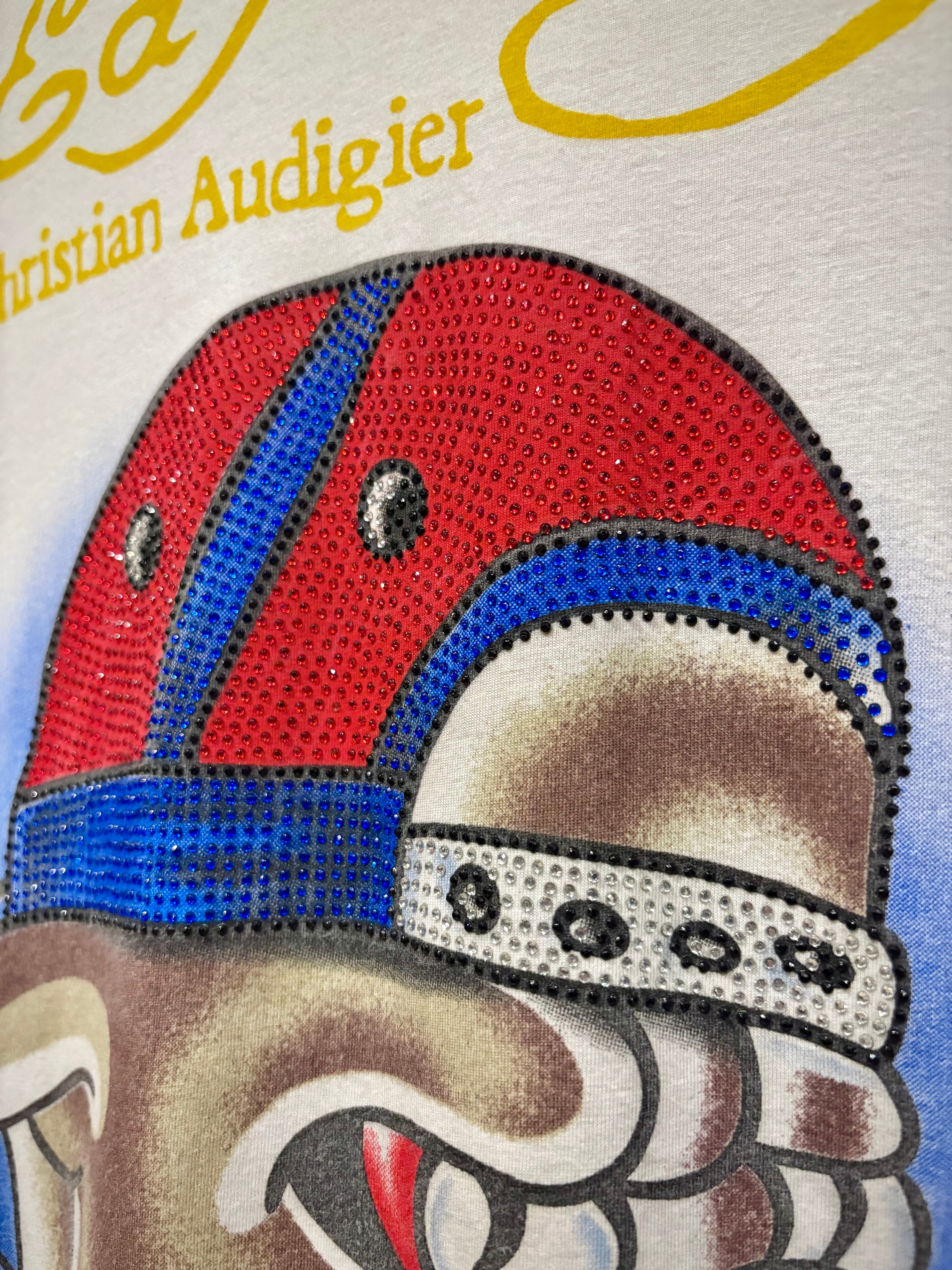ボディのフロントに、ピースマークのチェーンを首から下げたブルドッグをプリント。キャップには繊細なラインストーンが載せられ、よりBling-Blingな表情に磨きがかかっています。