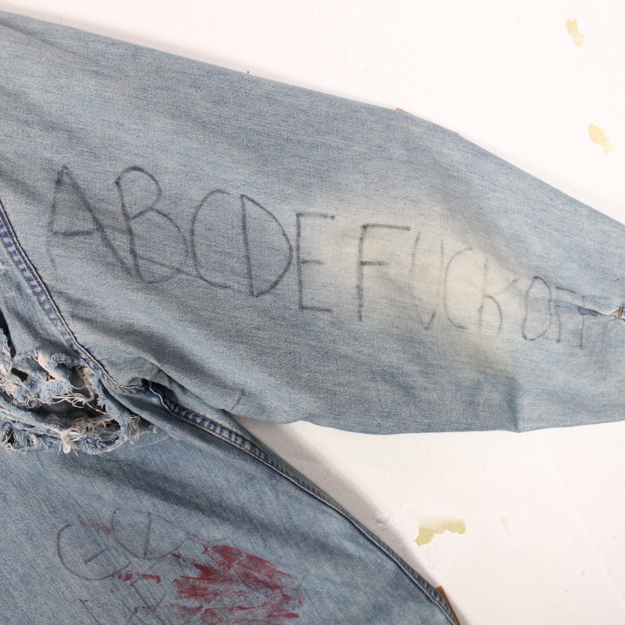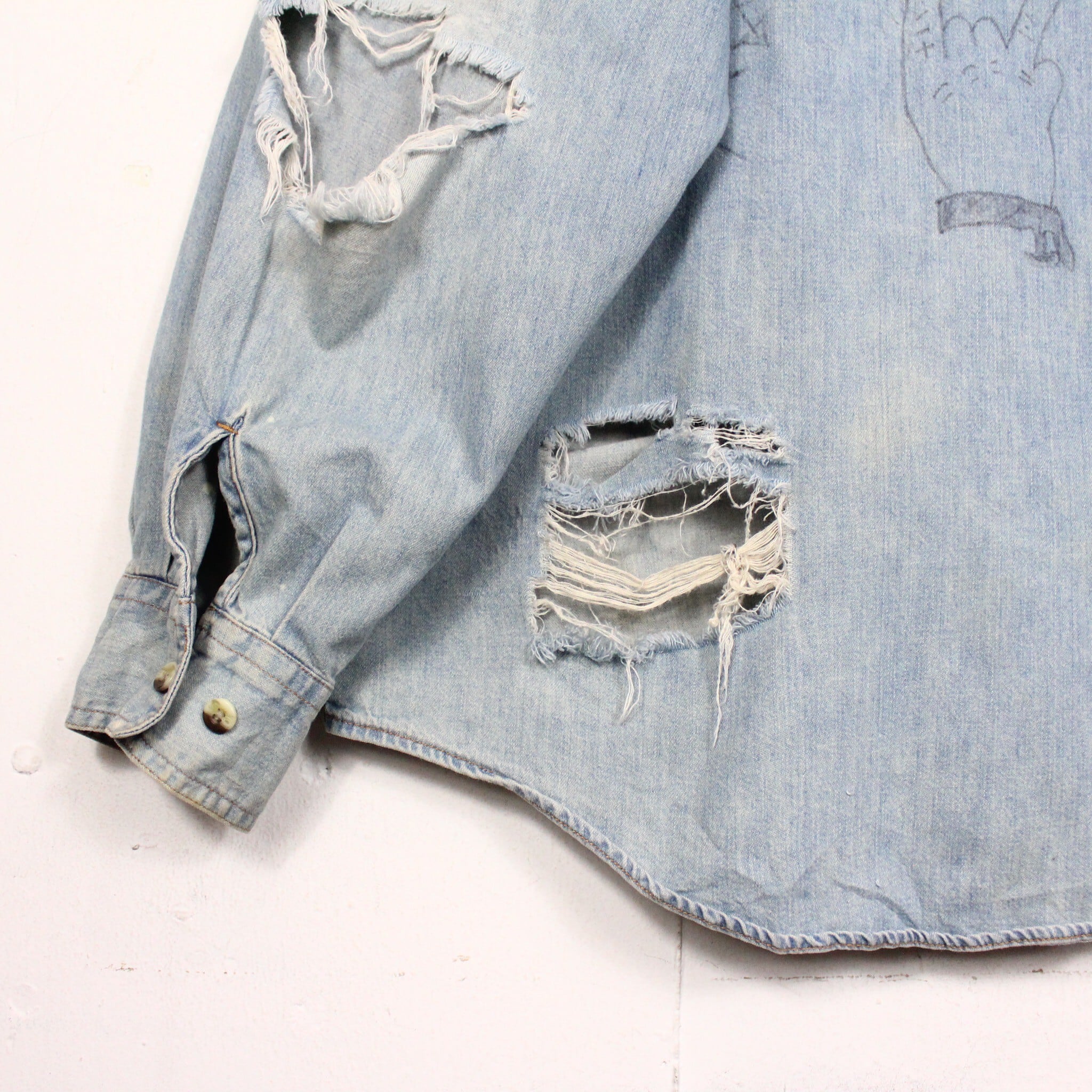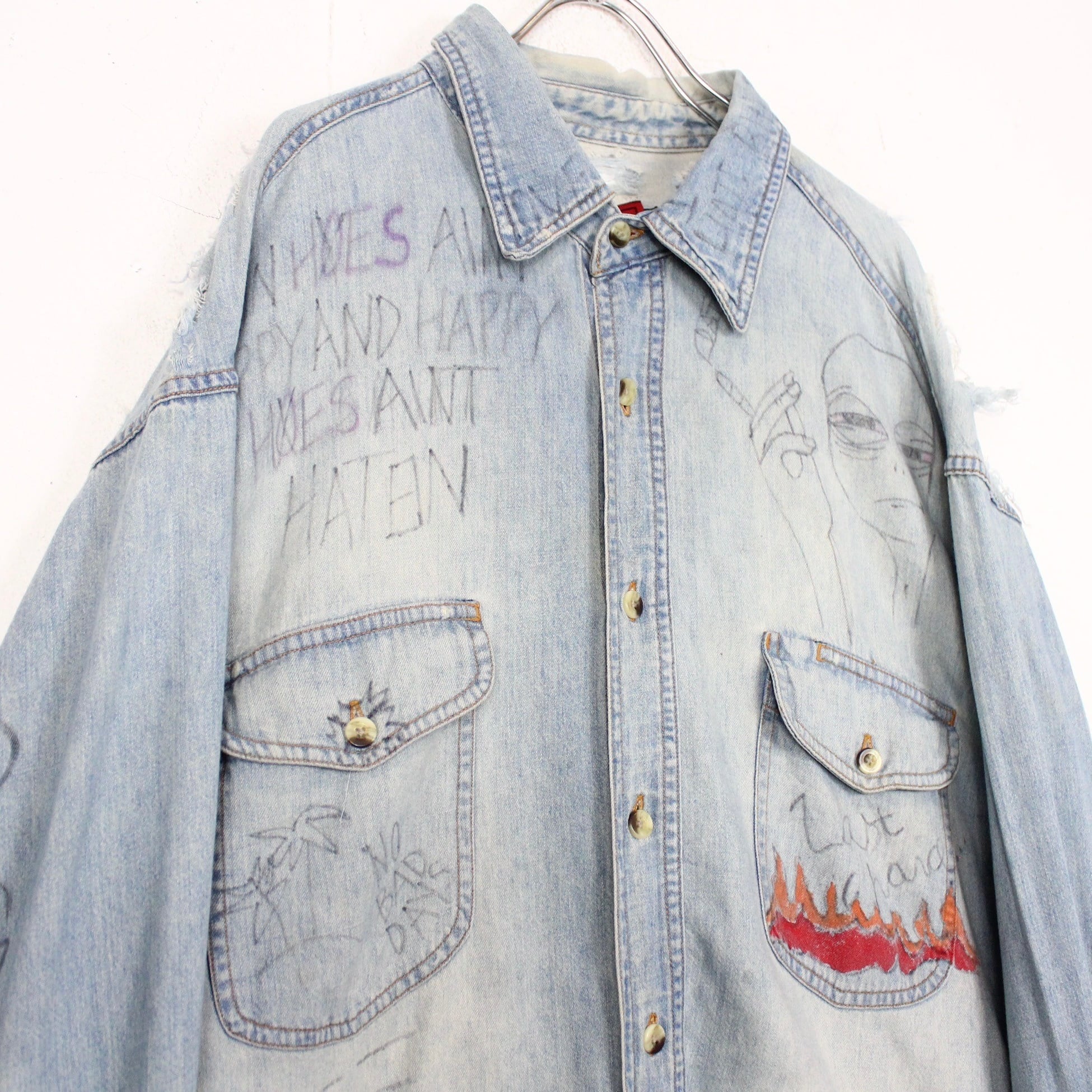 美しいアイスウォッシュのデニムボディーに、恐らく前所有者の粋な計らいによってハンドペイントが施されたデニムシャツ。全所有者の思想が乗りに乗った唯一無二なデザインに、服好きの心が鷲掴みにされますよね。