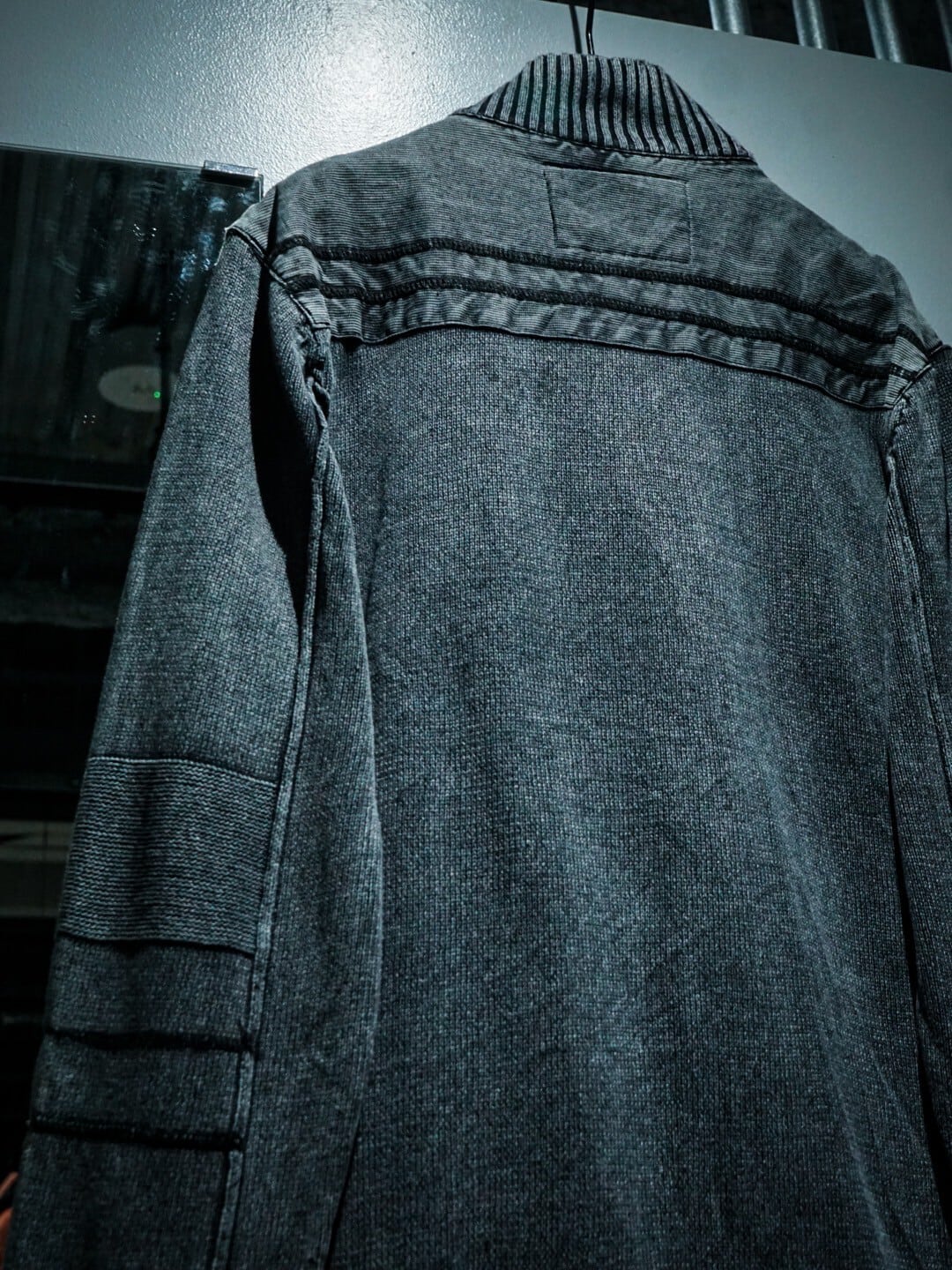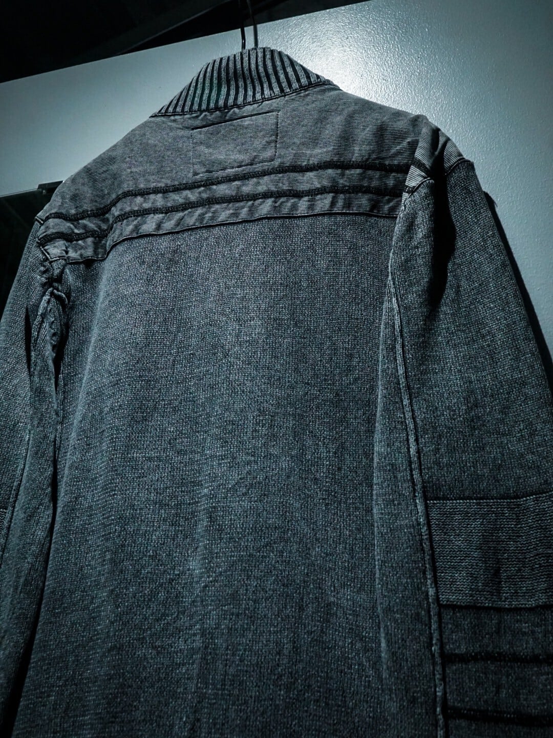 フェードグレーのボディをベースに、肩周りをツイル織りのタフな生地で切り替えたジップアップニットジャケット。