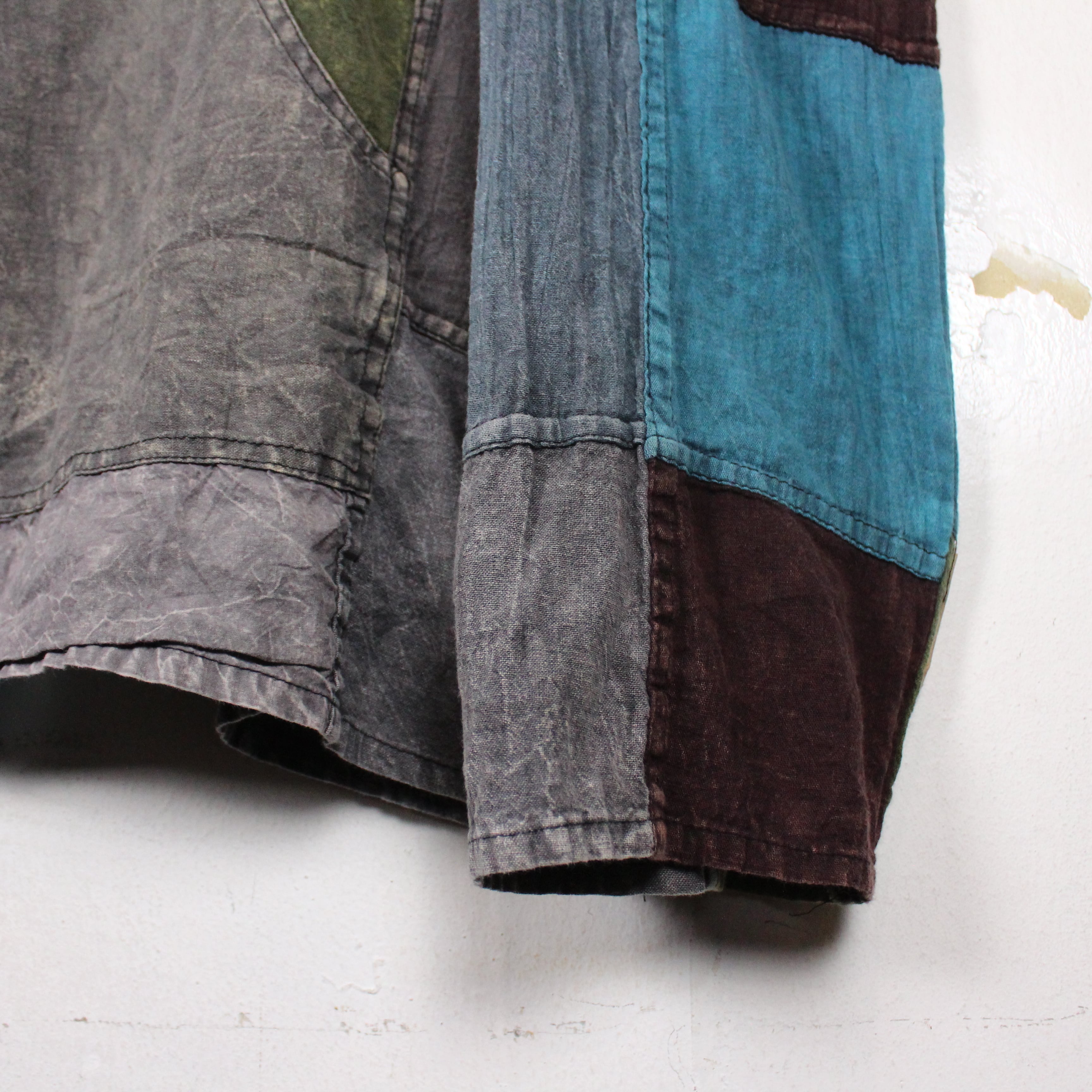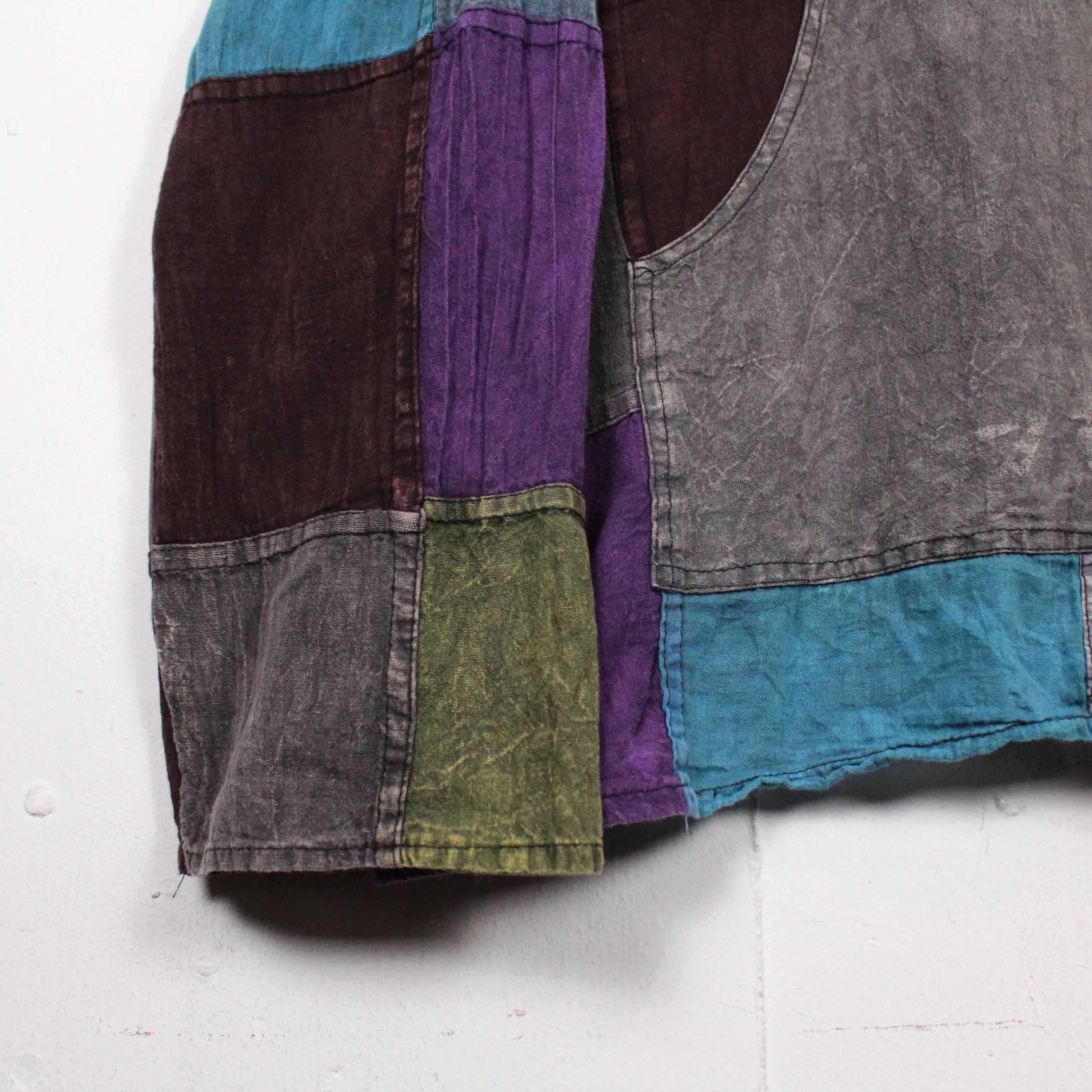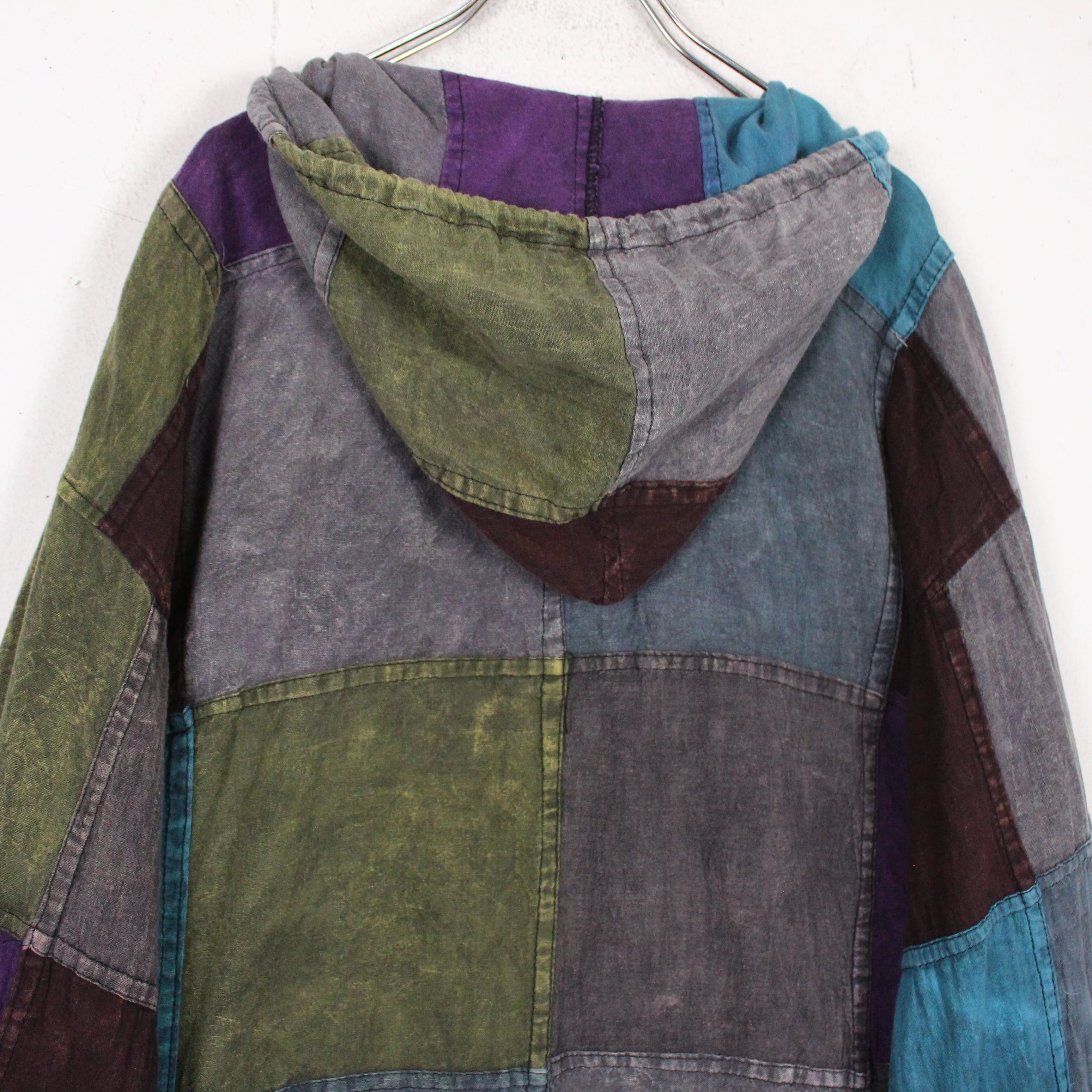 カーキ、ブラウン、ブルー、パープルのカラーリングでパッチワーク調に仕上げた1着。