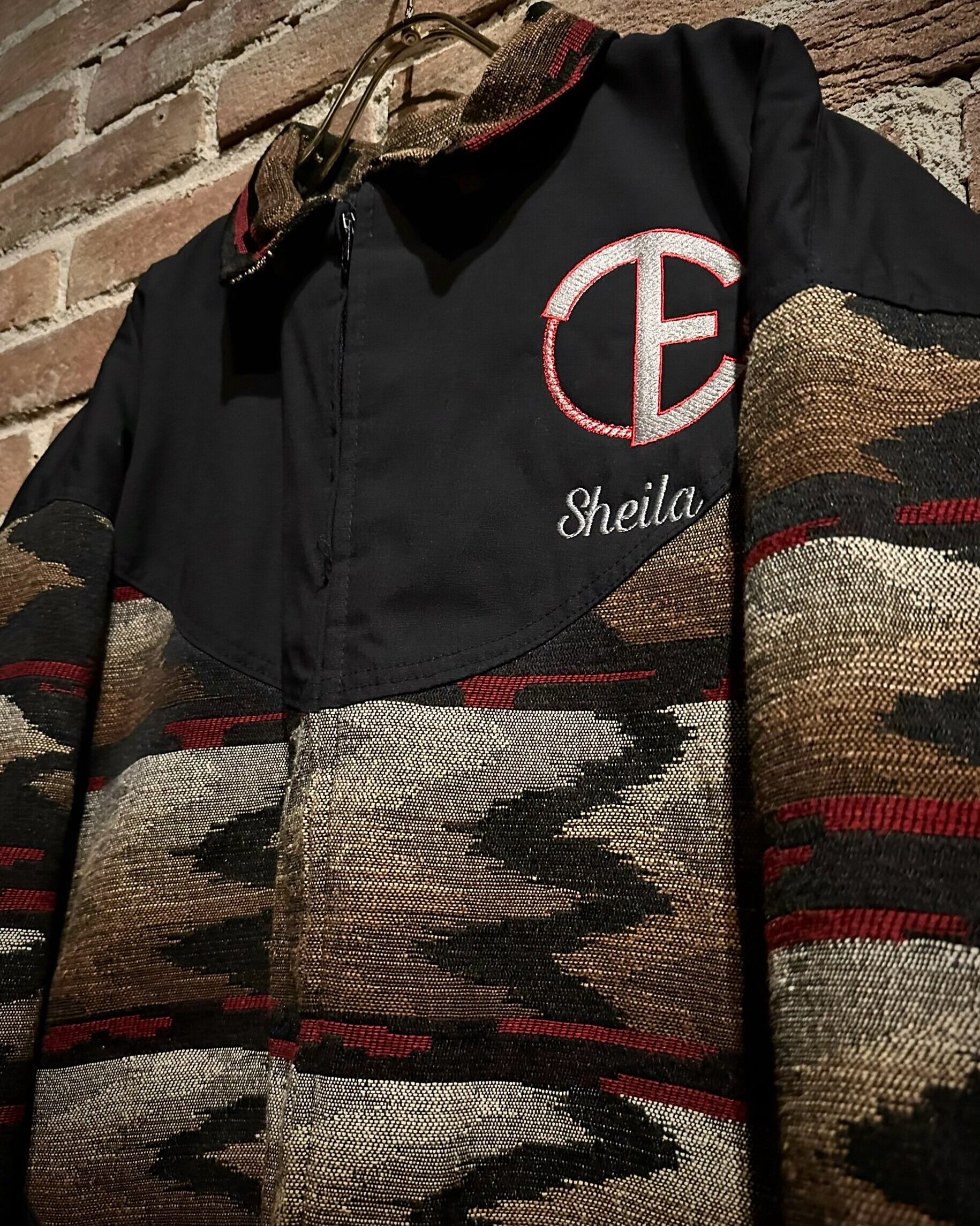 タフなブラックのボディをベースに、コシのあるゴブラン織でネイティブ柄を切り替えたジャケット。
