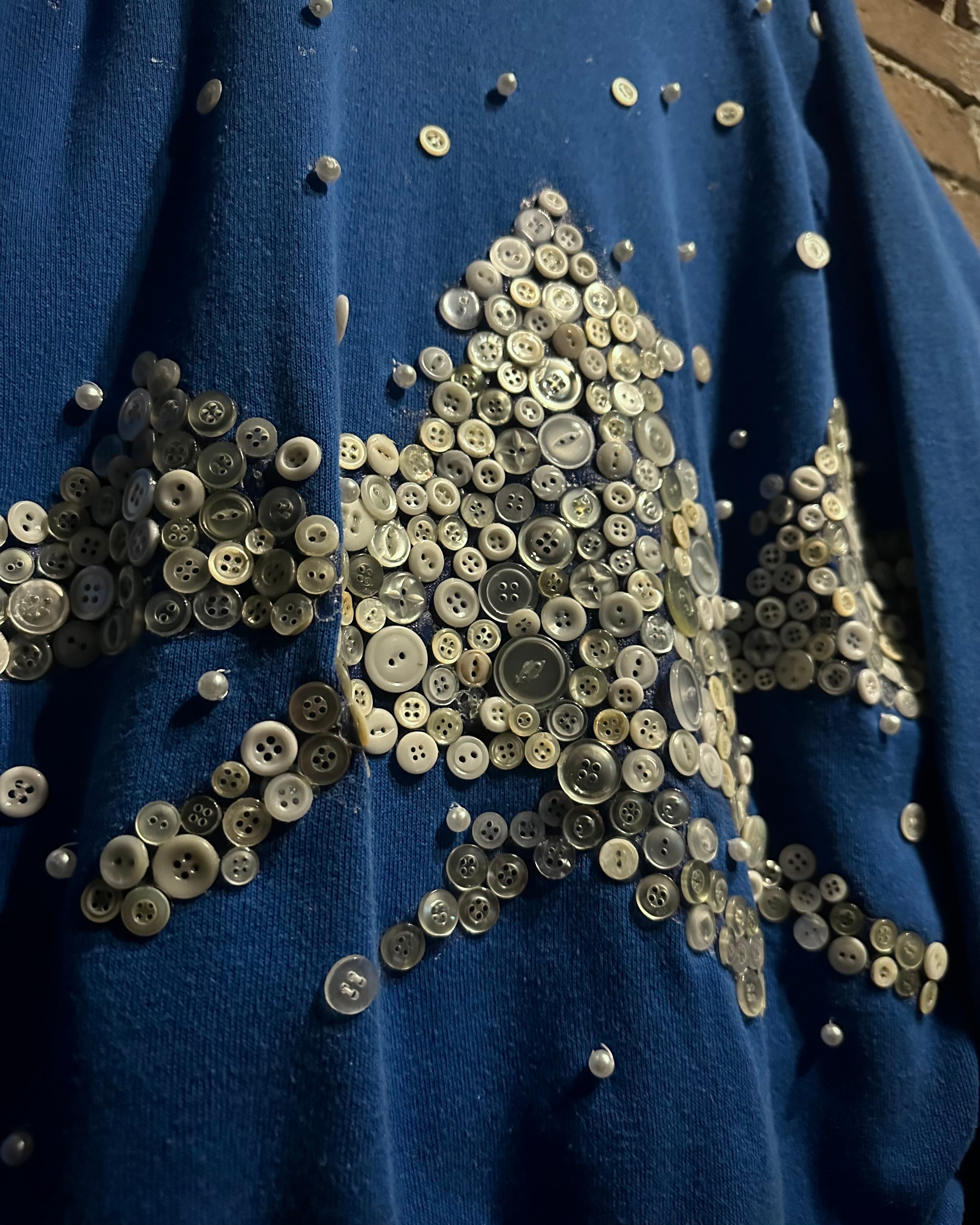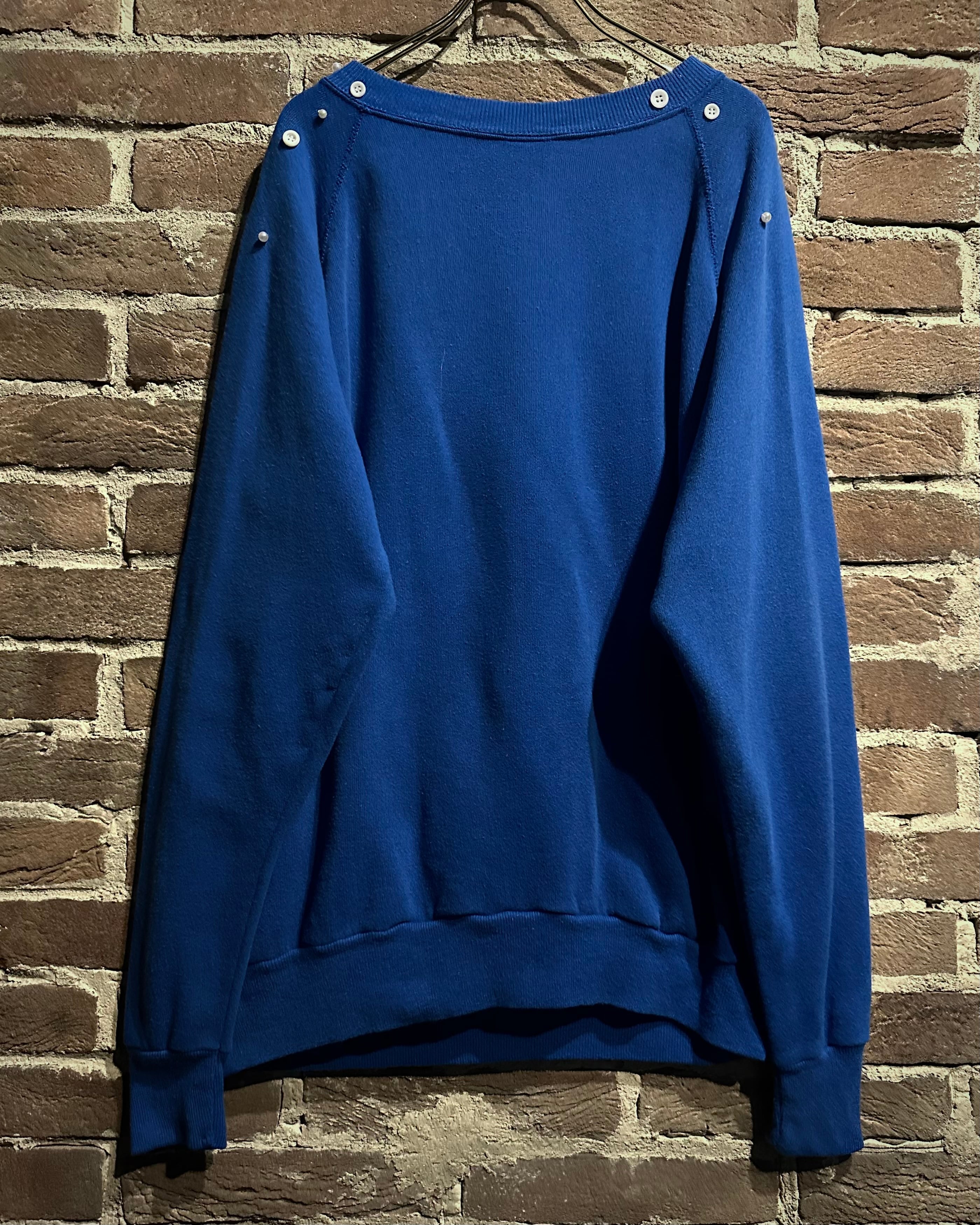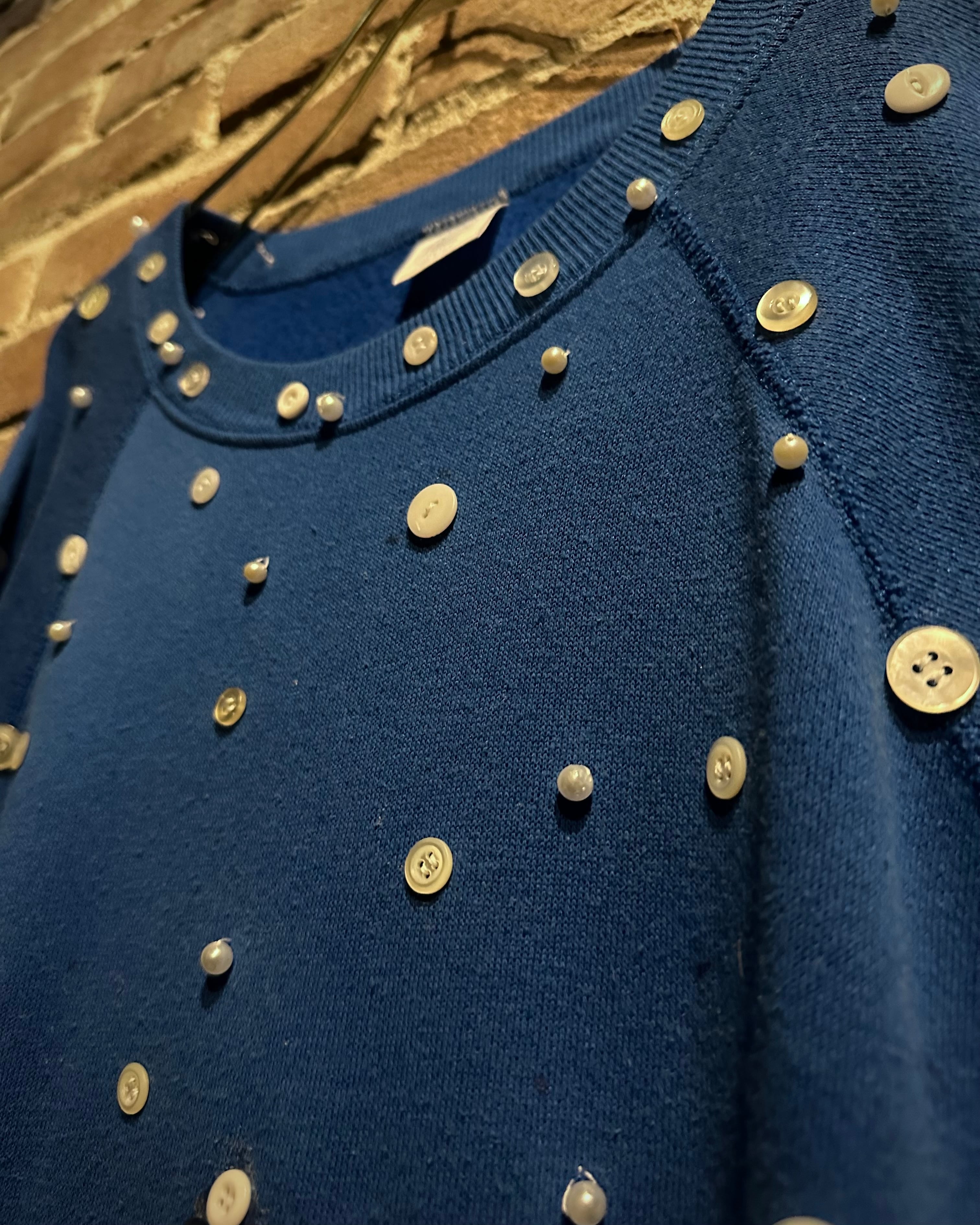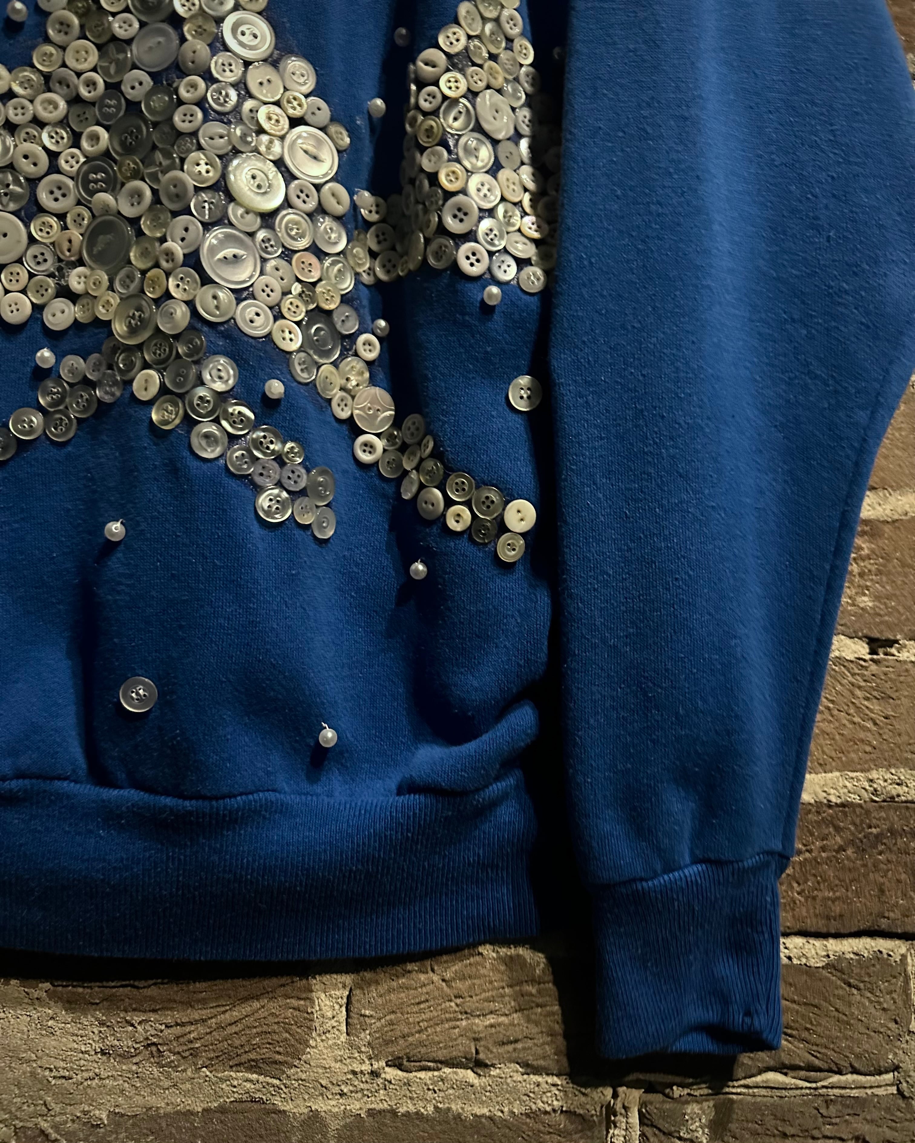 薄手のブルーのボディをベースに、いくつものボタンでアーティスティックなデザインが表現された、前所有者のカスタムモノのスウェットシャツ。