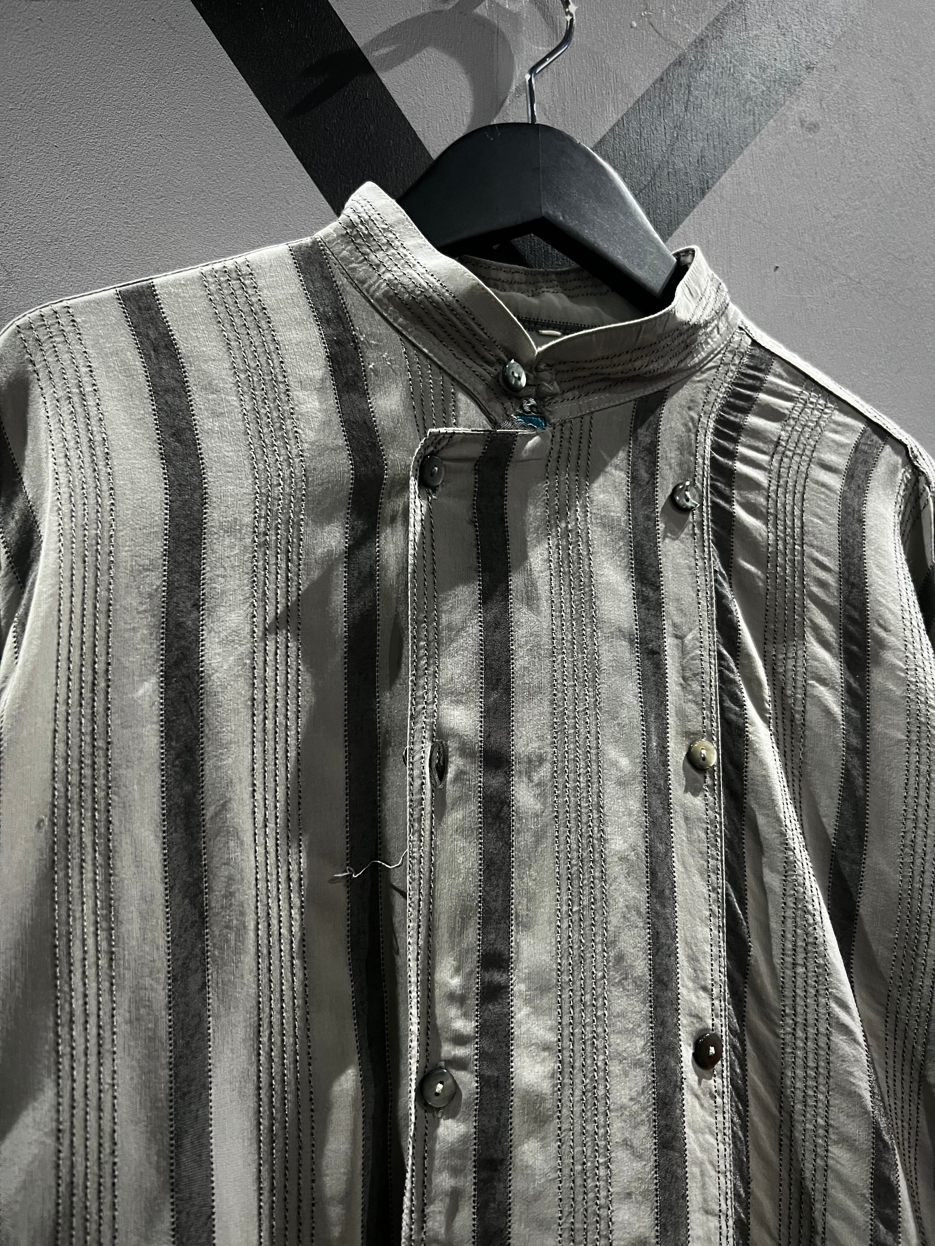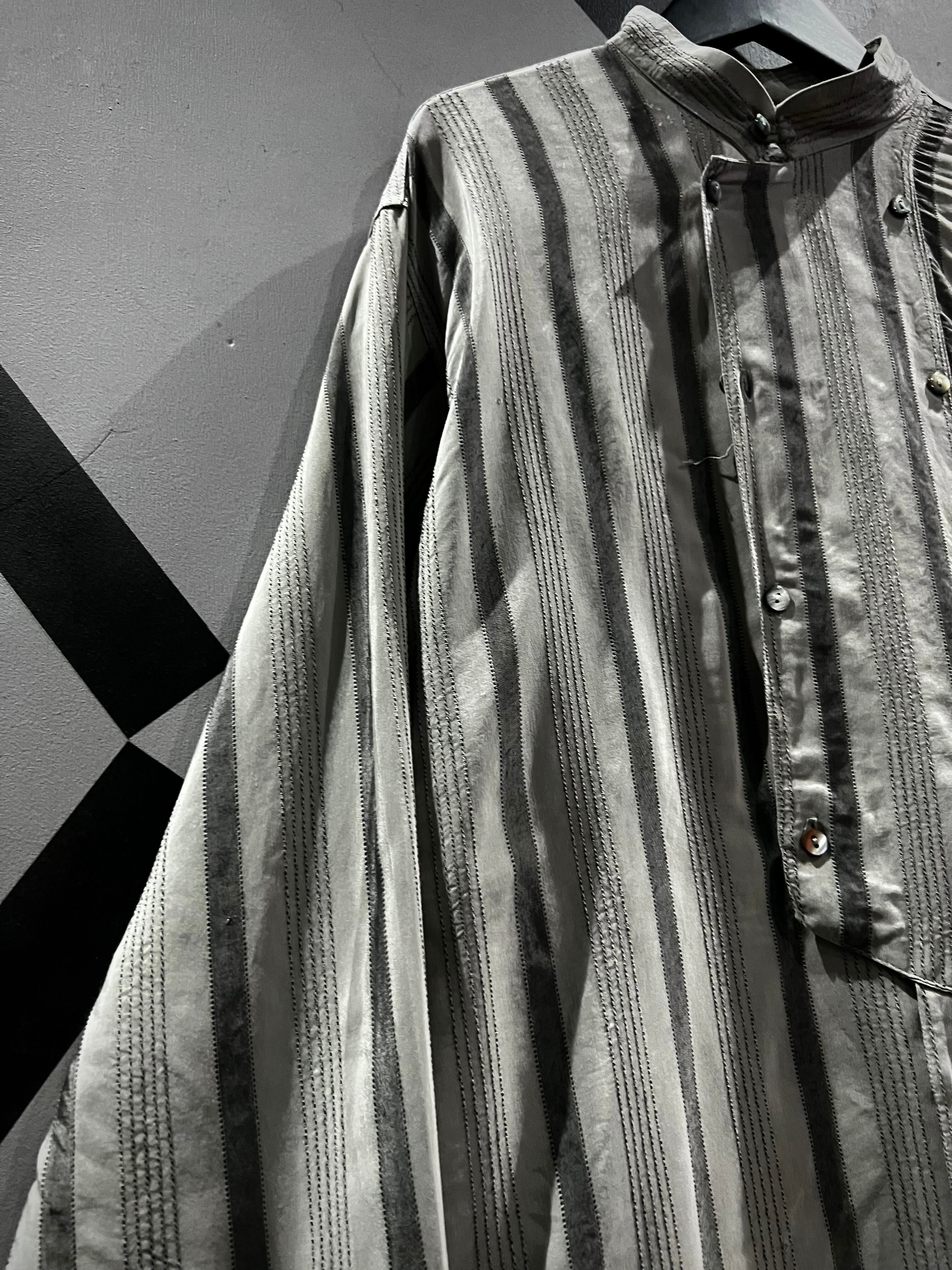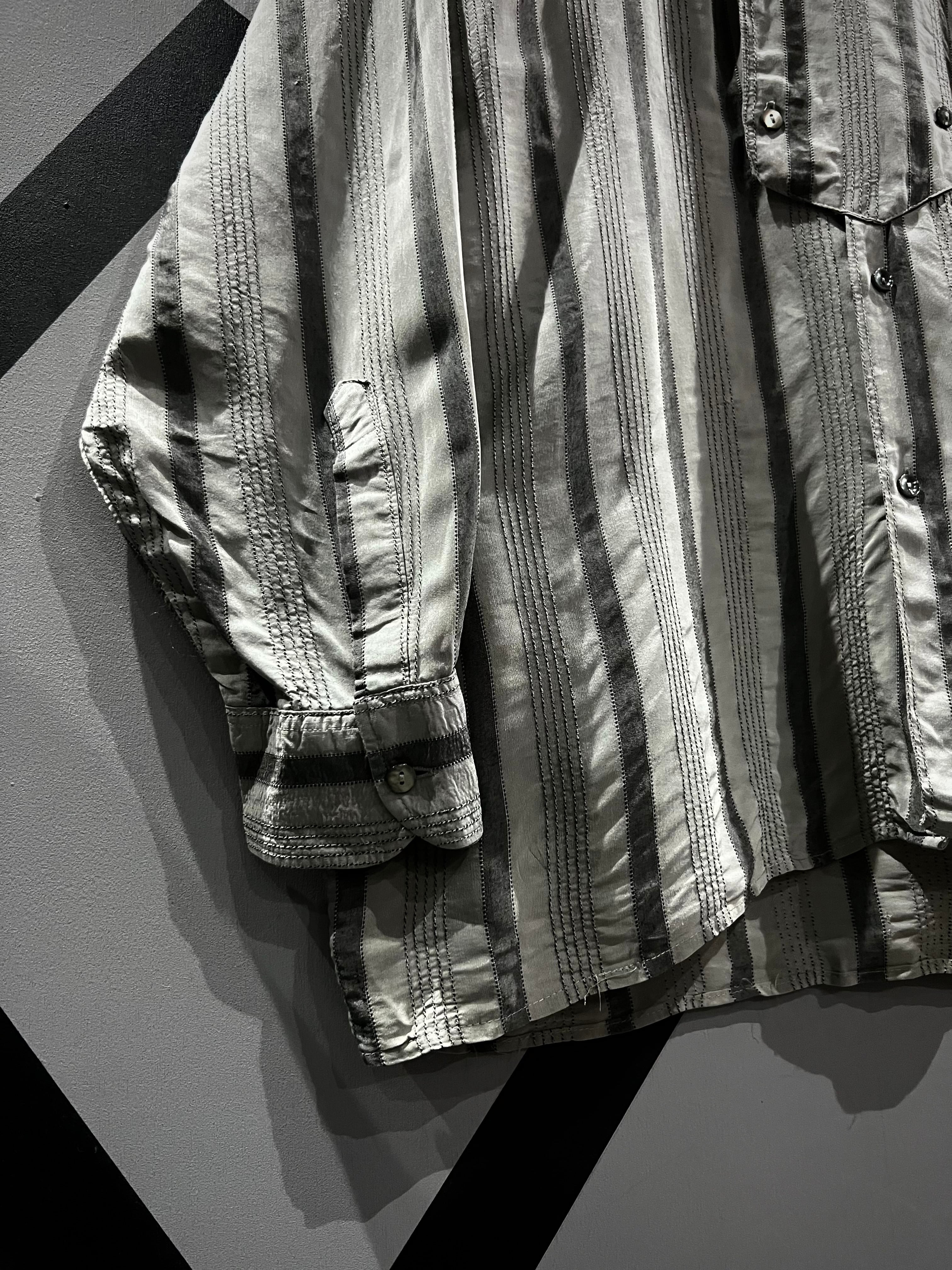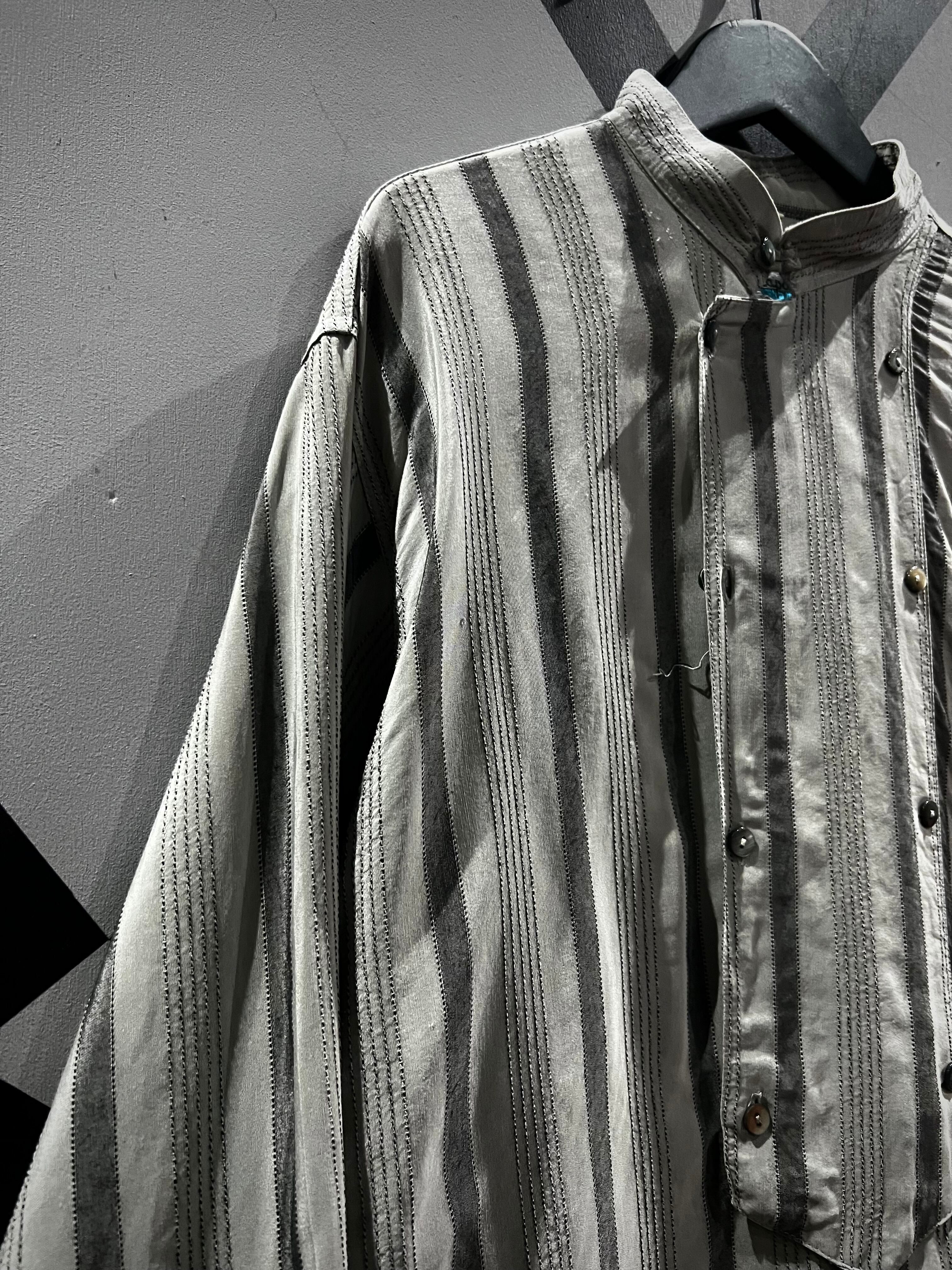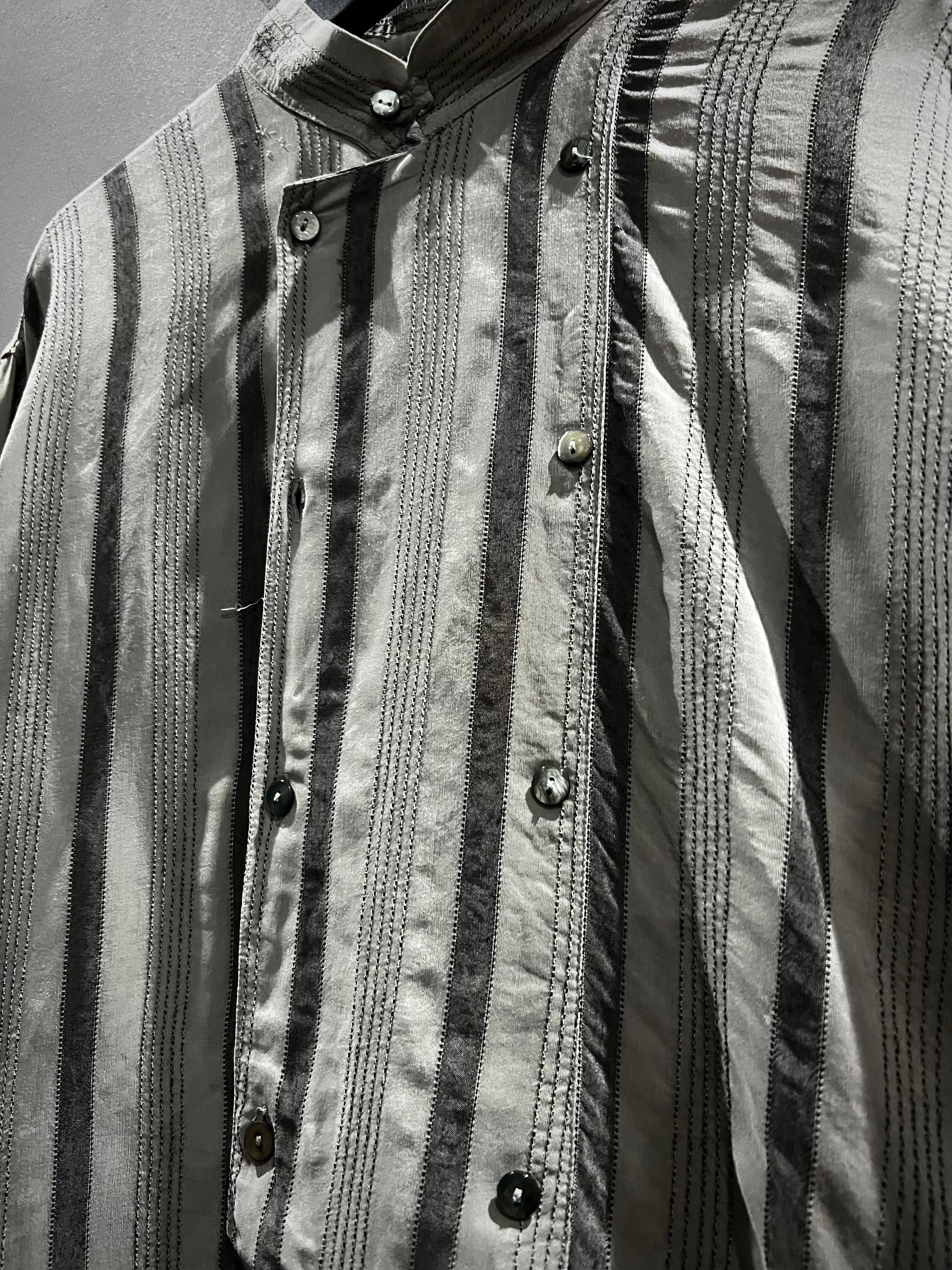 サラッと柔らかい素材をベースに、カラーの切り替えやステッチによってストライプ状のデザインを載せた長袖シャツ。カラーリングやステッチによってアイテムに奥行きを生み出してくれています。