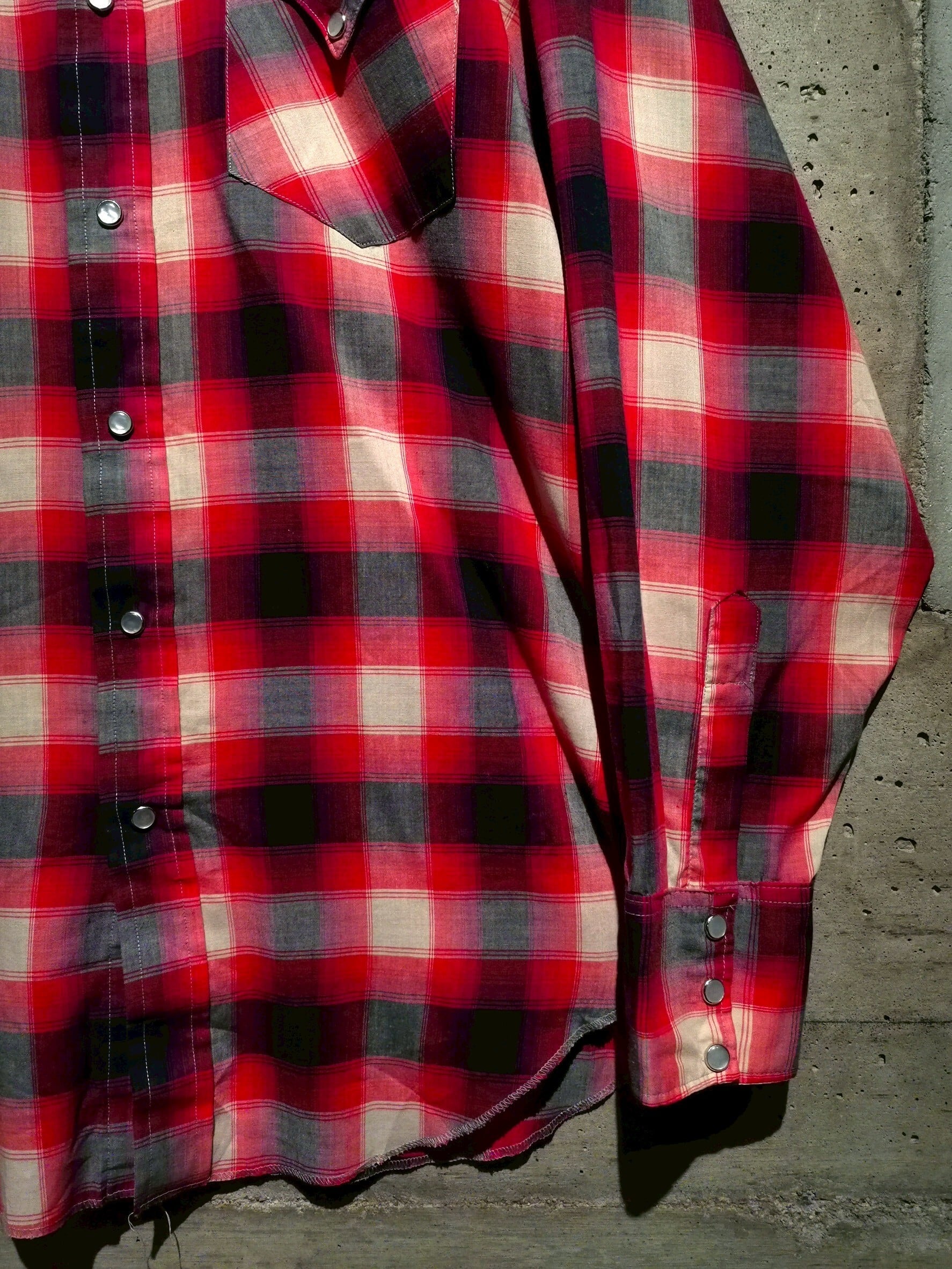 赤、黒、白のグラデーションがかった美しいオンブレチェックのウエスタンシャツ。