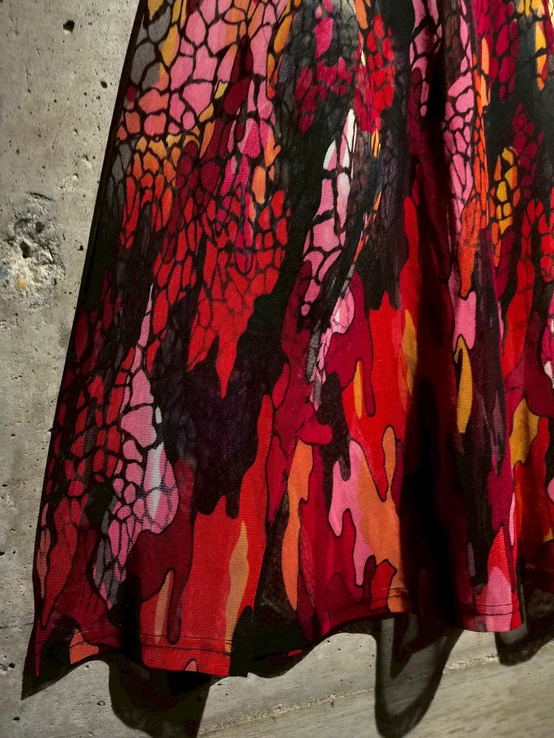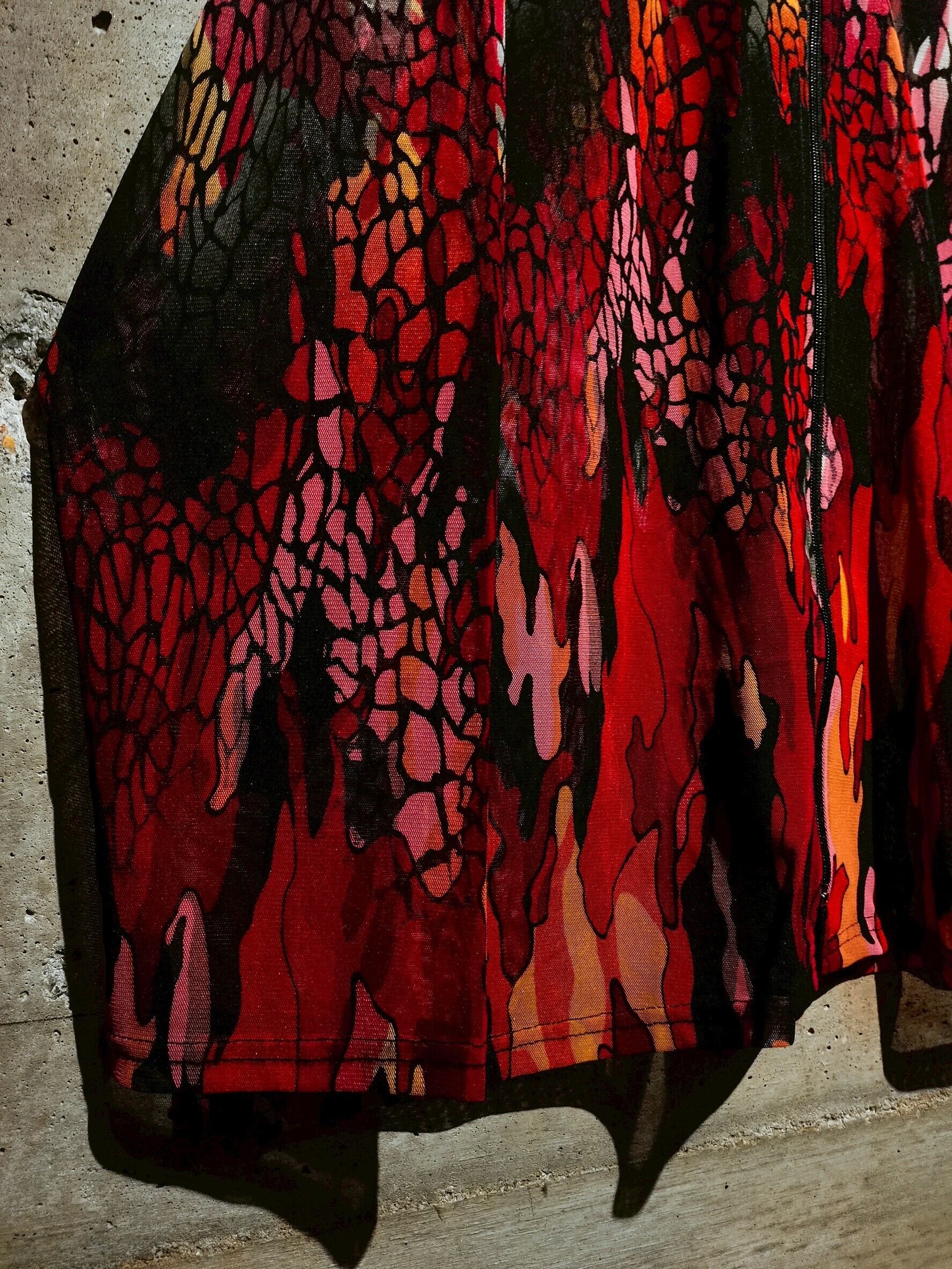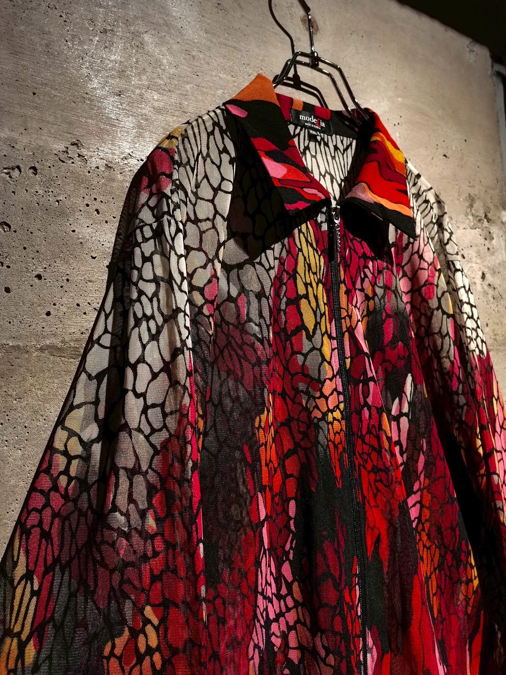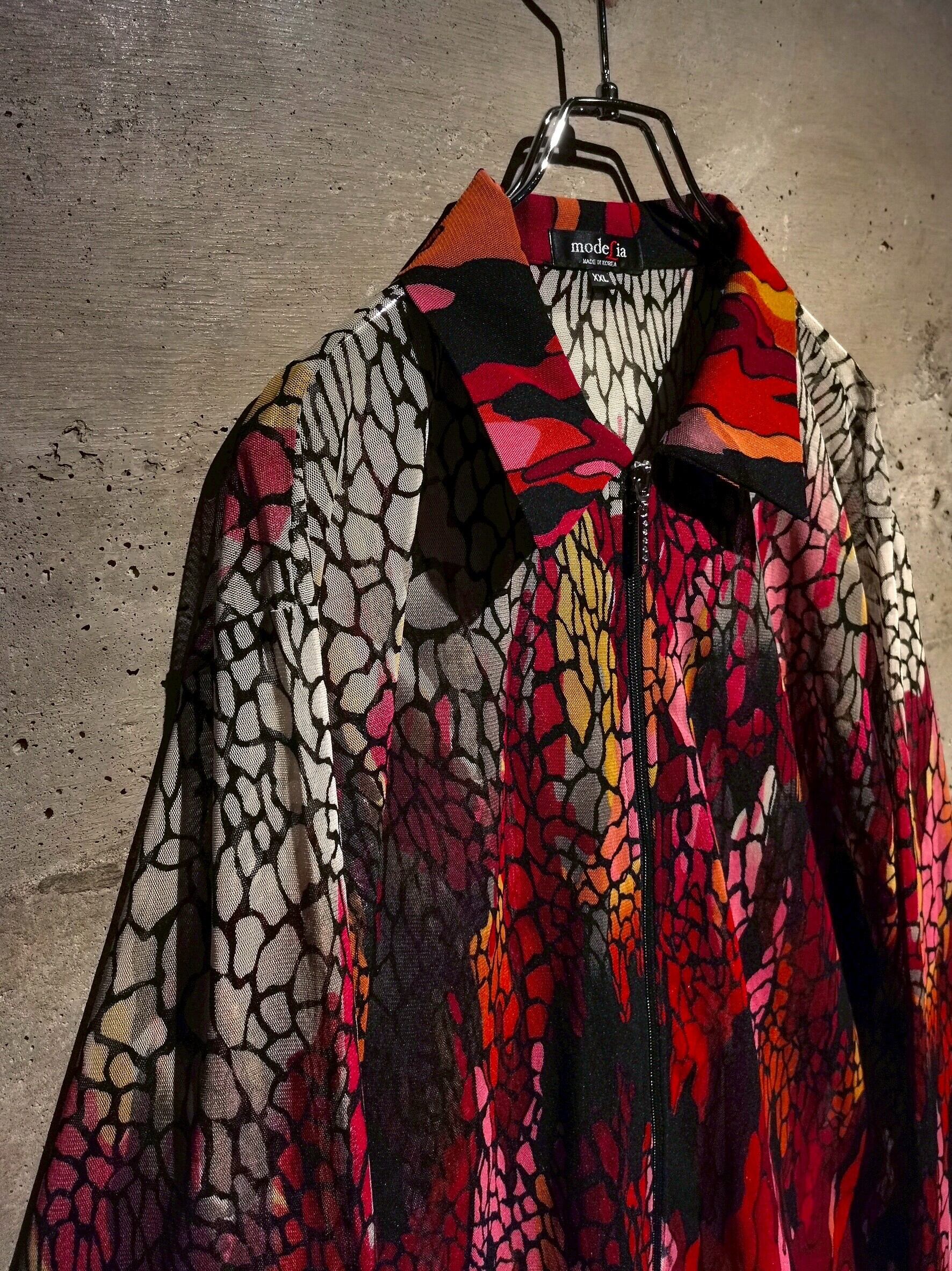 透け感の美しいシアー素材に、赤、オレンジ、黄、ピンクなど暖色をメインにアーティスティックな柄模様を載せたシアージャケット。
