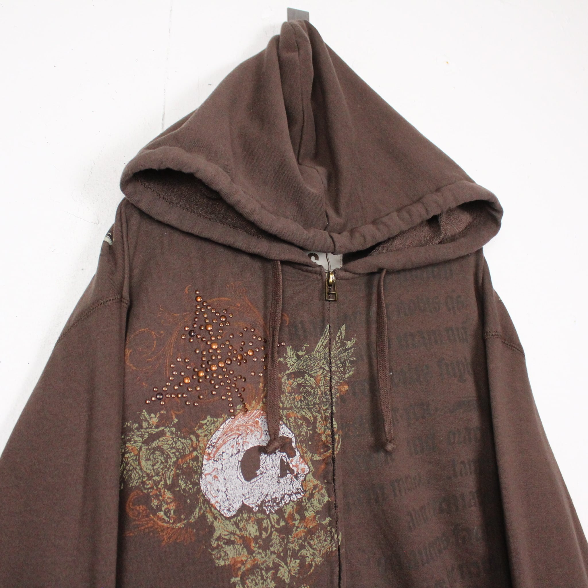 ブラウンスウェット地のボディに、ダークな雰囲気漂うスカルやレタリング載せ、ゴシックなデザインへと仕上げた1着。