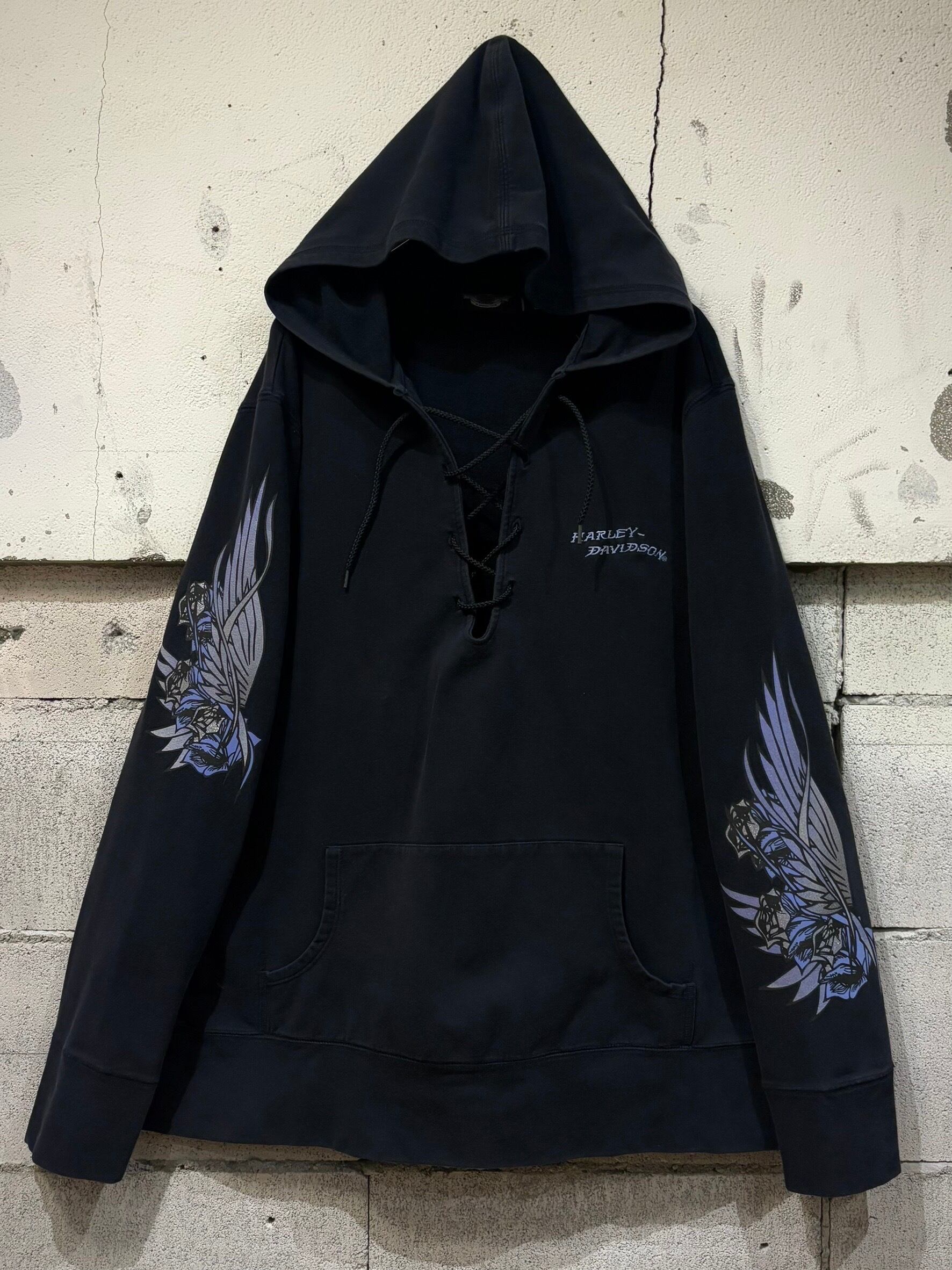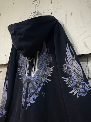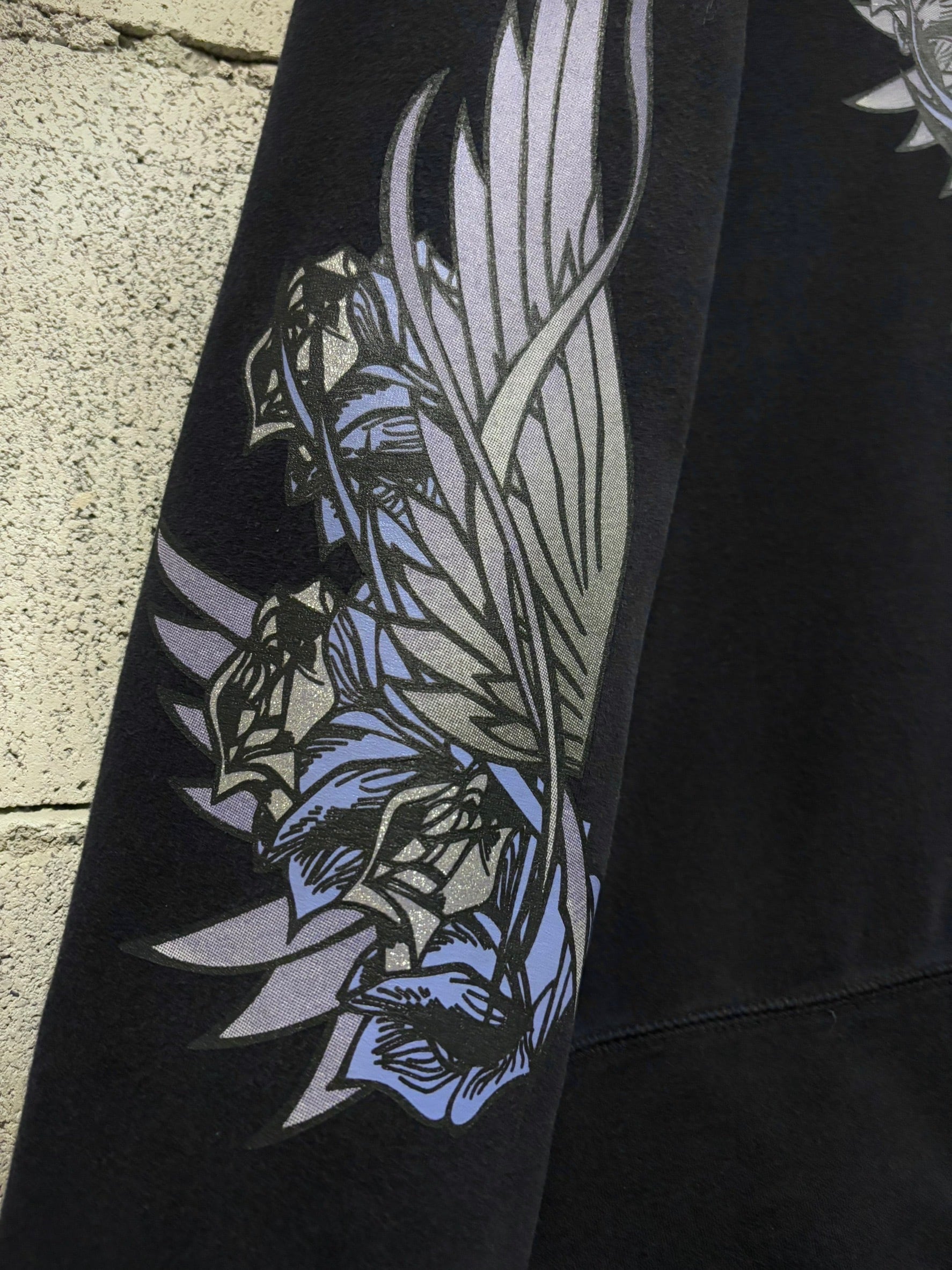 ネイビーのボディをベースに、翼、薔薇のプリントを載せた、アメトラ風のデザインが超イケてるスキッパープルオーバーフーディ。