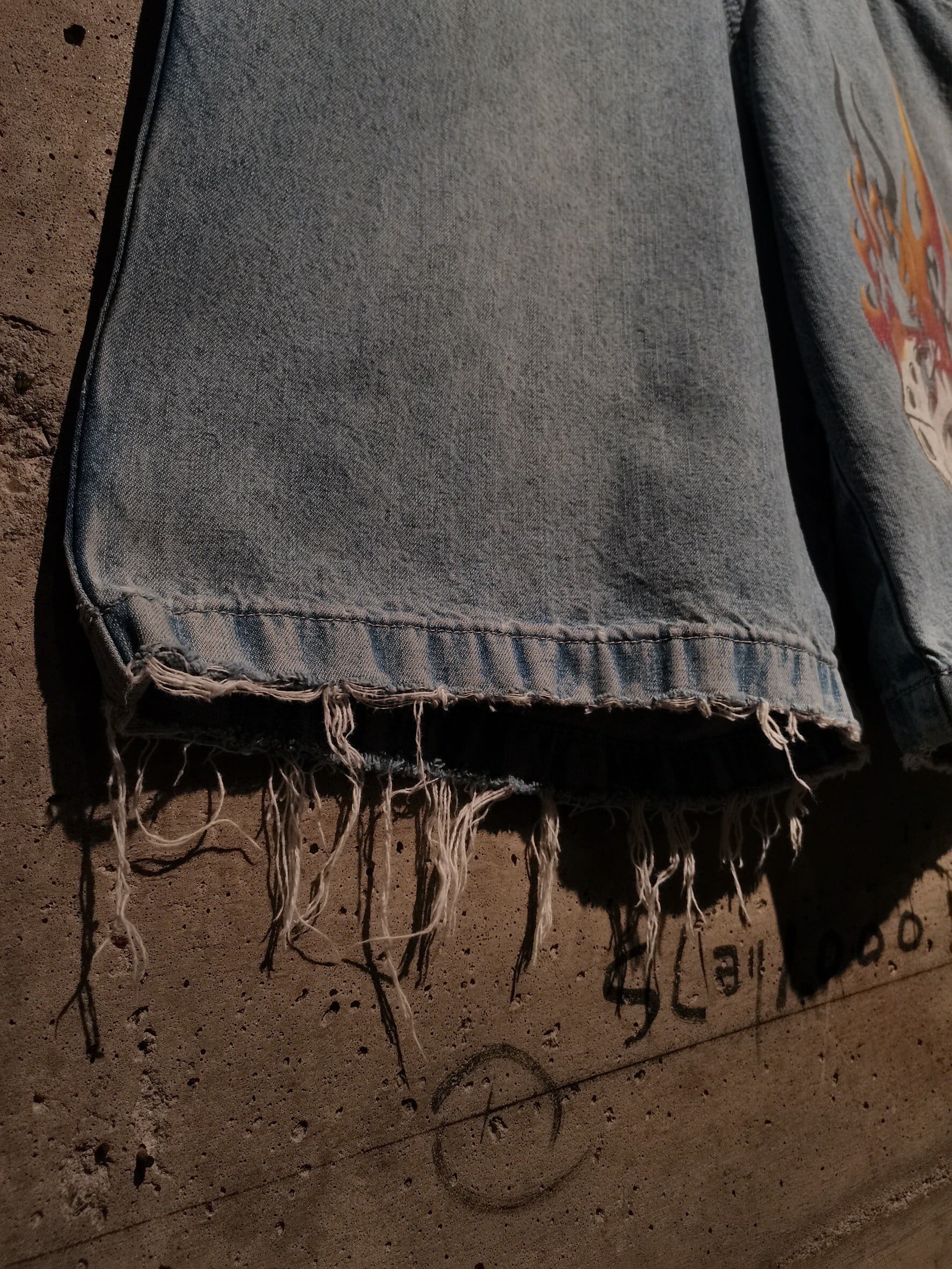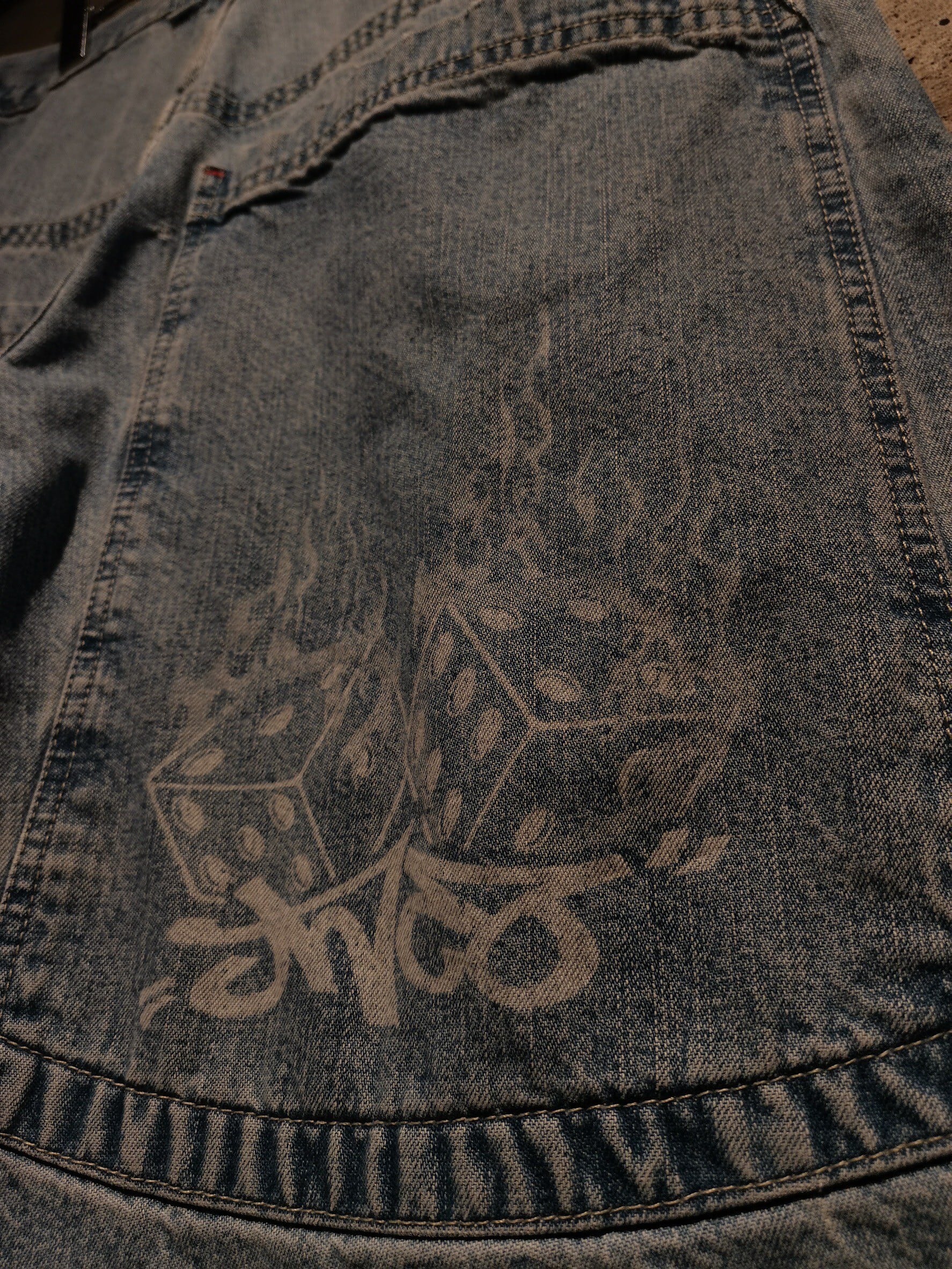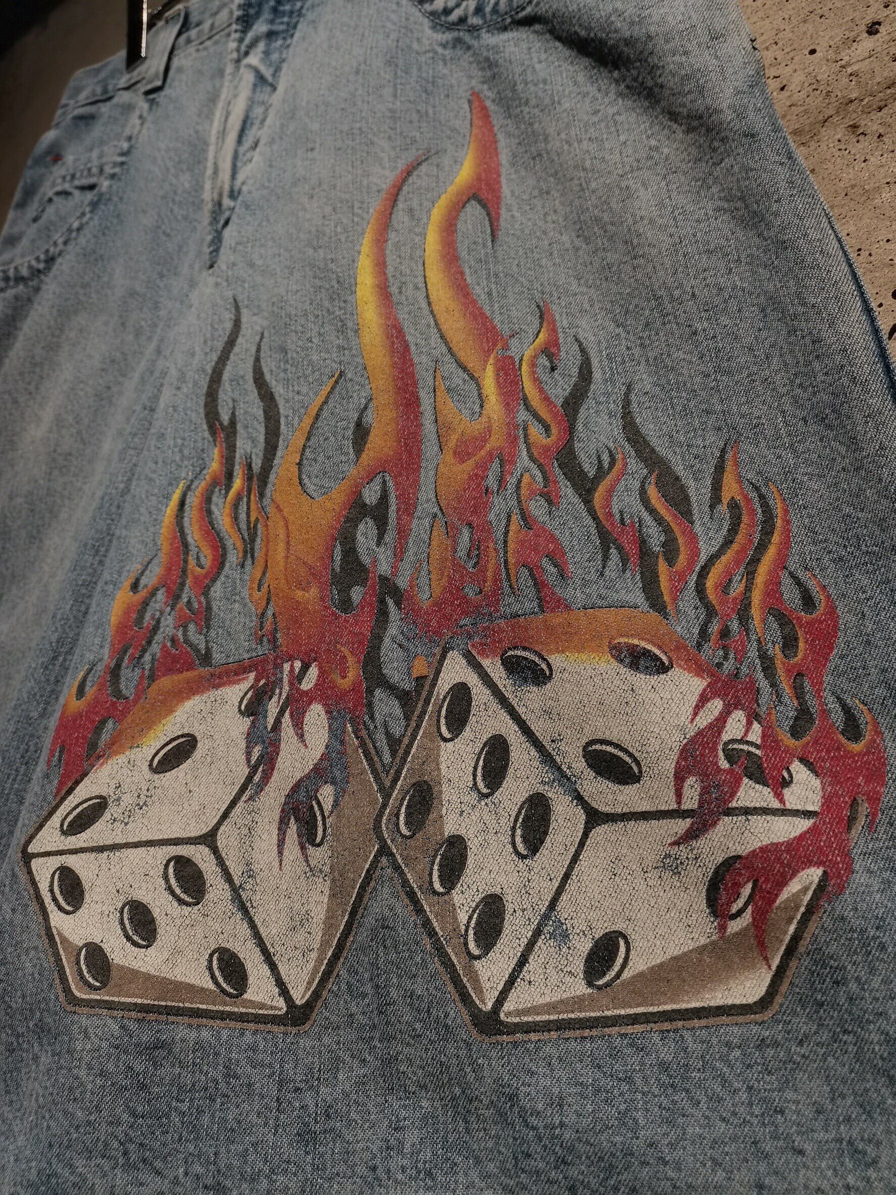 フェード、ダメージの効いたアイスブルーのインディゴデニムをボディに用い、炎を纏ったダイスのプリントを載せた1本。