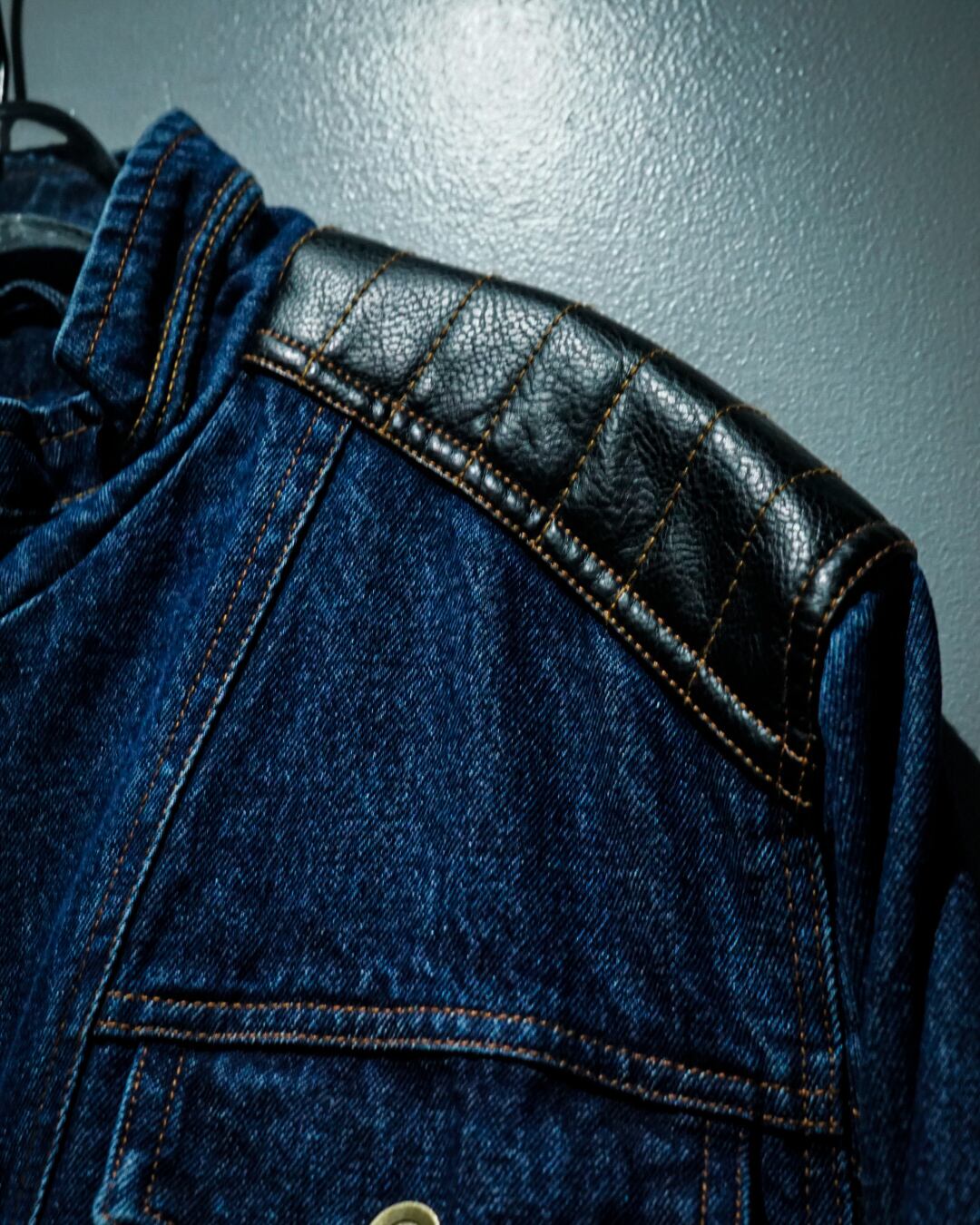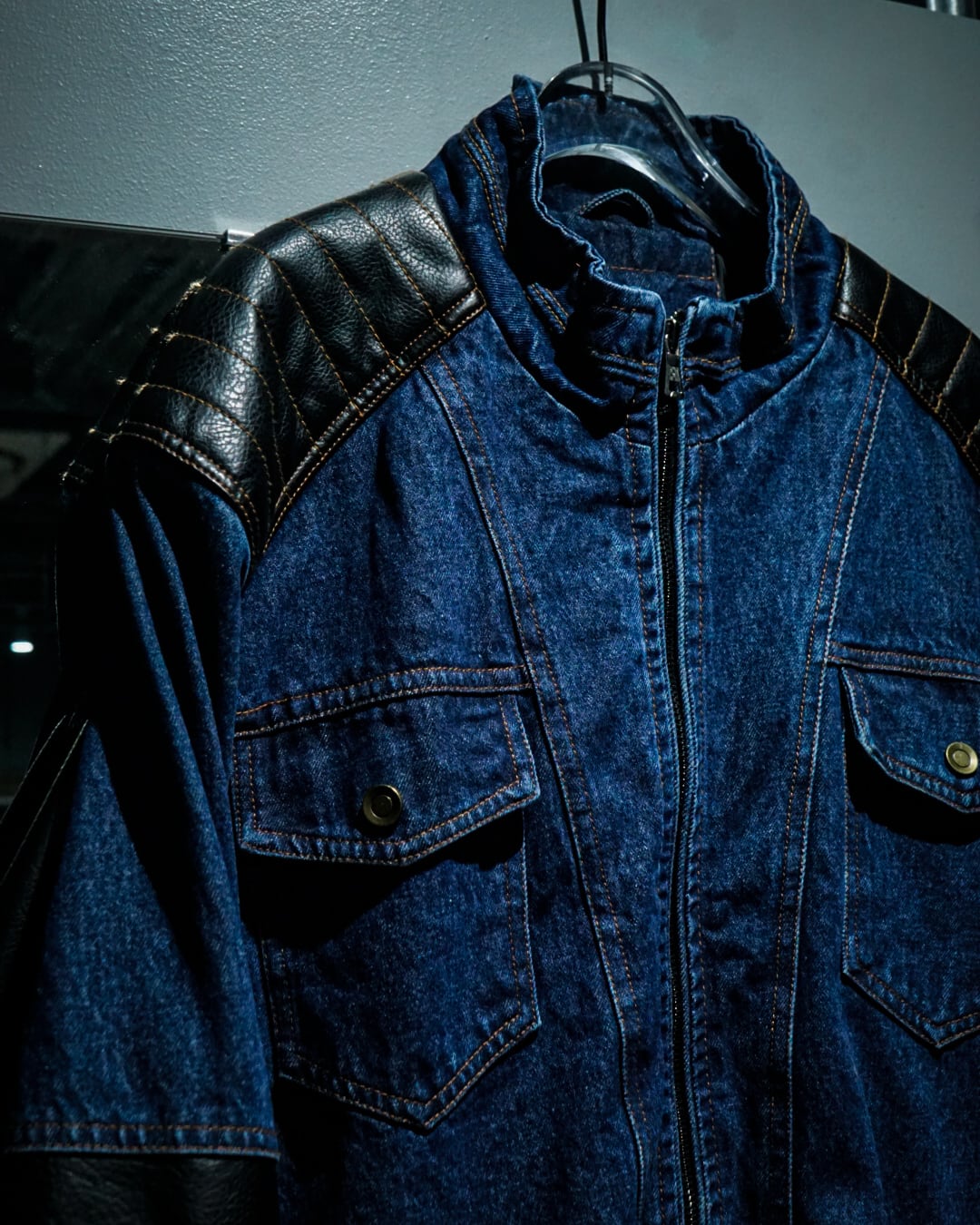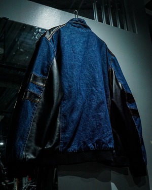 インディゴブルーのデニムをボディのベースとして用い、随所にブラックのフェイクレザーで切り替えを施したモーターサイクルデニムジャケット。