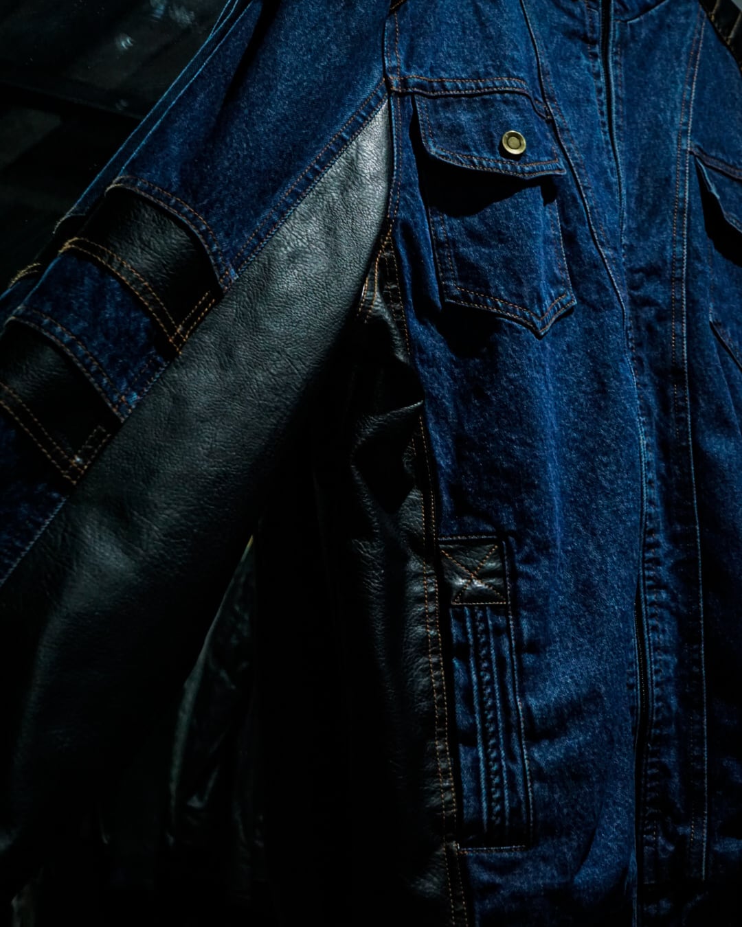 デニム×フェイクレザーによる異素材の掛け合わせに加え、ソリッドな切り替えがモードな雰囲気を演出した、秀逸なデザインバランスを誇る逸品。