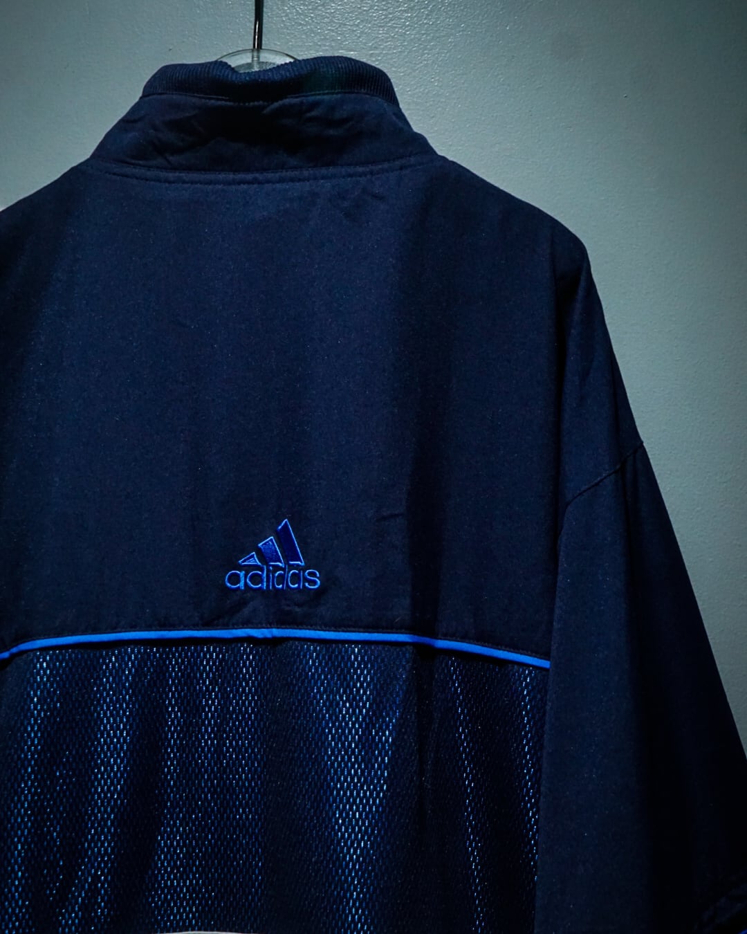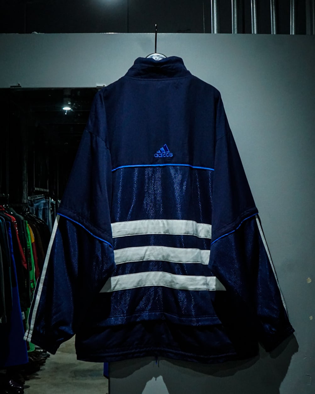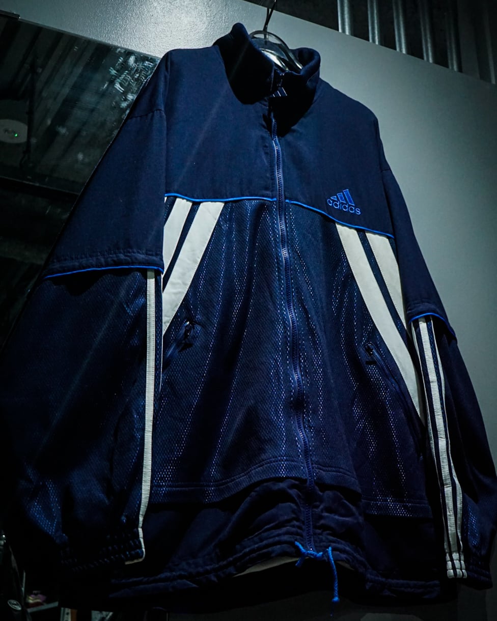 ネイビー×ブルー×ホワイトを基調に、サラッとした滑らかな質感のファブリック×メッシュ生地を切り替え、レイヤード風のデザインで仕上げた"90's adidas"のトラックジャケット。