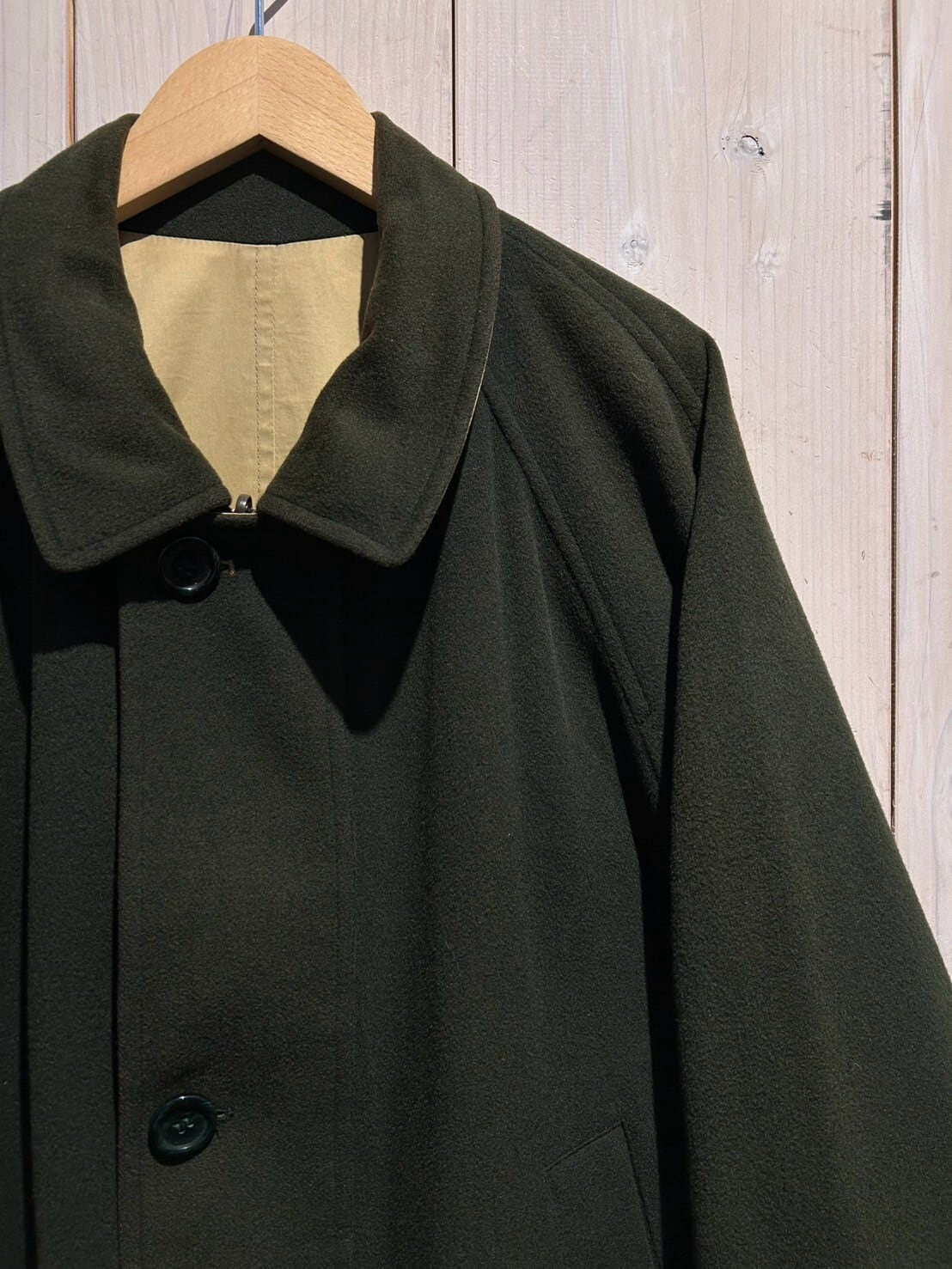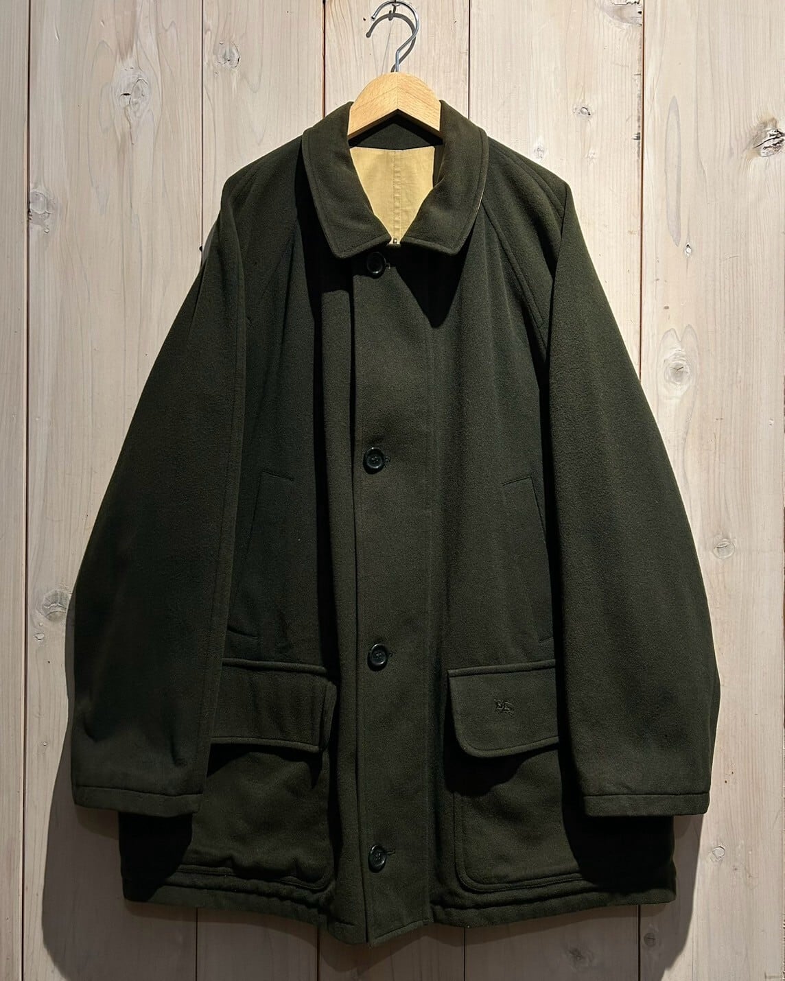 表面はカーキのウール地、ガバッと裏返すとツイル織りのボディへと早替わりする、稀有なリバーシブル仕様のカバーオールジャケット。