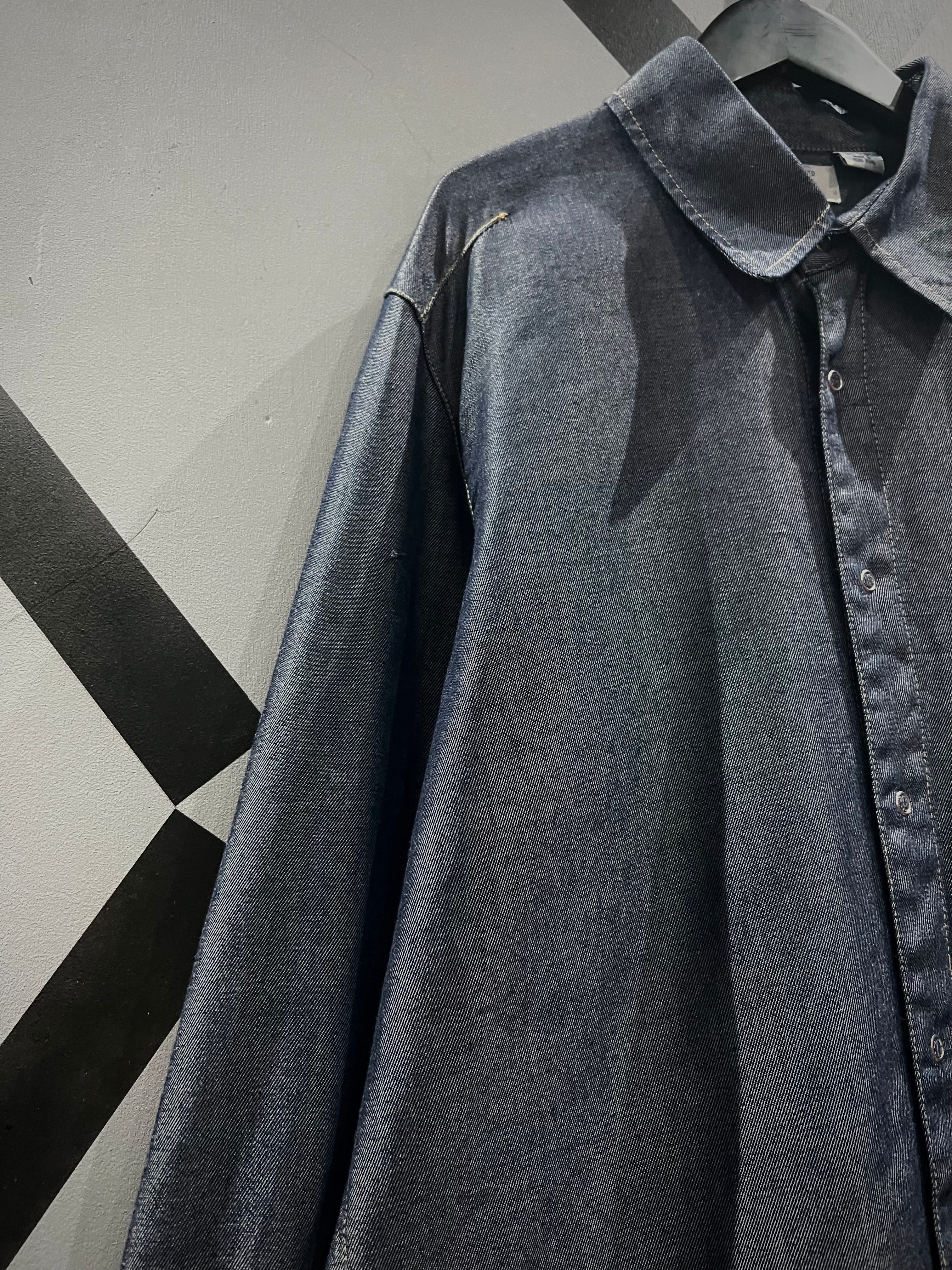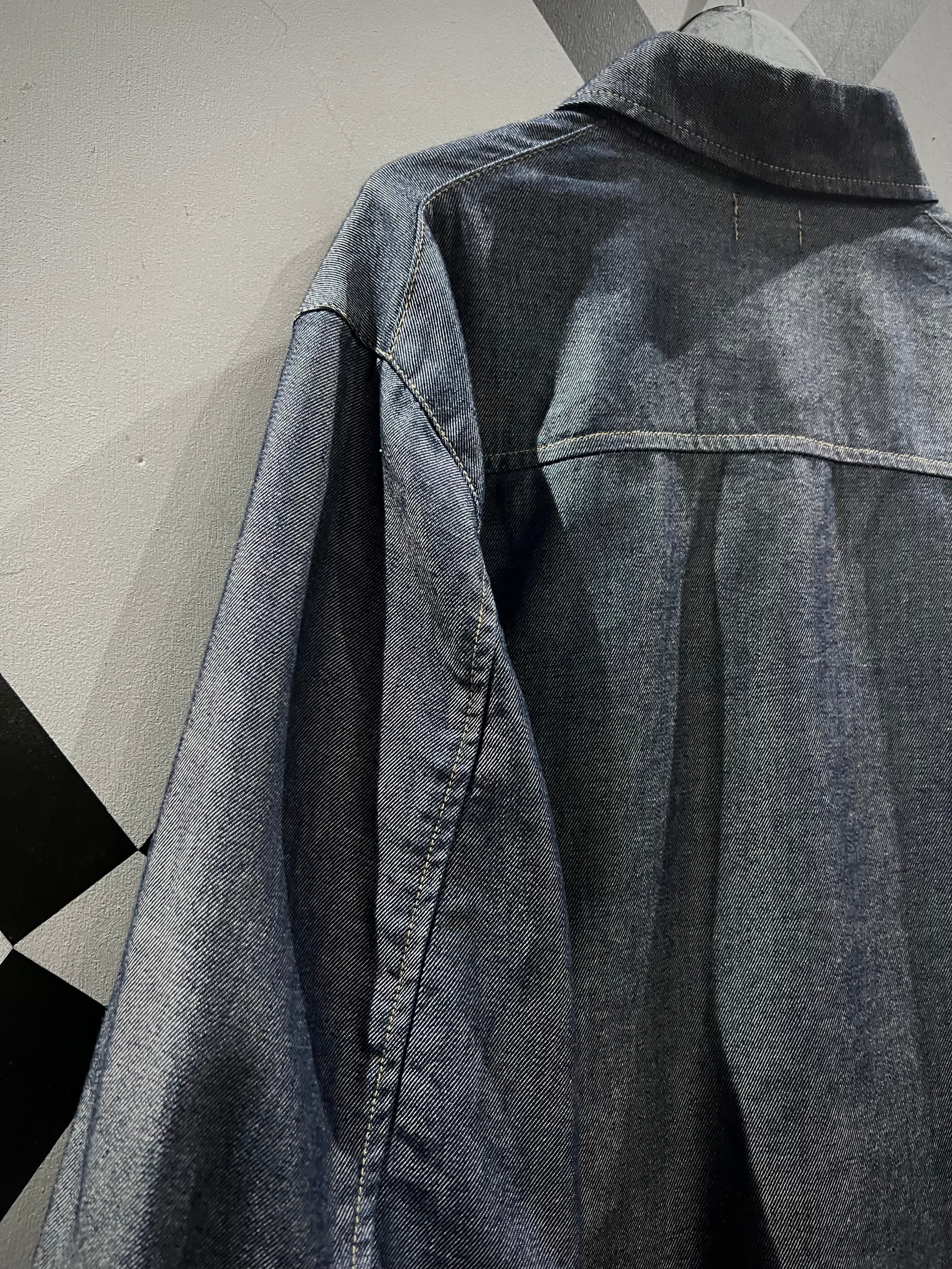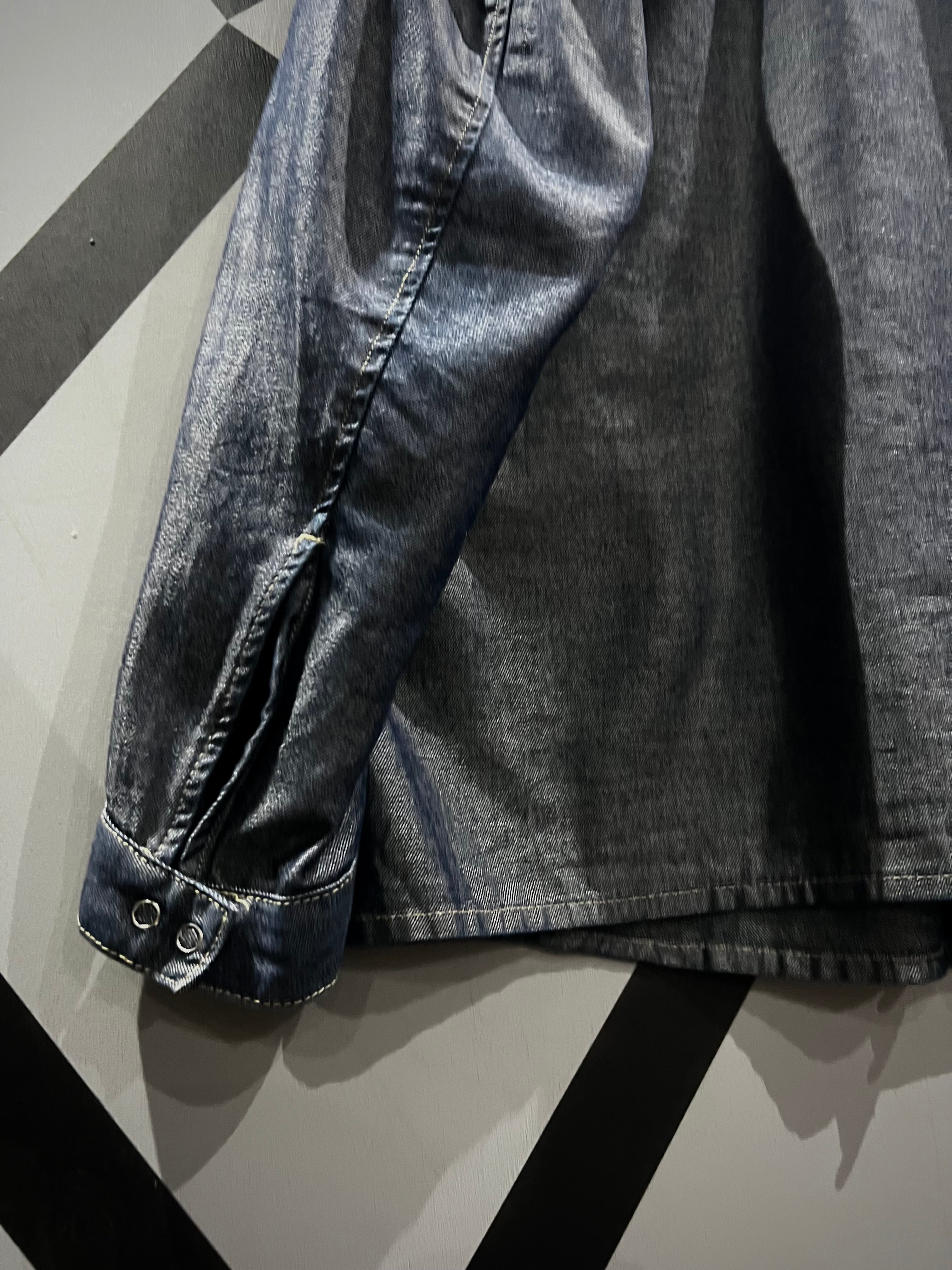 角度や光の当たりによって見え方を変える、メタリックな光沢を帯びたデニムをボディに用いた1着。