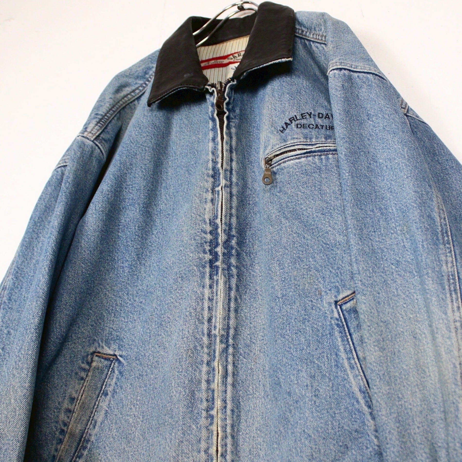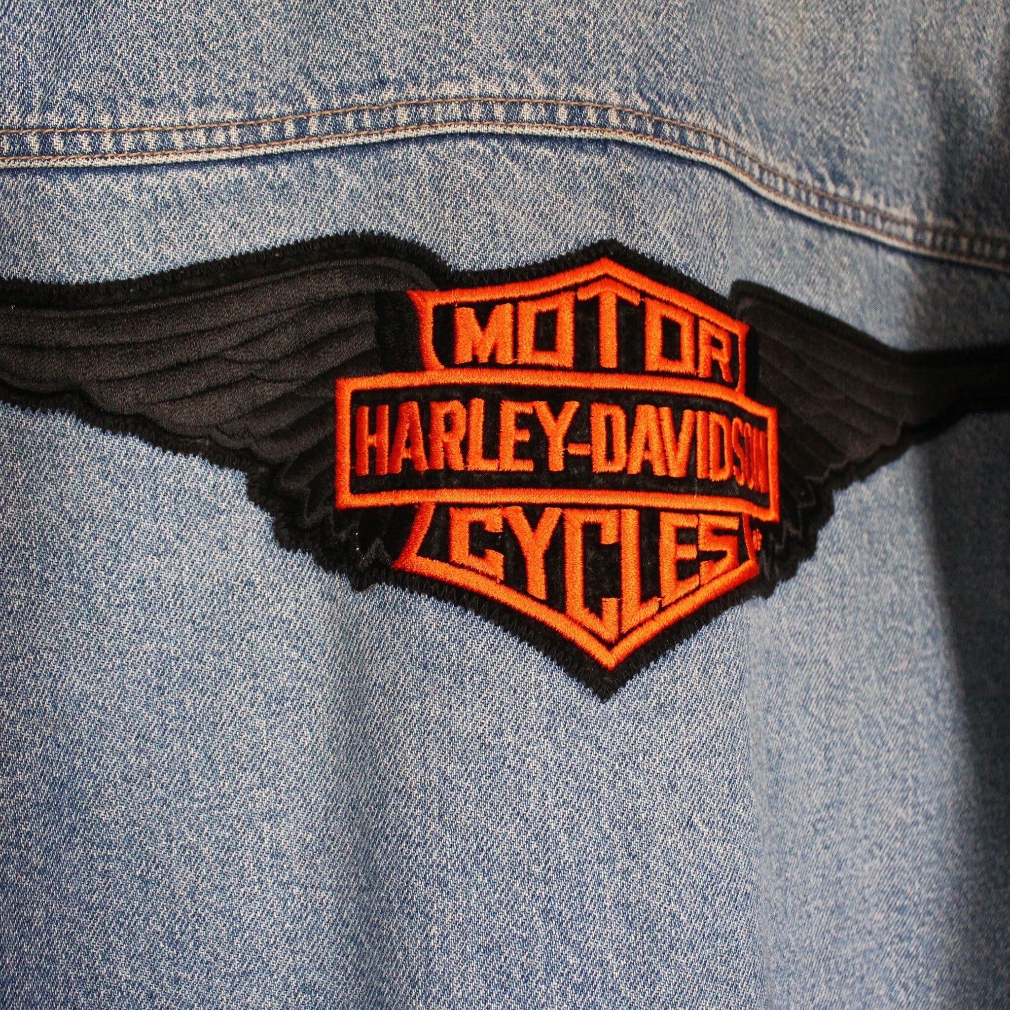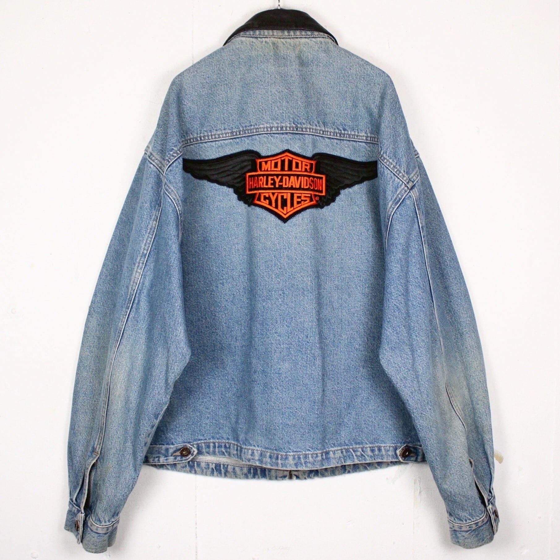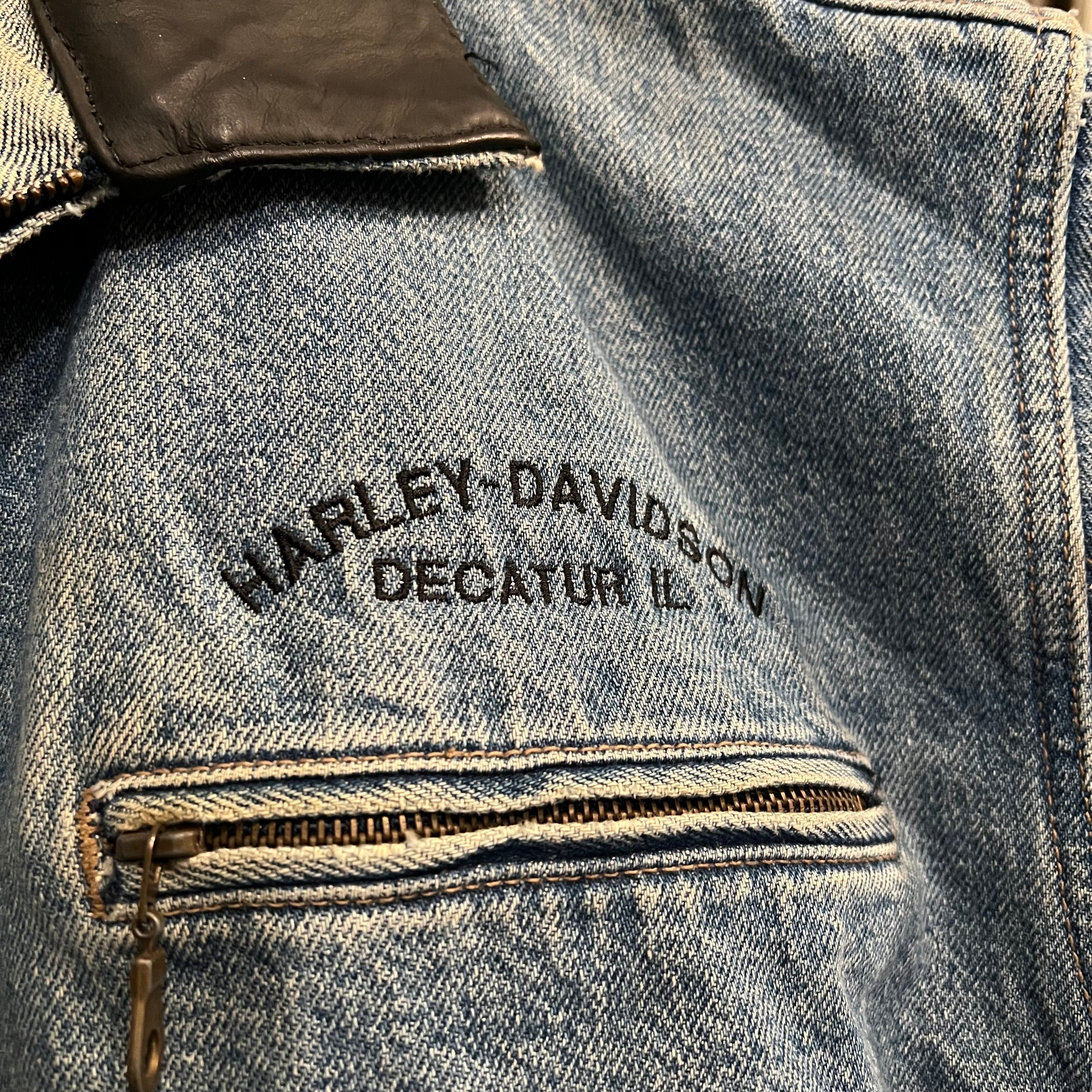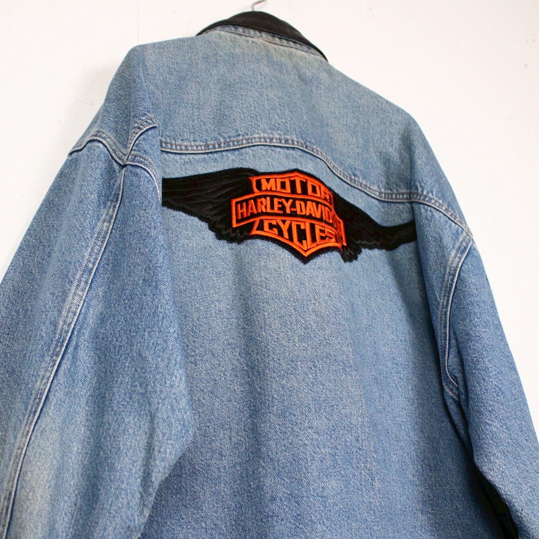 経年変化による美しい表情が現れたライトブルーのインディゴデニムをボディに用い、左胸、背面にそれぞれ"HARLEY DAVIDSON"の刺繍とパッチによるカスタムが施されたデニムジャケット。