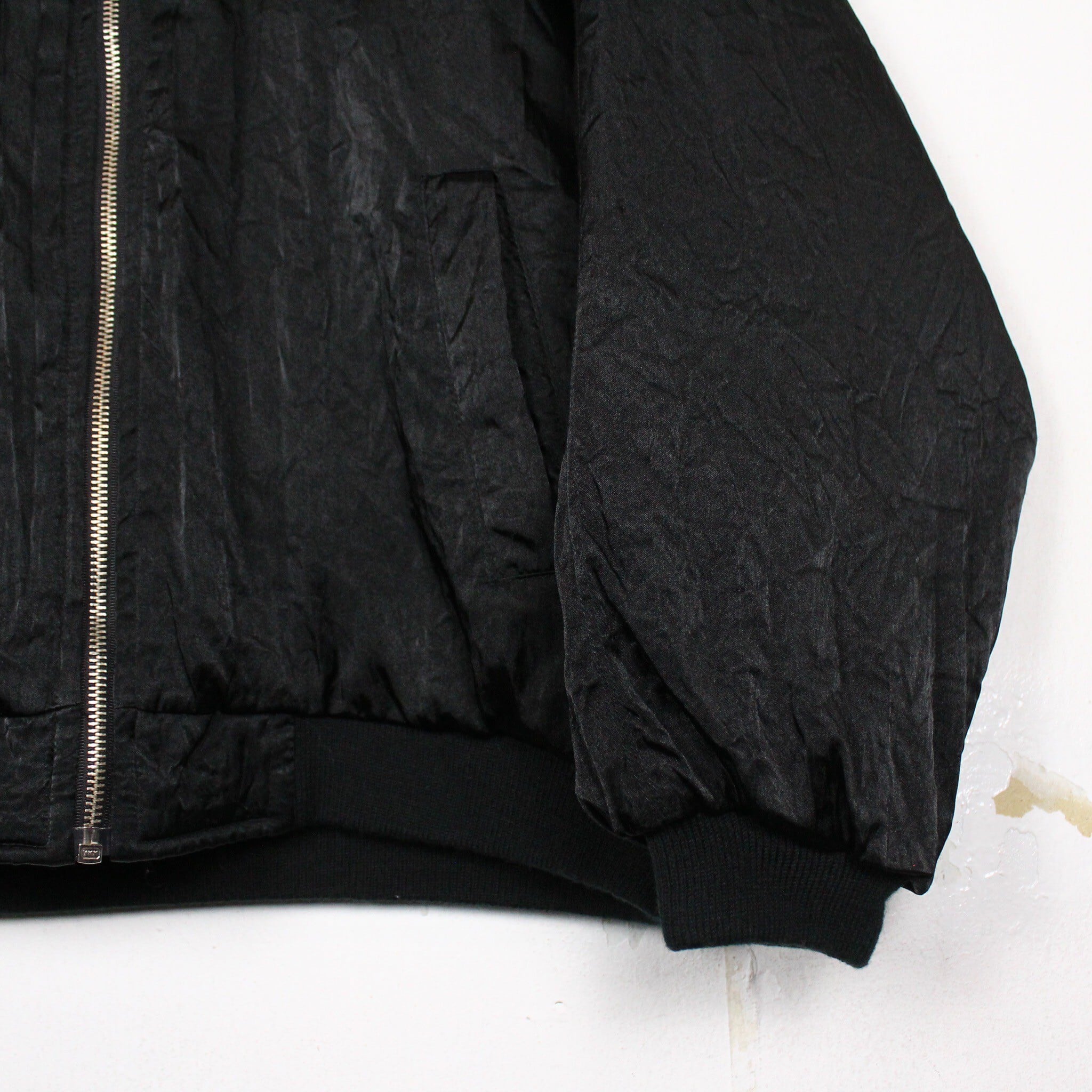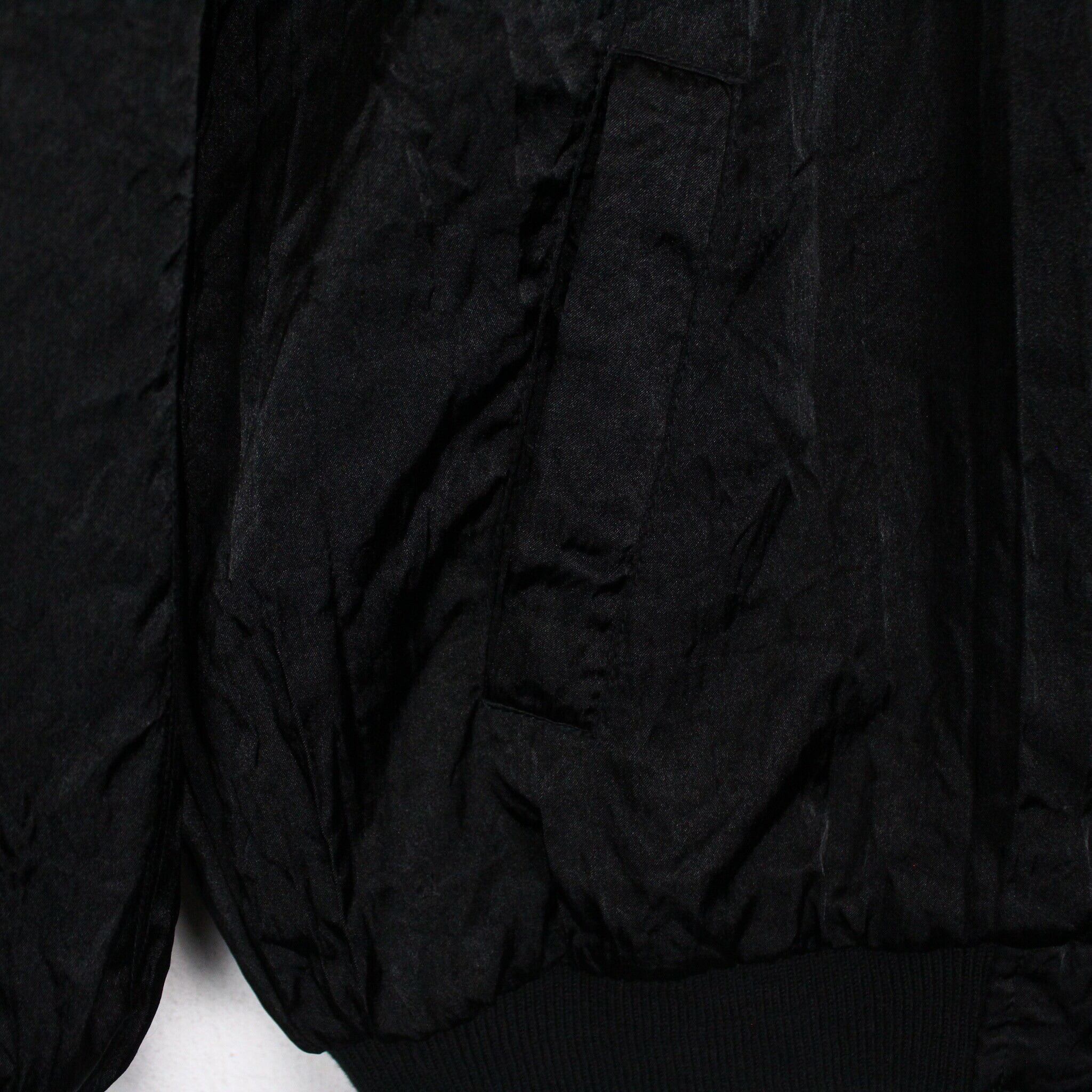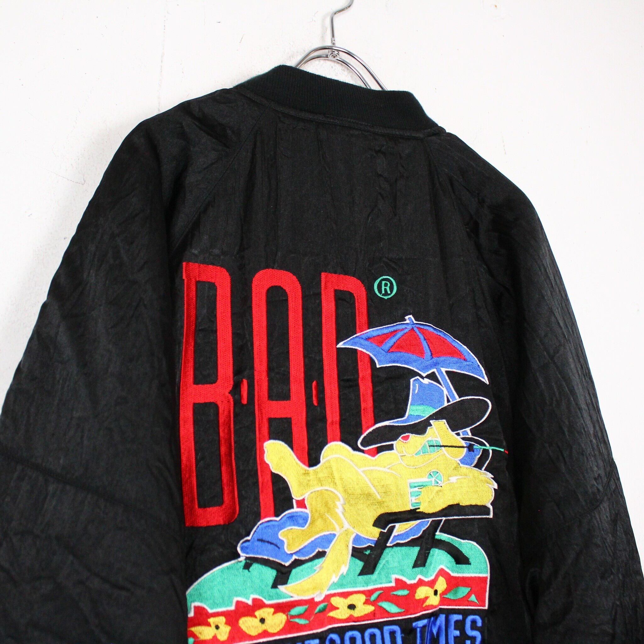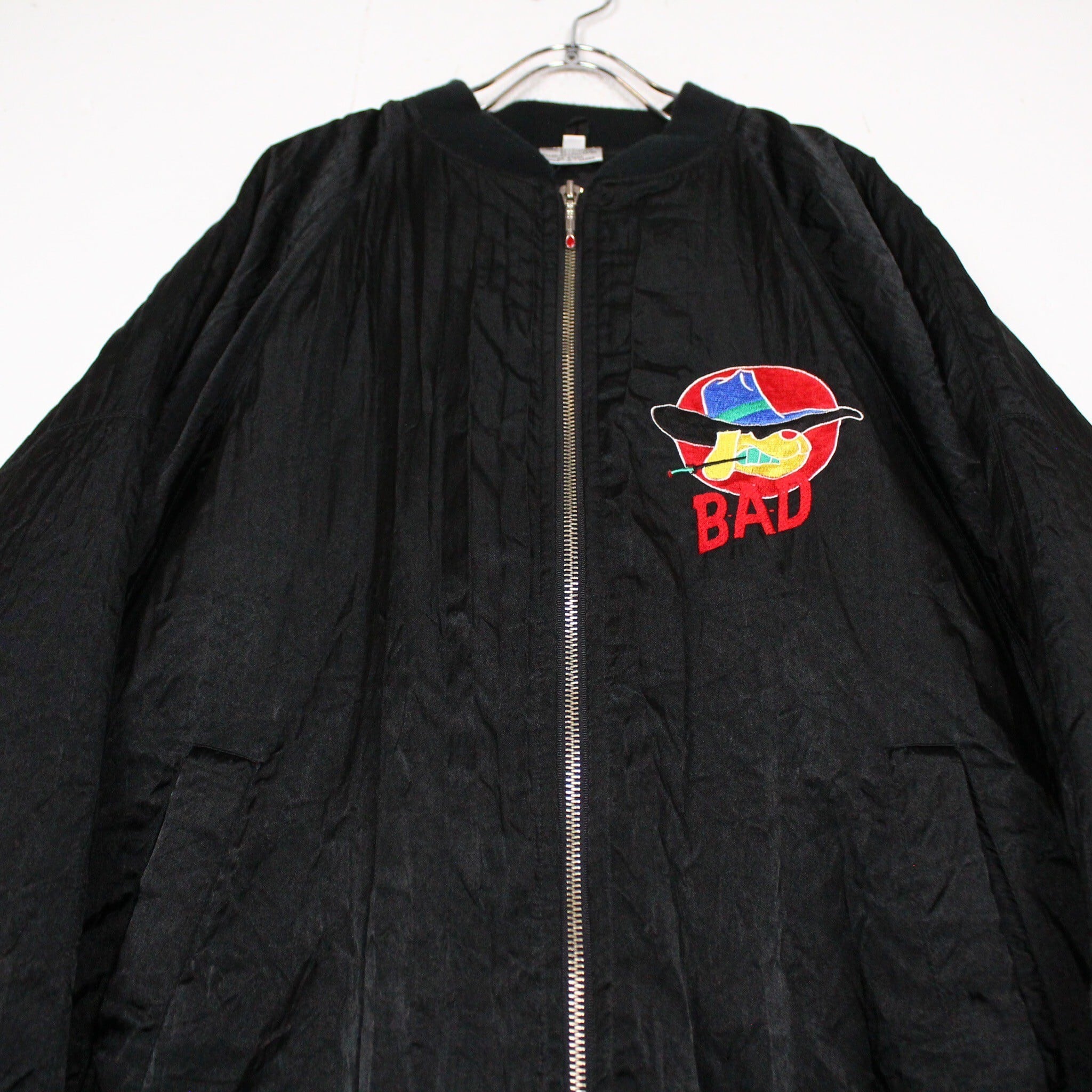艶やかな光沢を帯びたブラックナイロンをボディに用い、"BAD"の文字と共にワルな装いの犬の刺繍が刻み込まれたボンバージャケット。