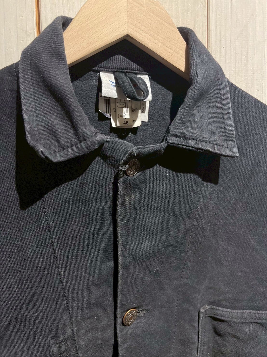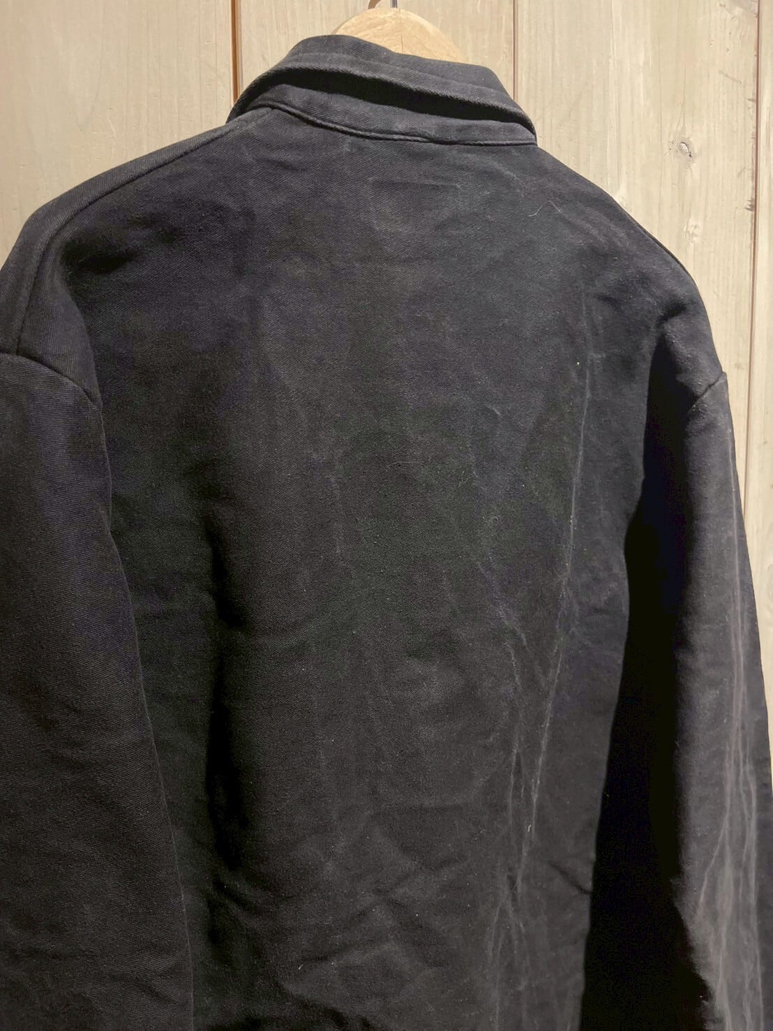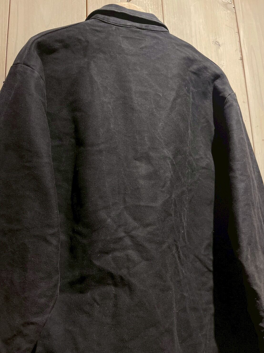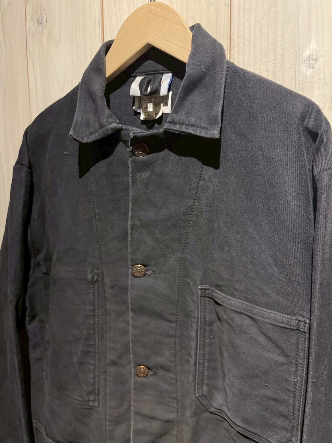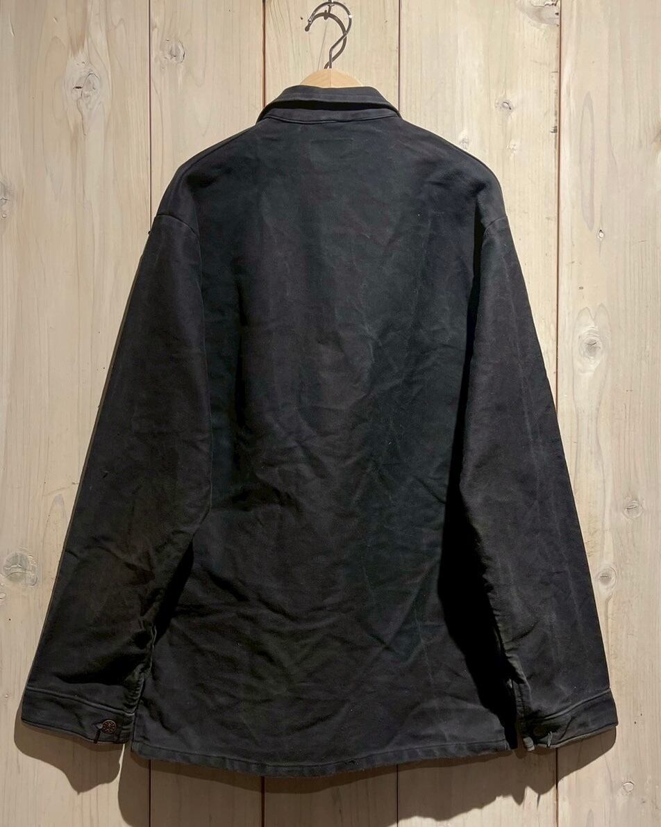 ユーロワークの中でも珍しい黒色のボディ、フロントはボタンダウン、ボディにはポケットを配置し全体的にミニマルなデザイン。だからこそボロの風合いやフェードの配色など、この1着の良さが際立つ仕上がりに。