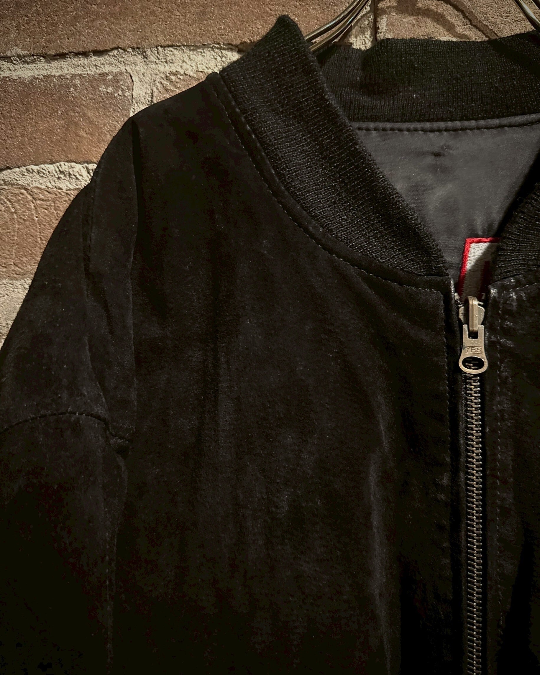 A面はしっとりと柔らかなスエードレザーを採用。フロント、バックにはスムースレザーのワッペンで頭文字、ロゴを載せた贅沢な1着。レザーならではのスレ感や味など、経年変化を楽しめるのも嬉しいポイントで着用していくに連れて体に馴染んでいきます。