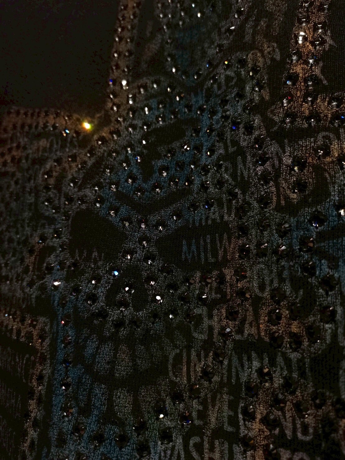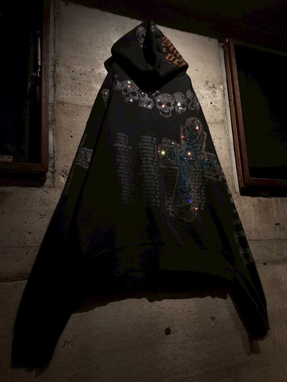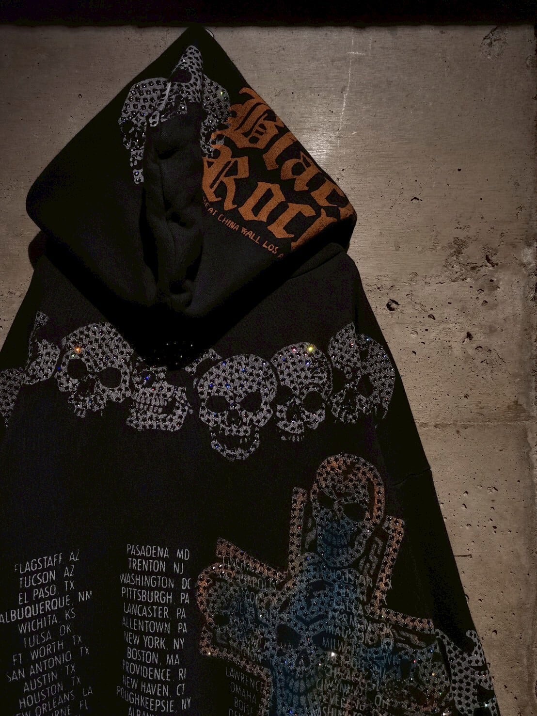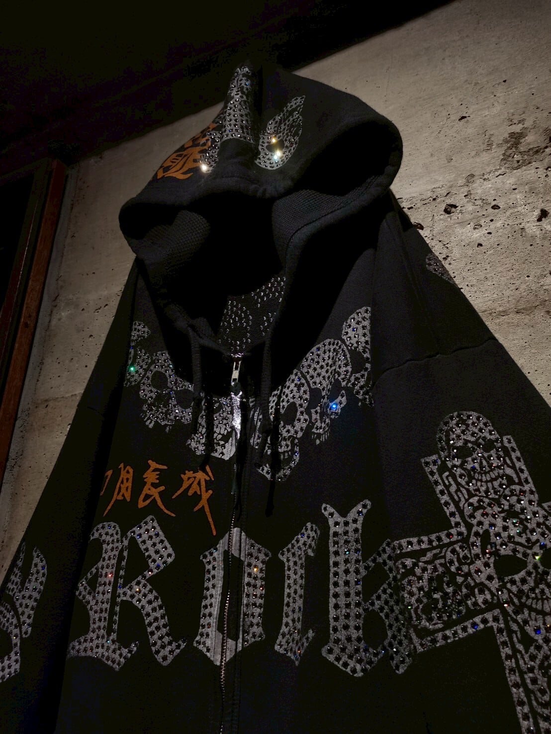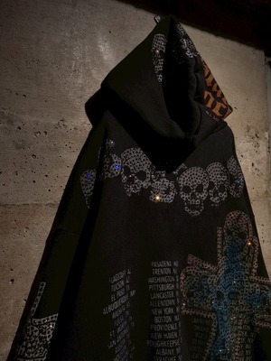 ブラックのスウェットボディに、プリントと数多のラインストーンによってスカルやクロス、ROCKの文字等を全面に配した、唯一無二なデザイン性を持ったスペシャルな1着。