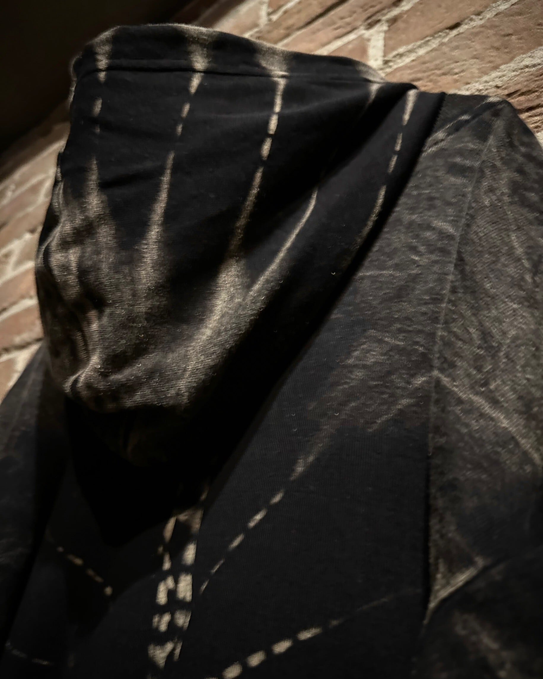 風合い豊かな染めを施したフェードブラックのボディをベースに、アーティスティックな花のパッチを載せたジップアップフーディ。