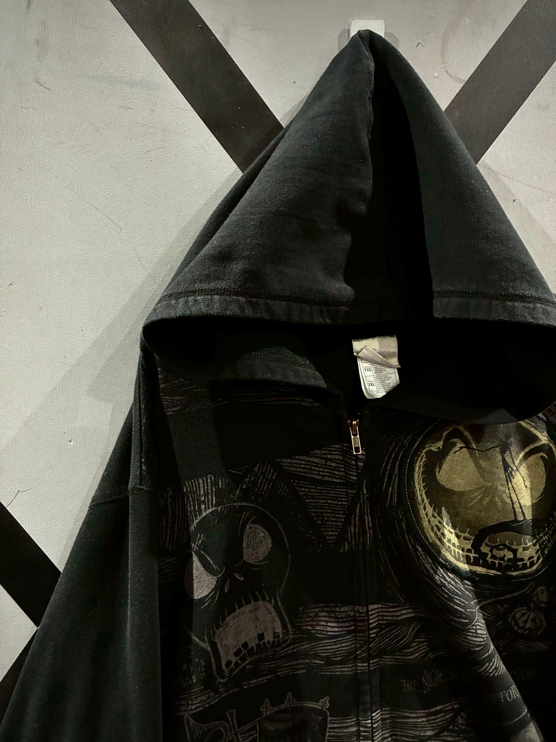 1993年公開のミュージカルアニメーション映画"ナイトメアー・ビフォア・クリスマス"に登場する"ジャック・スケリントン"のフェイスを載せたDisneyオフィシャルからの稀有なジップアップフーディ。