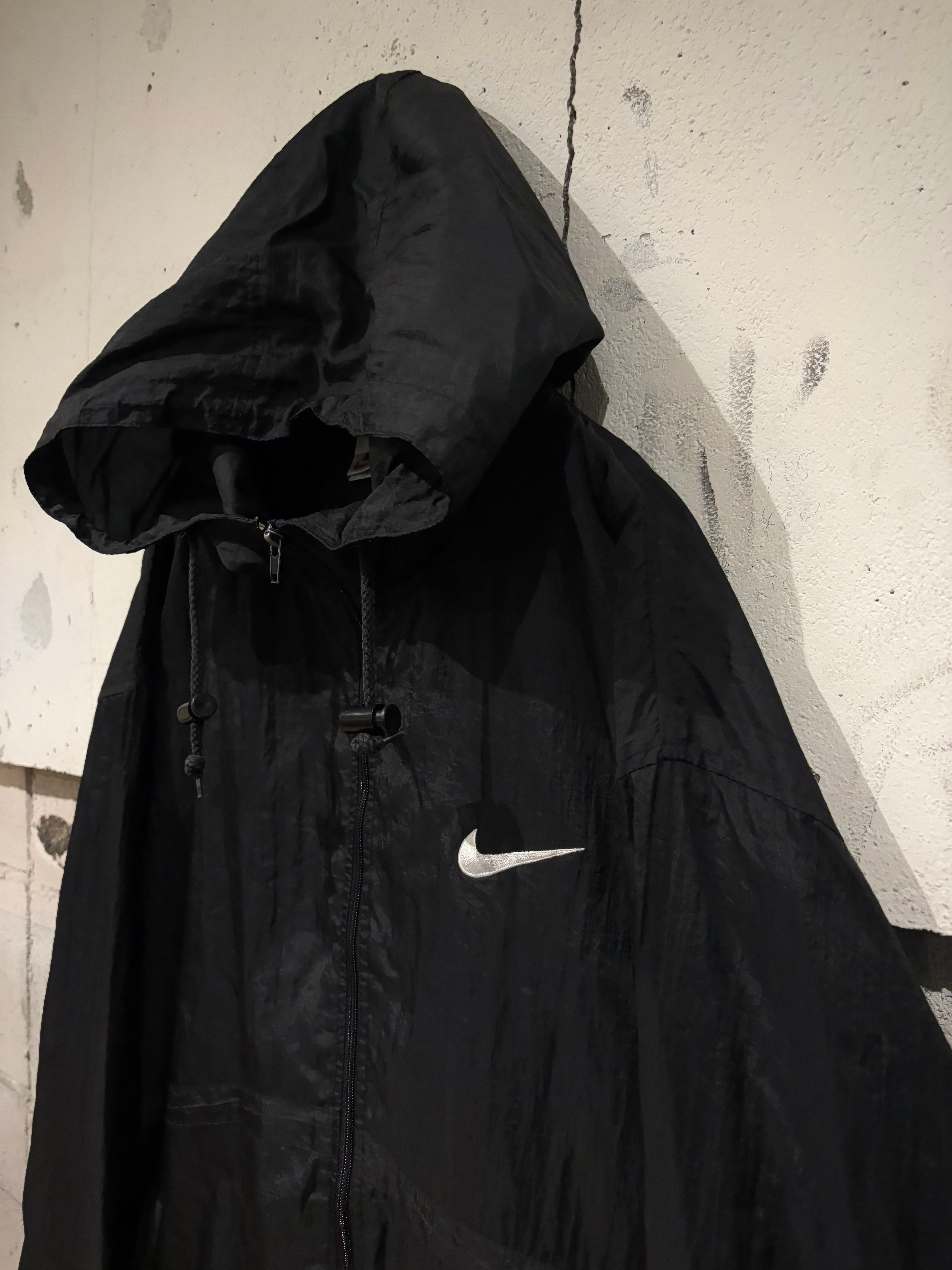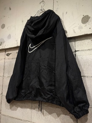 シャリ感のあるブラックのナイロンのボディに、左胸、背面にスウォッシュロゴを刺繍で刻んだナイロンジャケット。