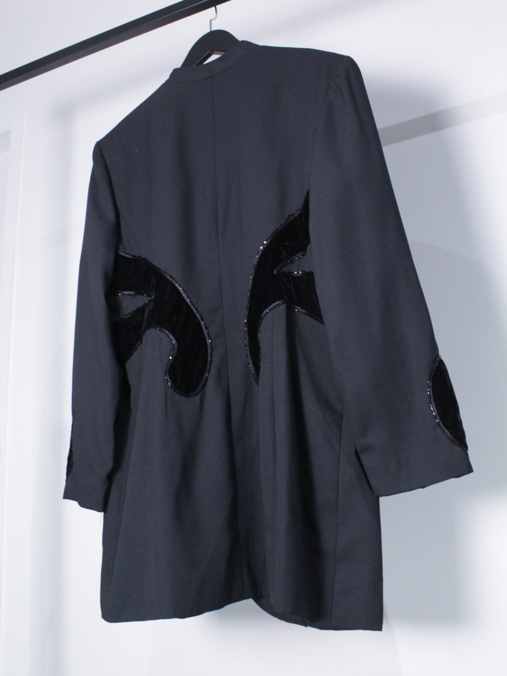 ベロアの周りにはビーズで相性が施され、ブラックベースでも煌びやかで豊かな表情に仕上がっています。フロントのいくつものループボタンのアクセントも◎