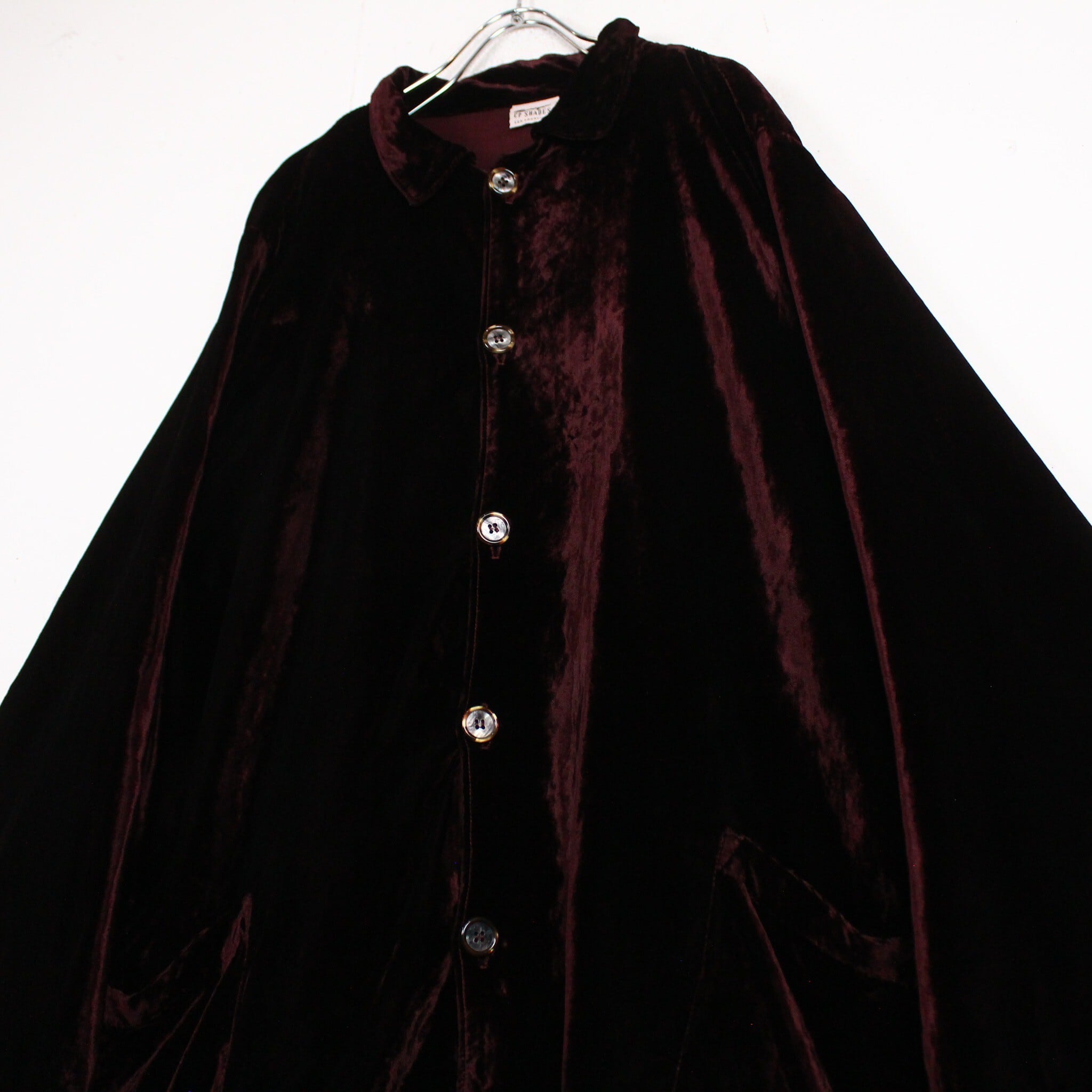シンプルなルックスですが、ベロア特有の起毛感から生まれる深い陰影とボルドーが相まって生まれる雰囲気に目と心の双方を奪われてしまいます、、、フロントのべっ甲風のボタンも◎