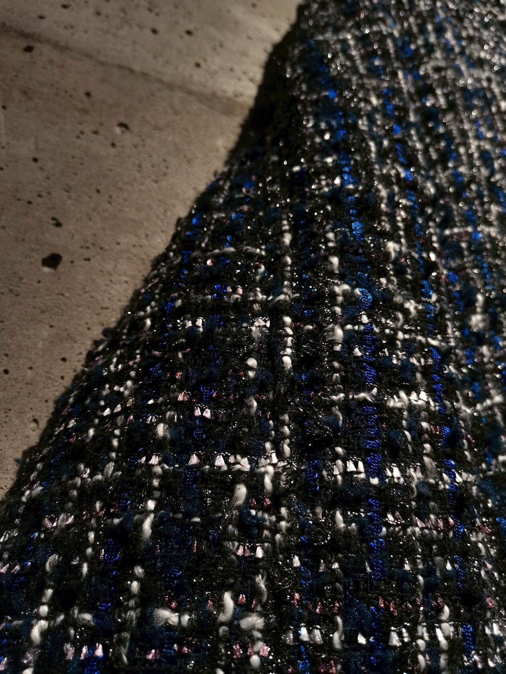 ココ・シャネルがこよなく愛したシャネルツイード調で仕上げられたブルゾンジャケット。ブラックのボディに、ブルーやホワイトの糸でチェック柄を表現したラグジュアリーな雰囲気をムンムンに放つ1着。