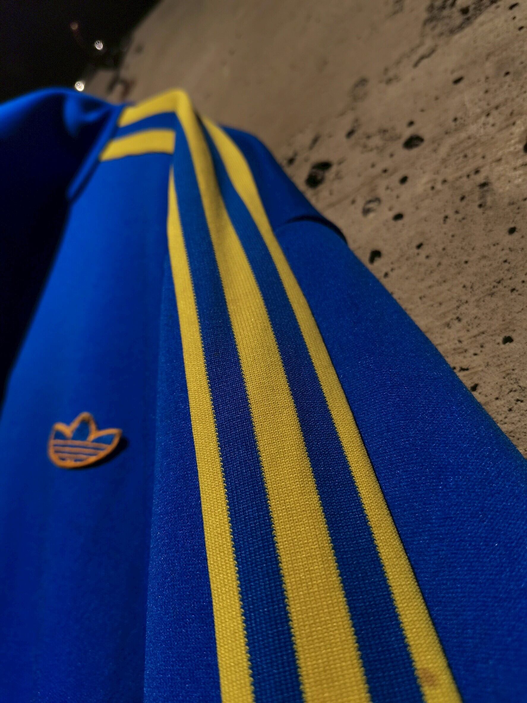 鮮やかなブルーカラーのボディに、左胸にトレフォイルロゴ、イエローの3ストライプをアームに走らせた80'sのトラックジャケット。暖かくなる春先に向けて鮮やかなカラーリングも超気分ですね。