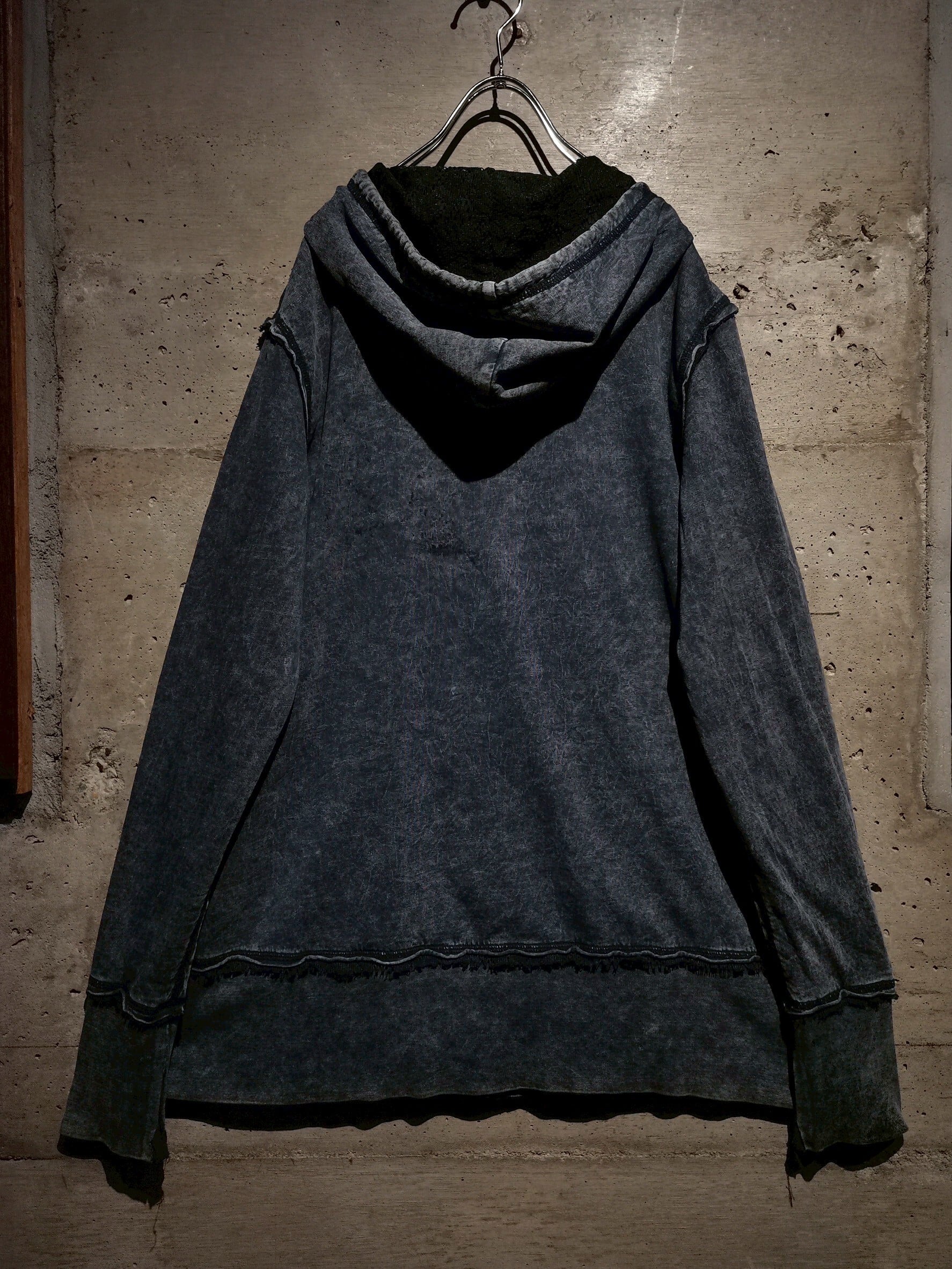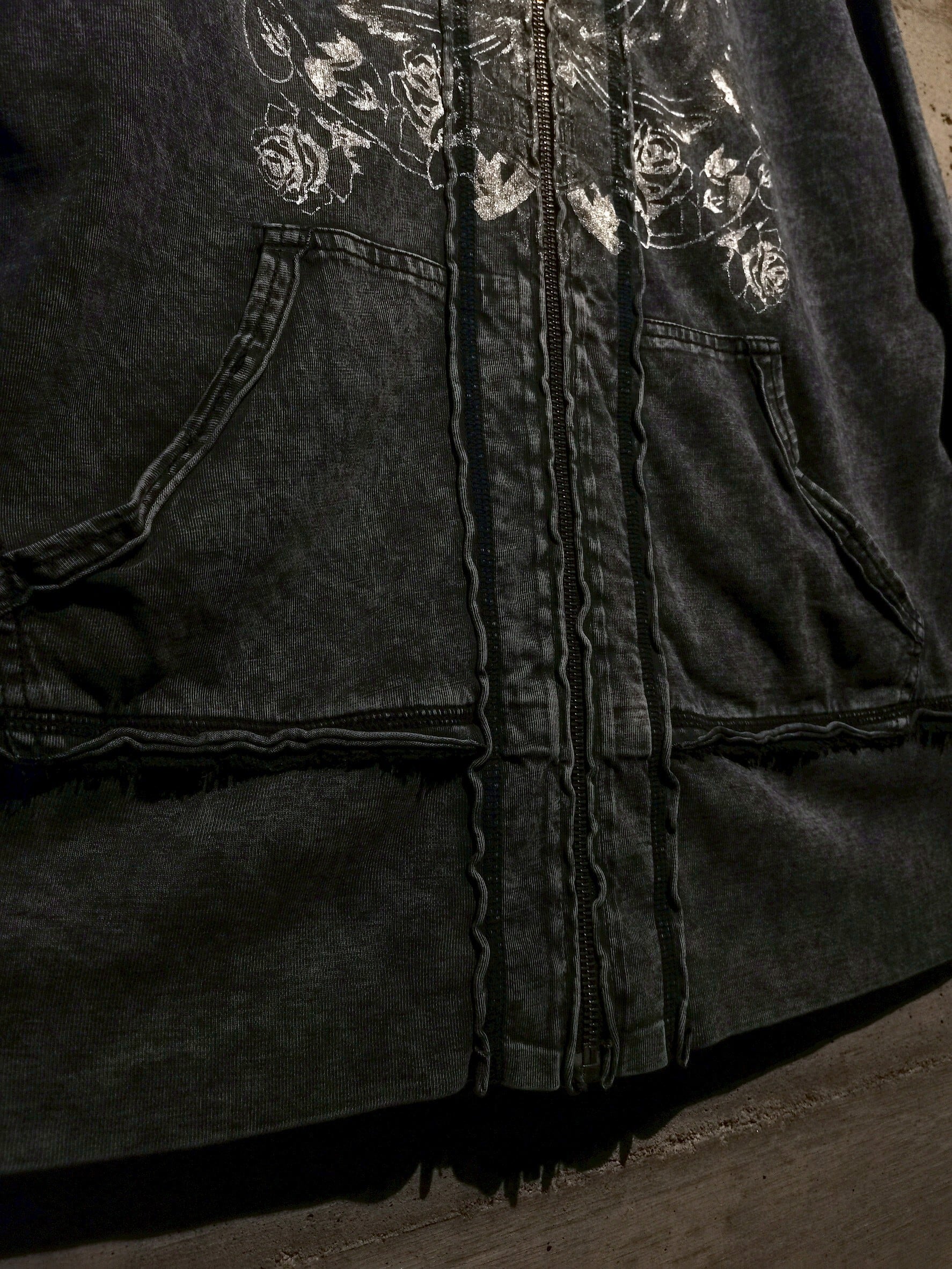 フェードしたようなグレーのボディをベースに、スカルやバラのプリント。ガバッと裏返すとメッシュ素材をベースにゴシック調の花柄を左胸に載せたジップフーディー。