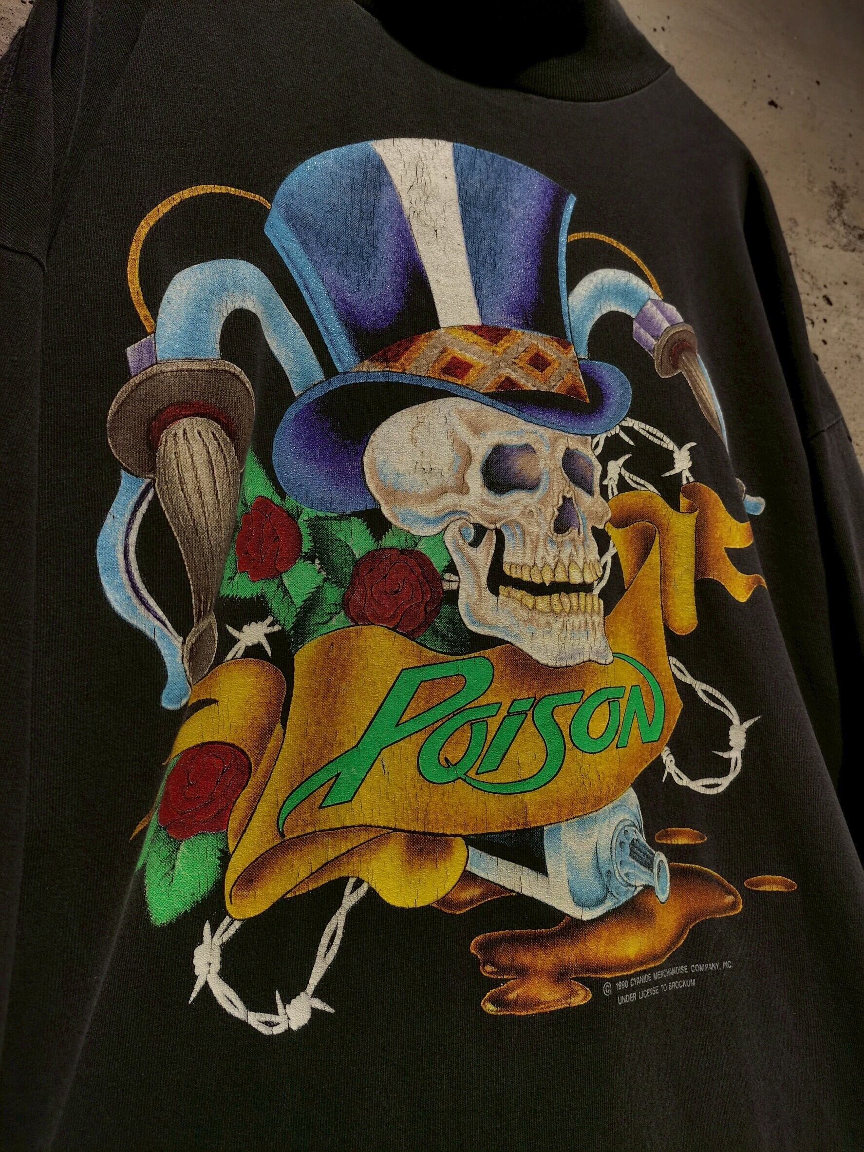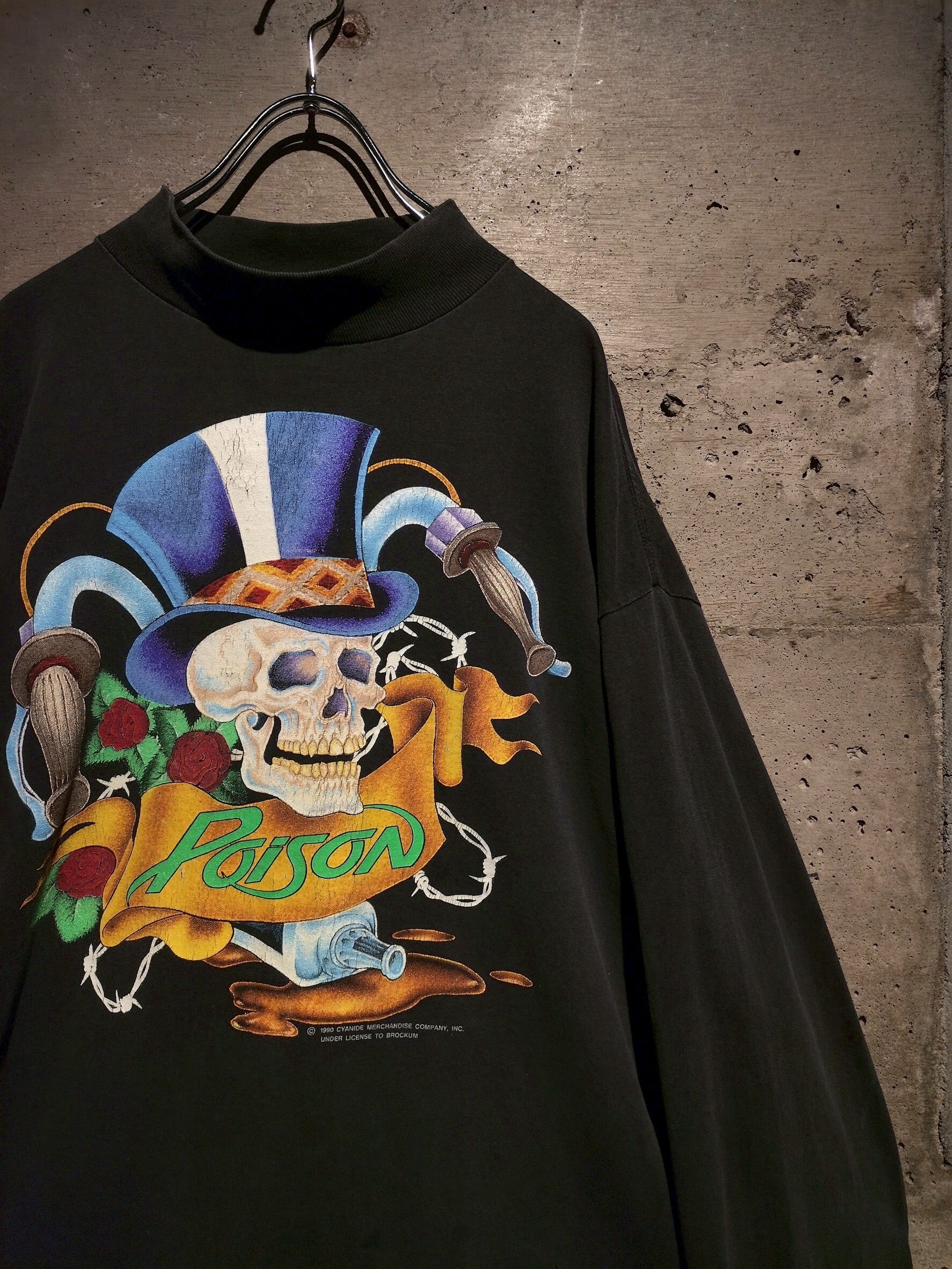 フロントにはマジシャンハットを被ったスカルやバラの花、バンド名"POISON"のプリントを施した1着。1990年のコピーライト入り、ゆとりを持たせたルーズなサイジング。ロンティーでは珍しいモックネックの仕様。