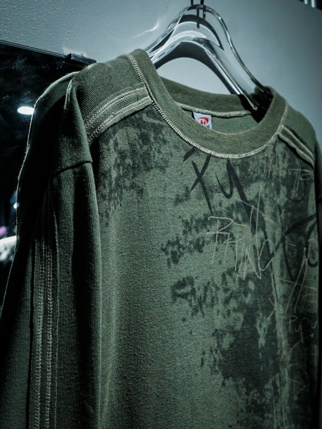カーキのボディに、ブリーチのようなまばらな色の切り替えで柄を載せたスウェット。