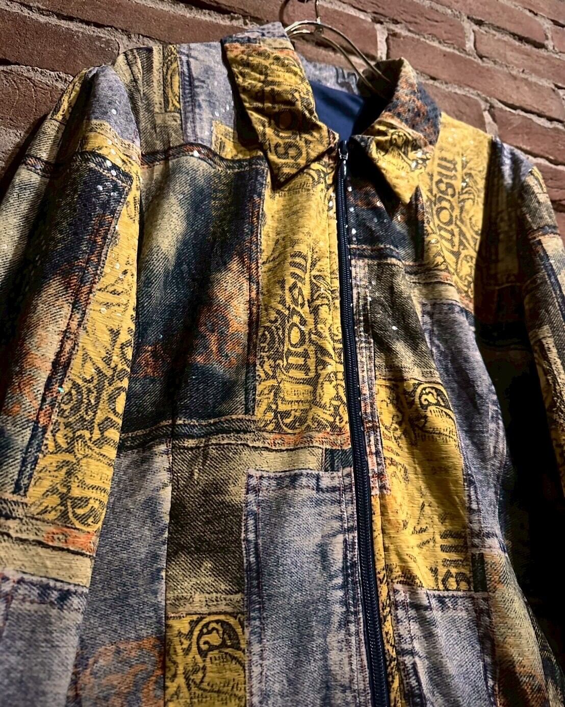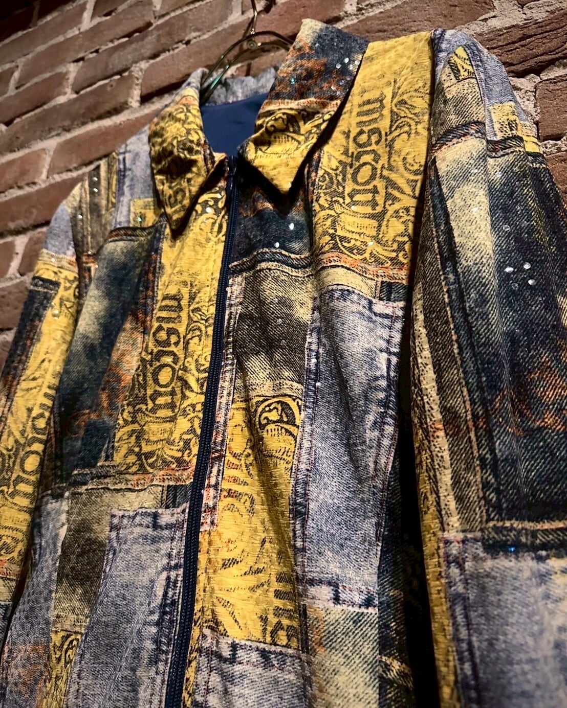 伸縮性のあるボディに、デニムのパッチワーク風のデザインを載せたジップアップジャケット。