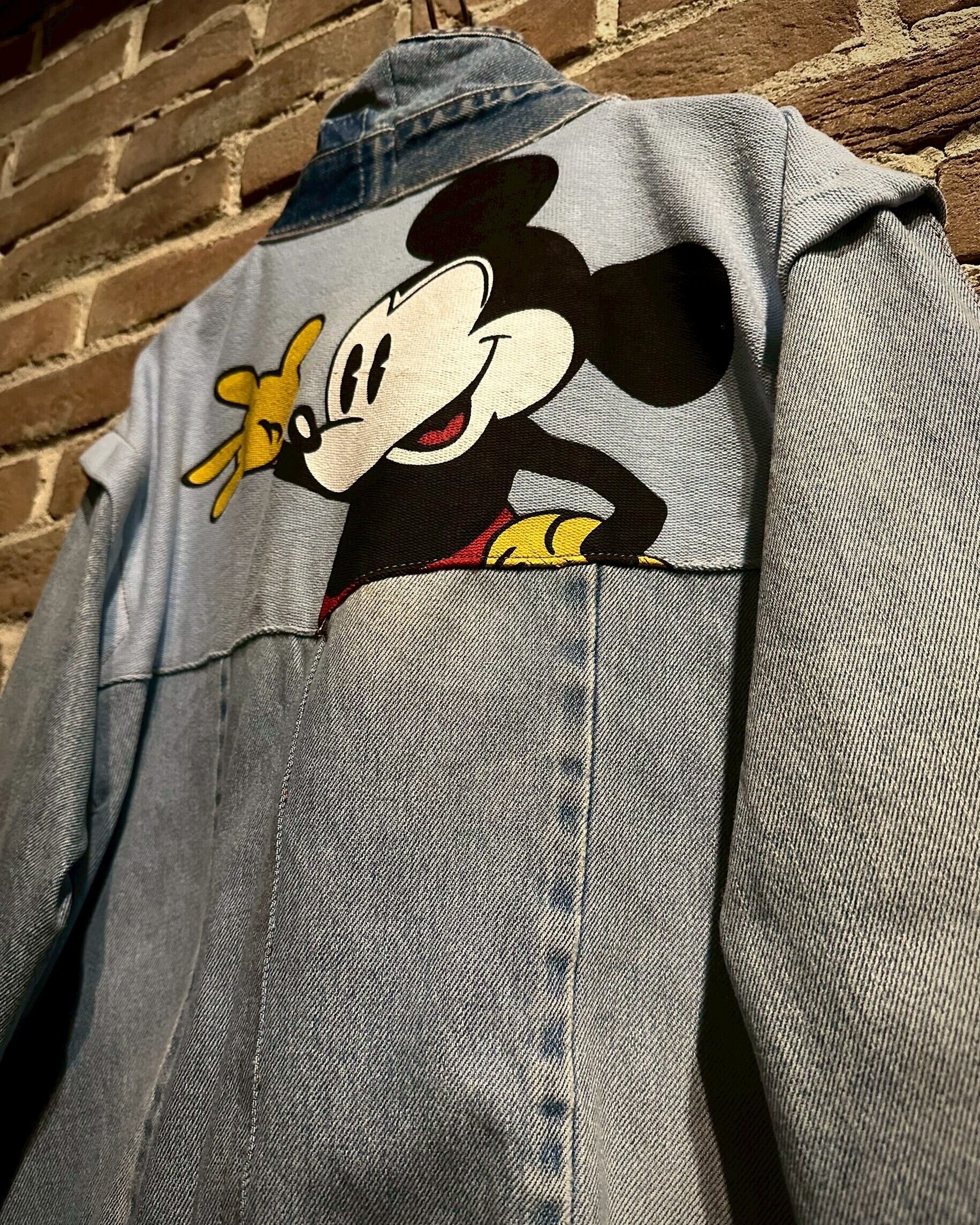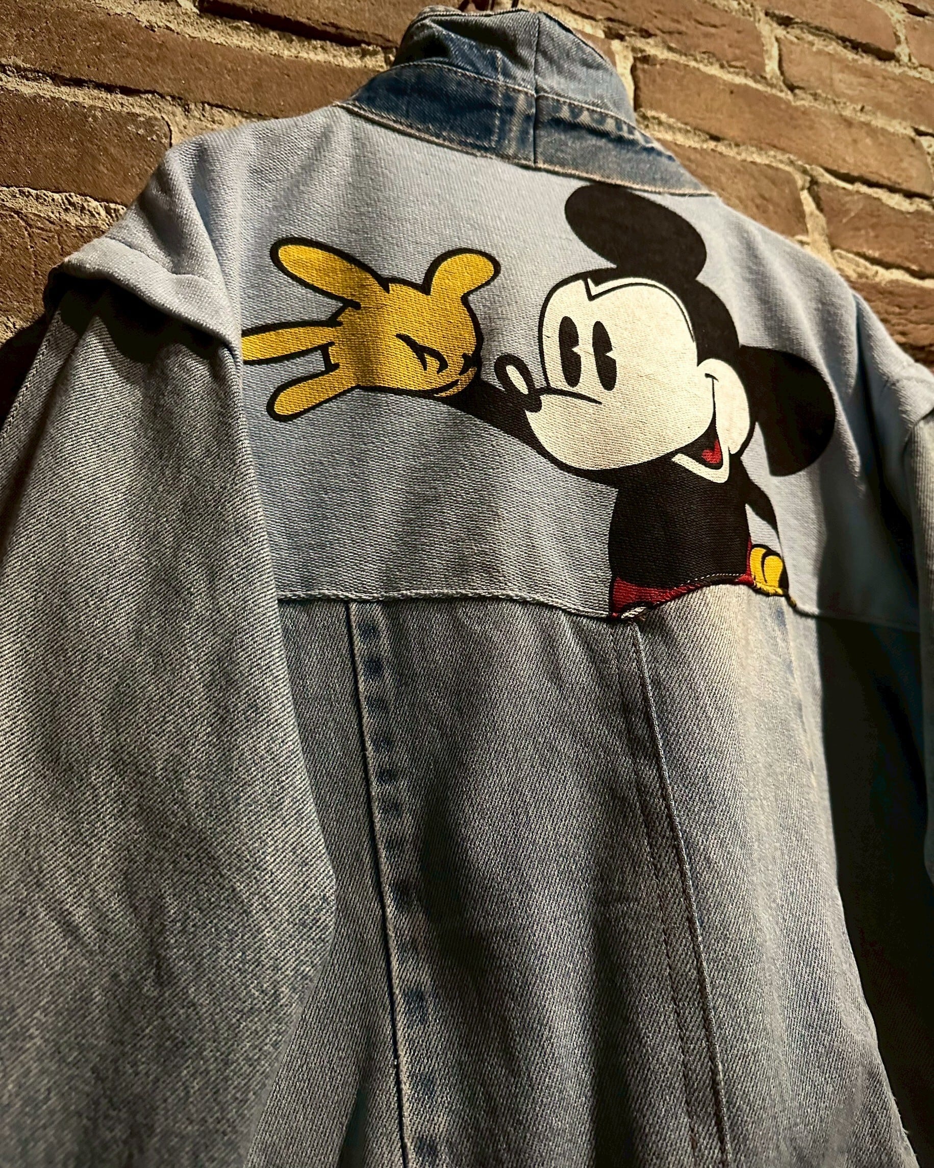 一際目を惹くフロントは、デニムパンツの腰回り部分を用いて繋ぎ合わせ、背面には人気キャラクターのミッキーをプリントで載せた生地を切り替え。