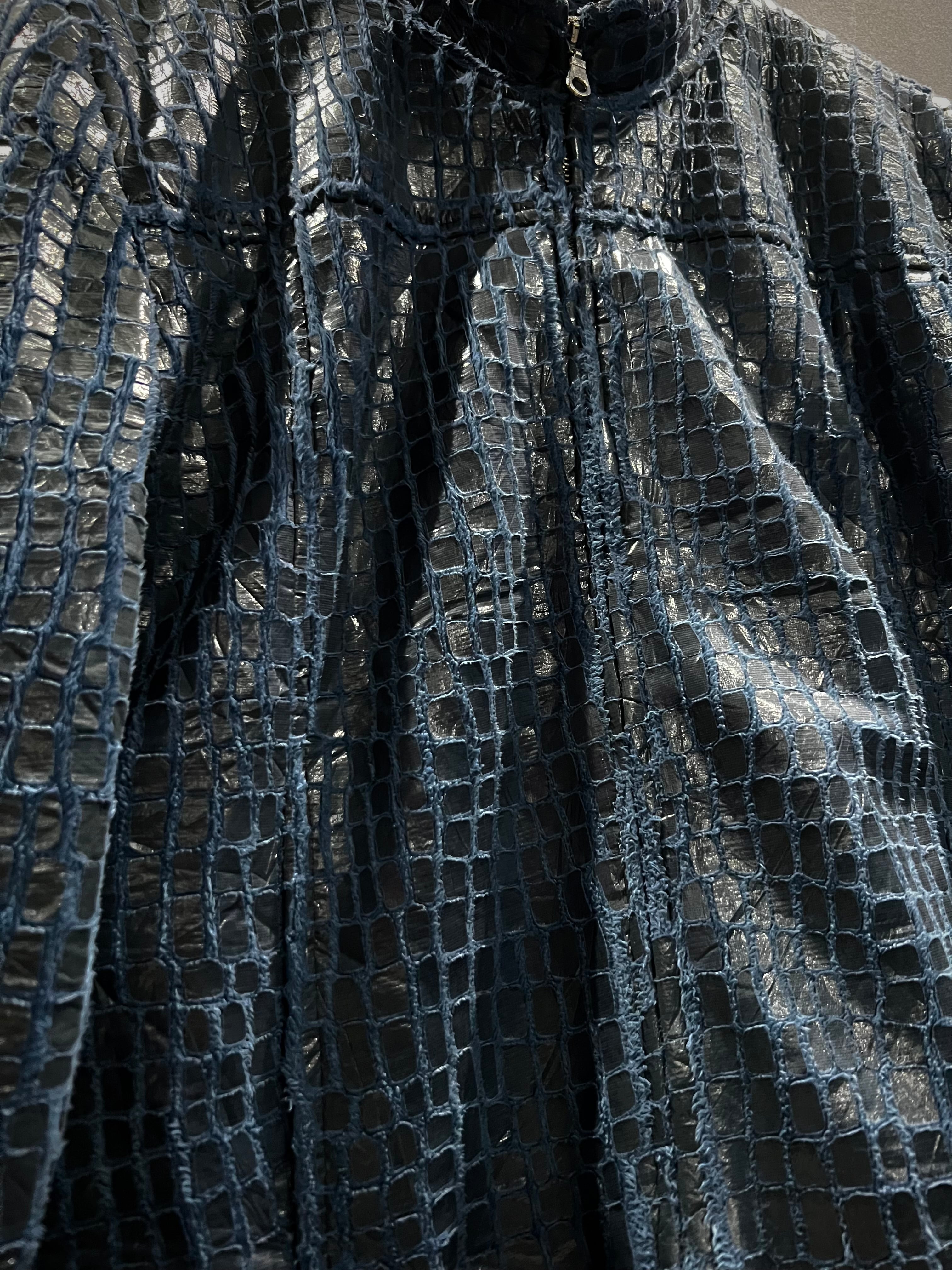 フワッと軽くシーズンレスなポリエステル素材に、鈍く光沢を放つクロコダイル調のコーティングを施し、レザーライクな風合いに仕上げた逸品。