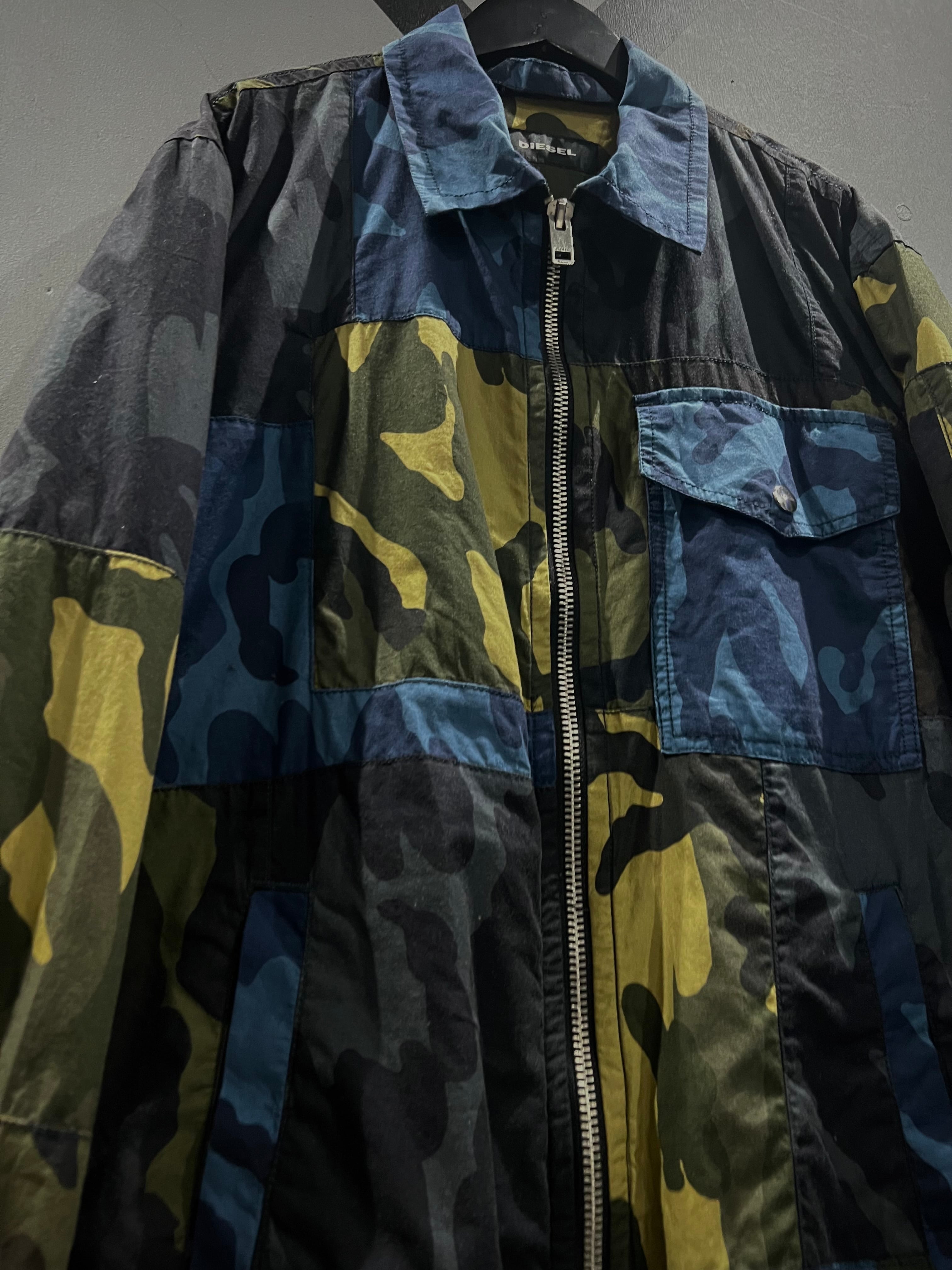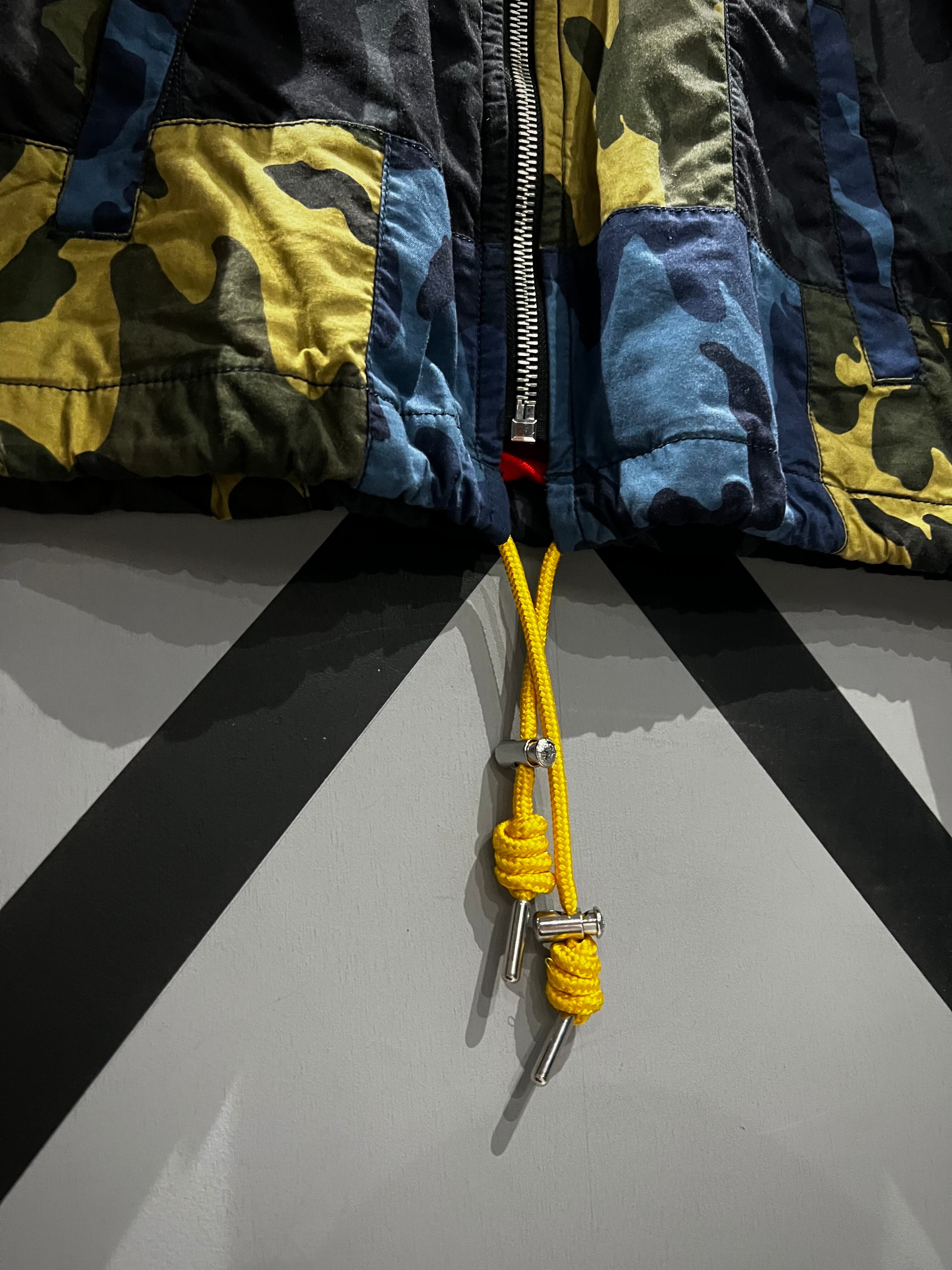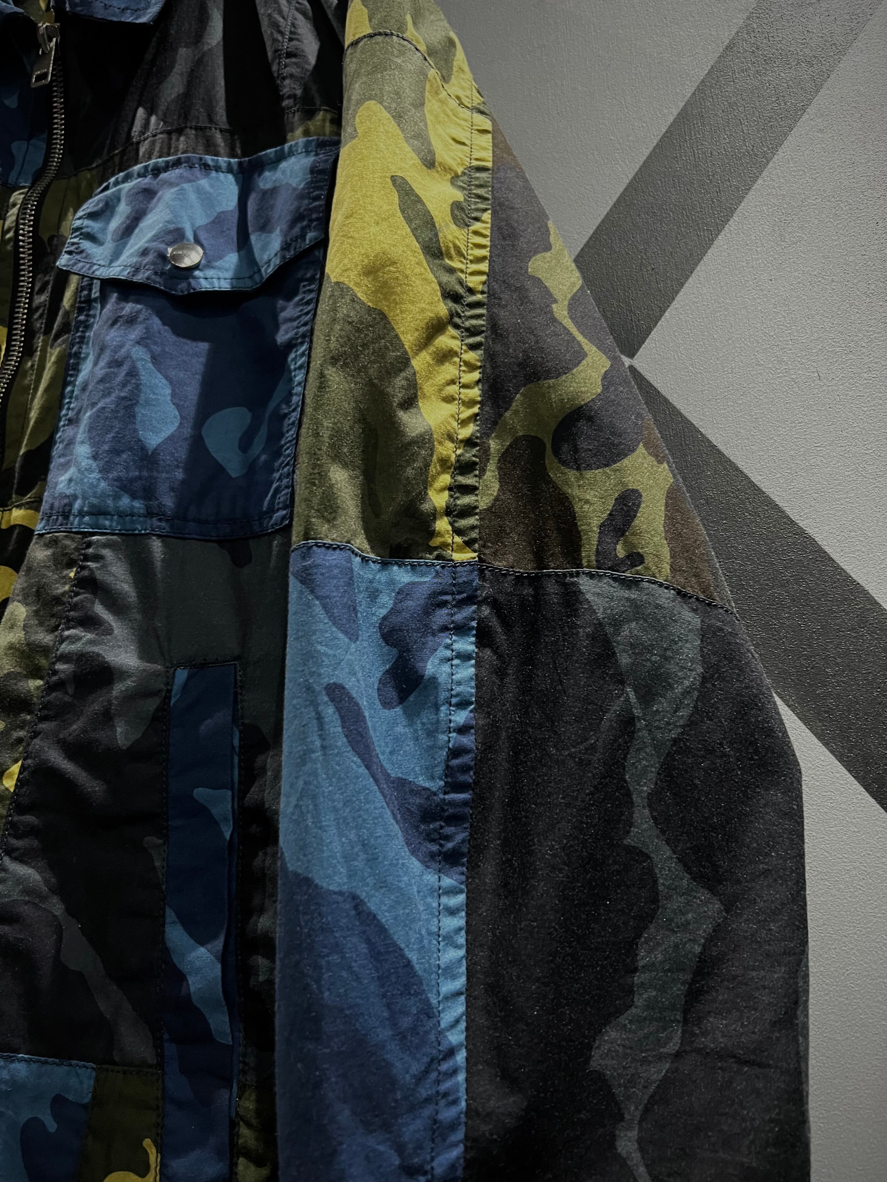 グレー、黄、青のカモ柄をパッチワークで切り替えたジャケット。