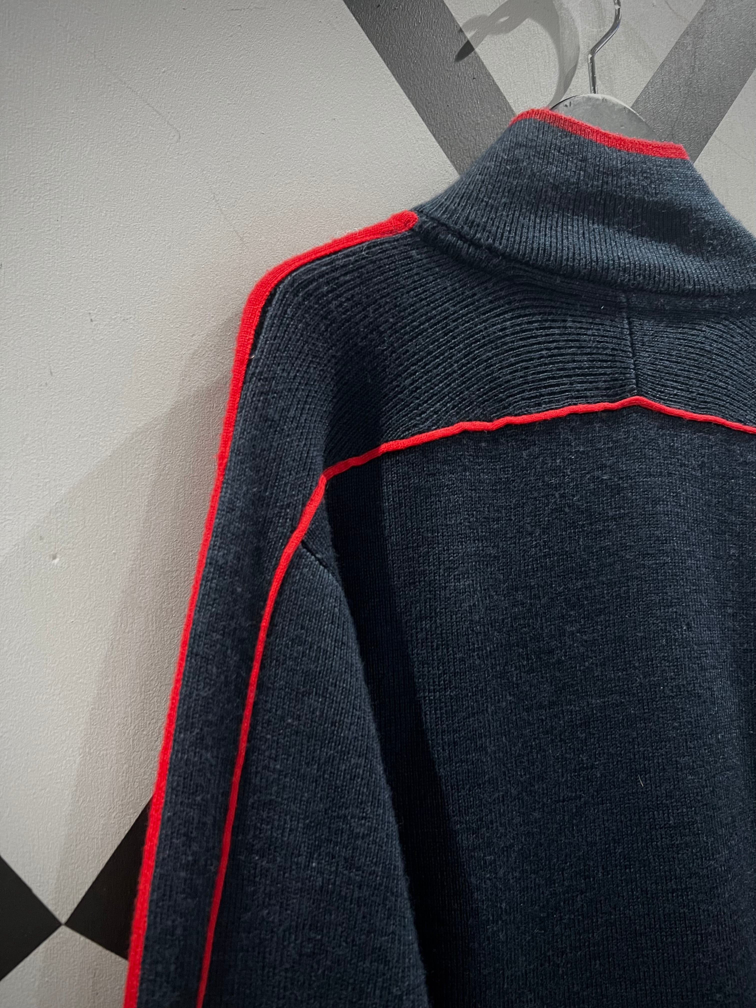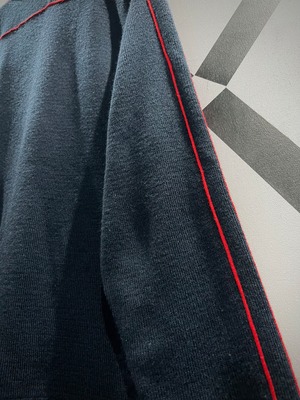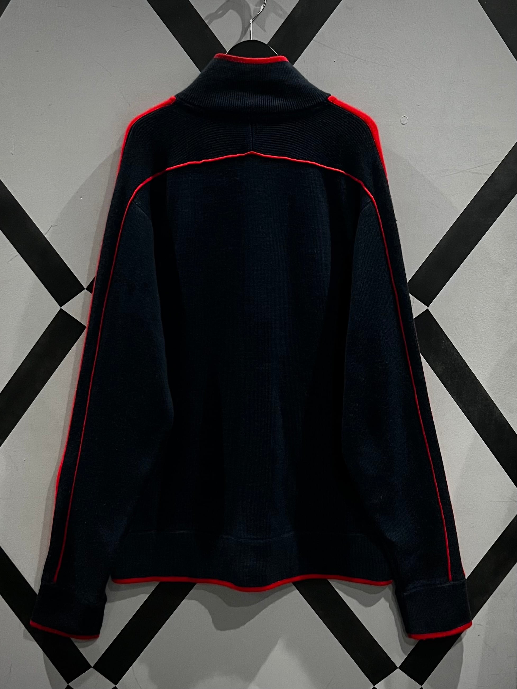 ブラックのボディをベースに、真紅のラインを走らせたジップアップニットジャケット。