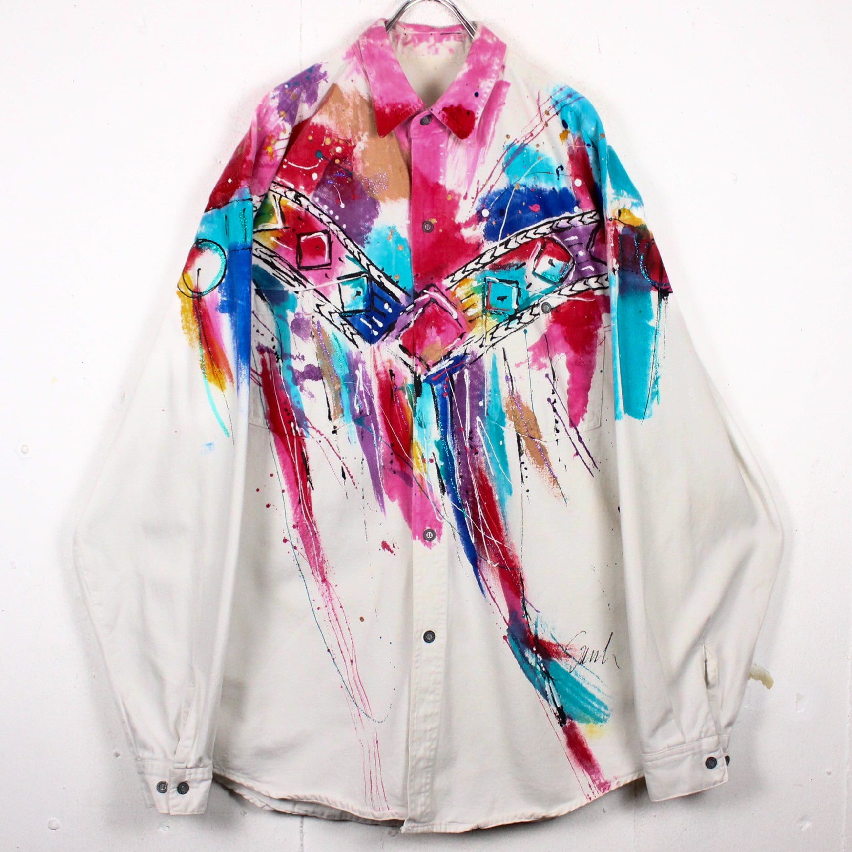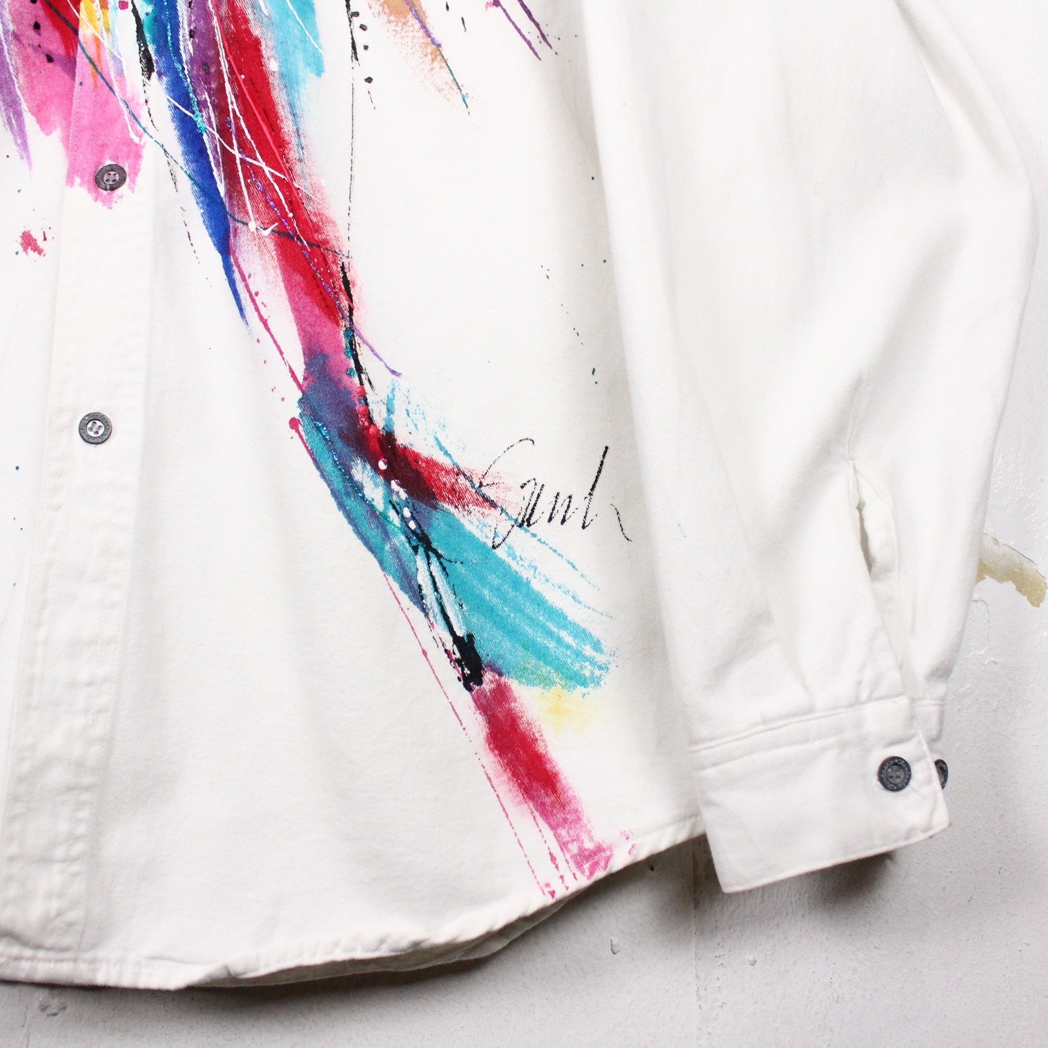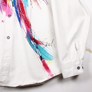 コシのあるホワイトのボディをベースに、前所有者によるペイントのカスタムが施されたシャツジャケット。