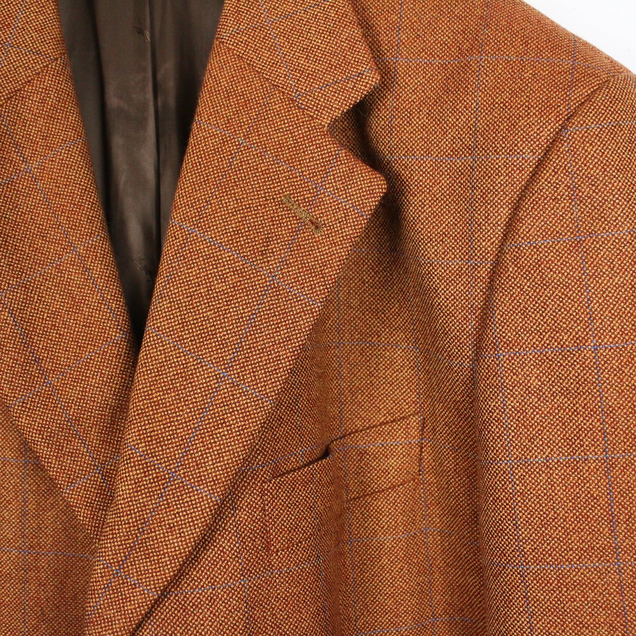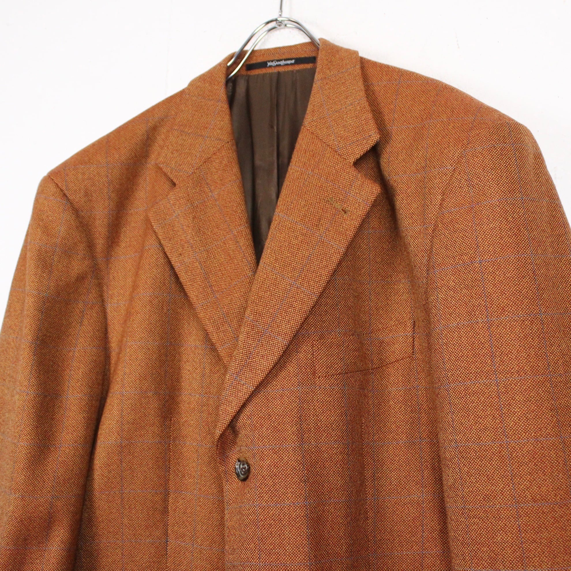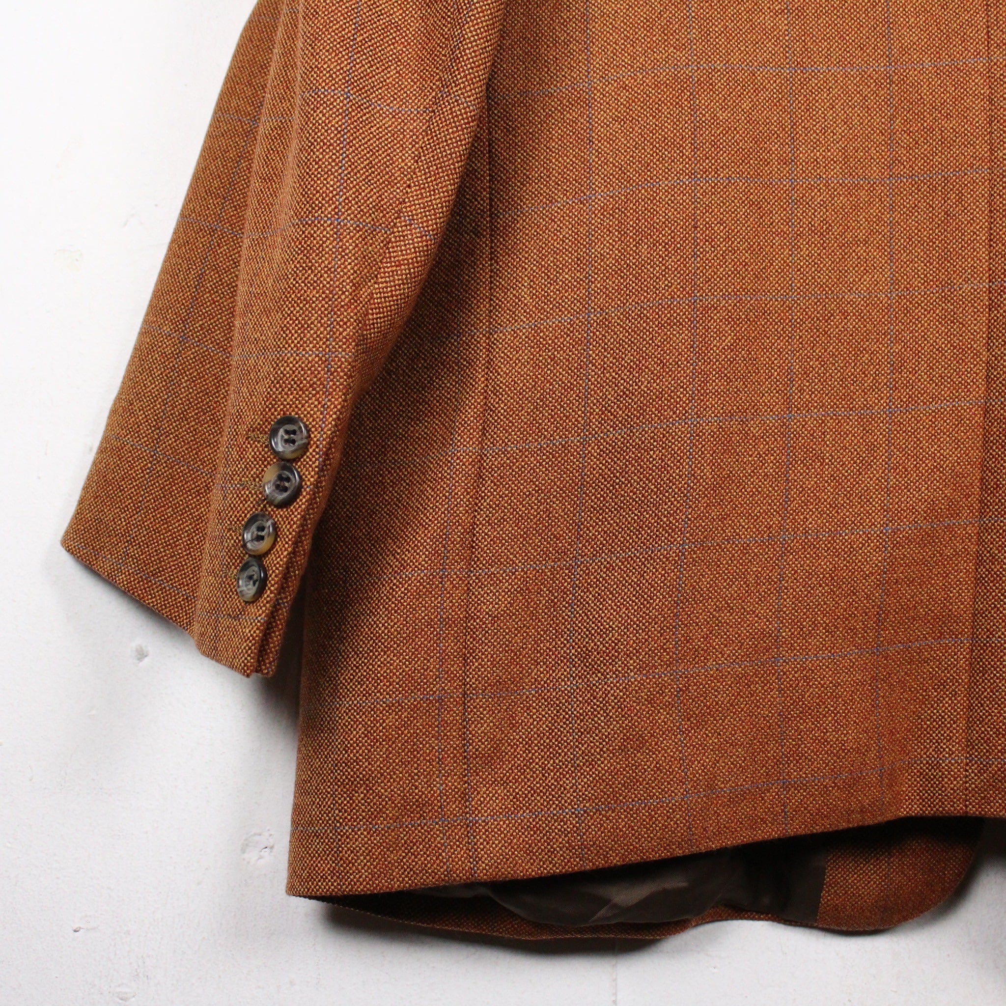 上質な織りで仕上げられたオレンジブラウンのボディに、青でチェック柄を載せたテーラードジャケット。