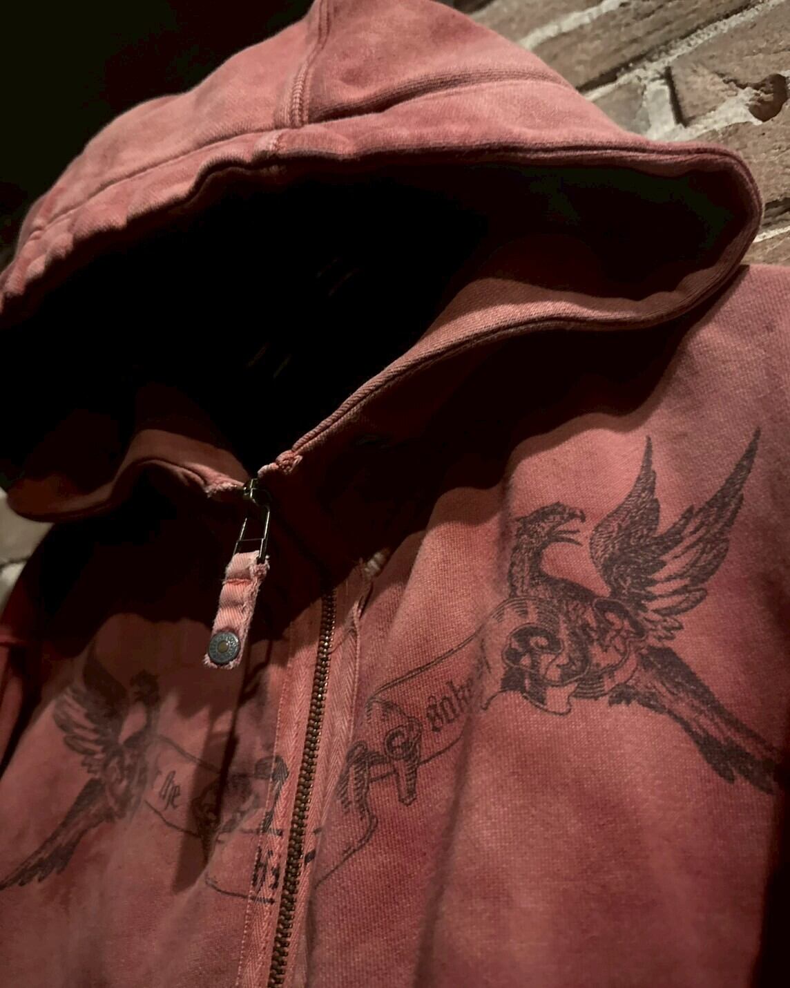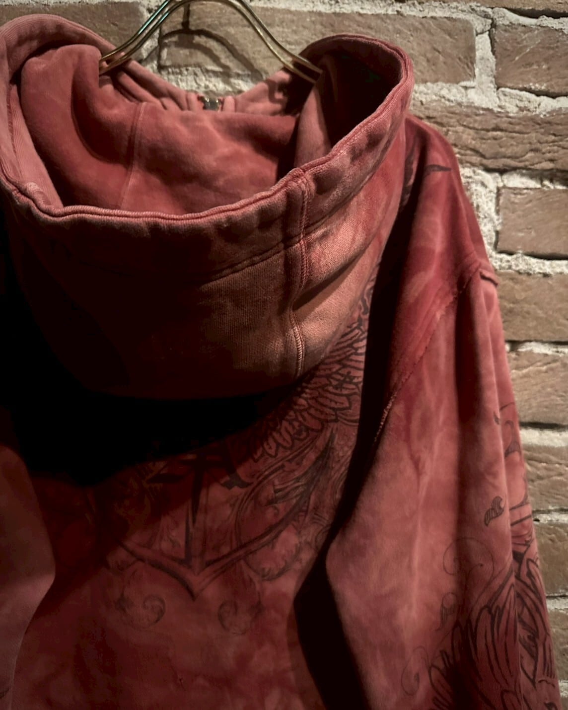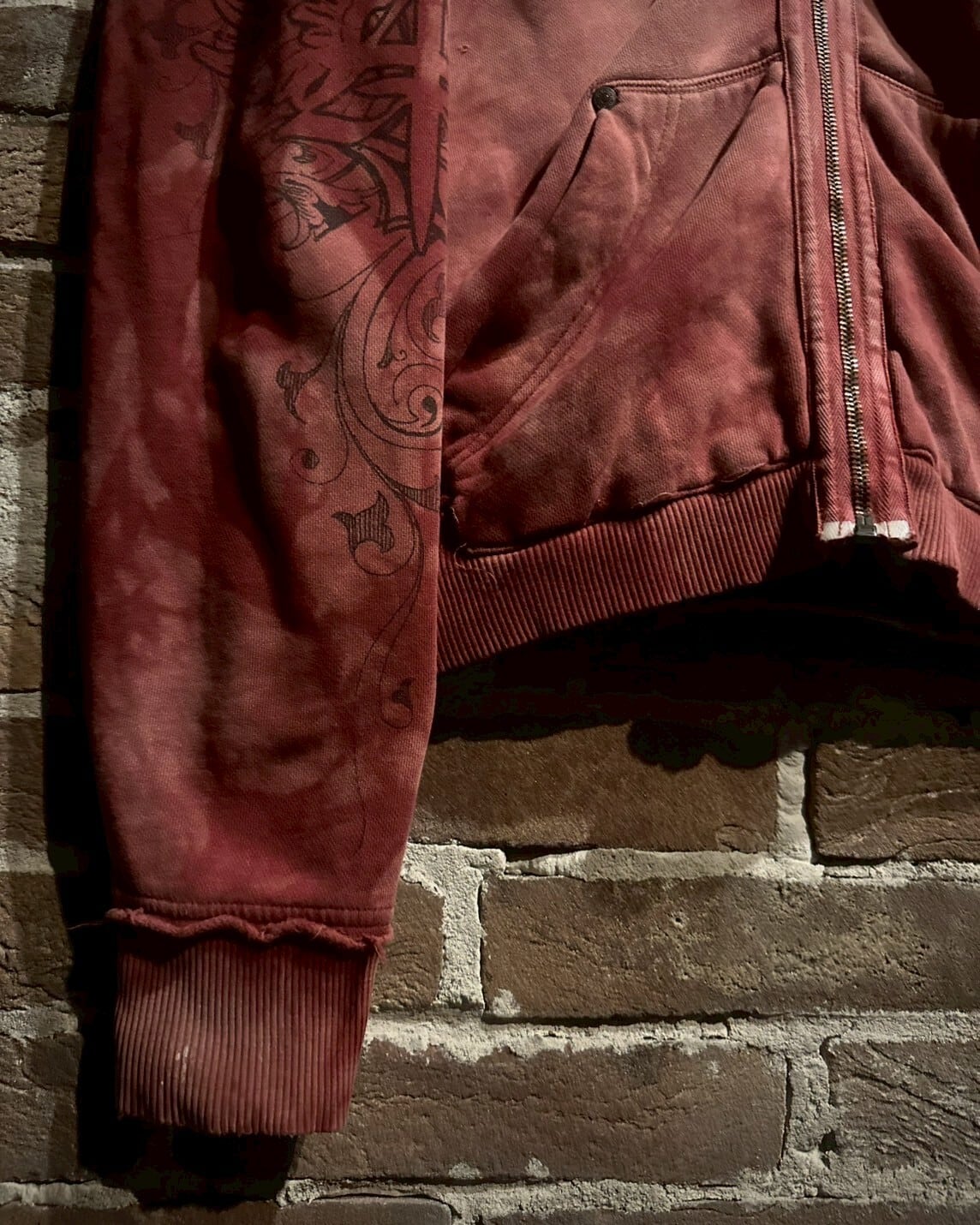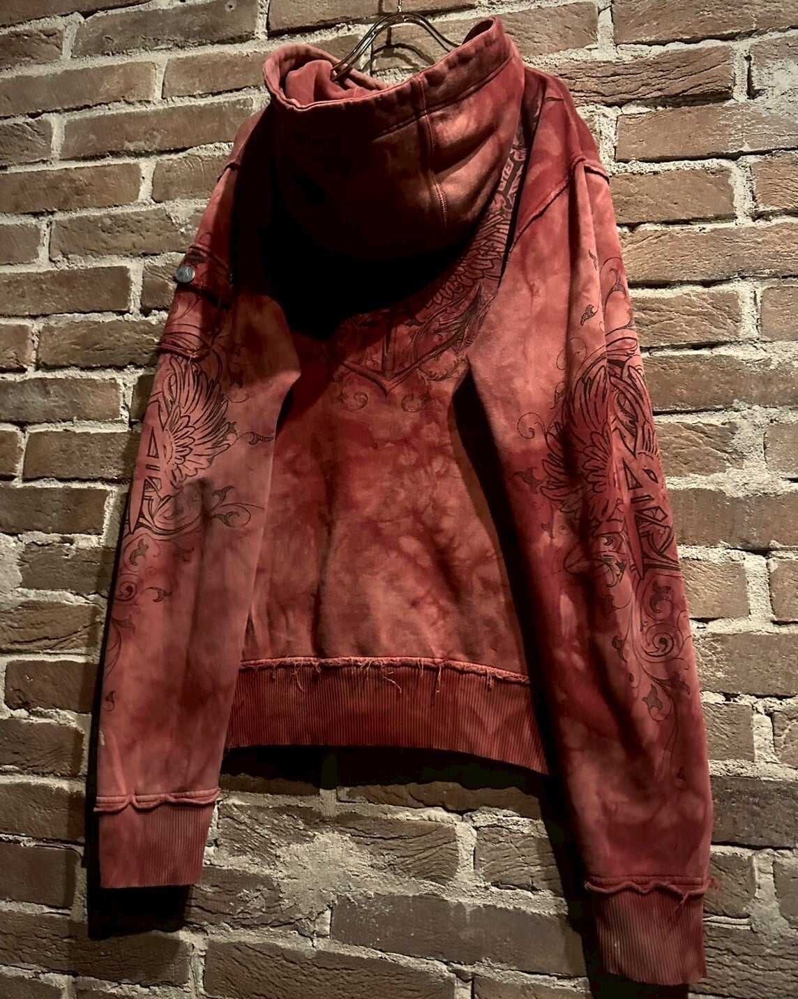 グラデーションの美しい染めを施したボディに、大胆ながら繊細なゴシック調のデザインを施したジップアップフーディ。