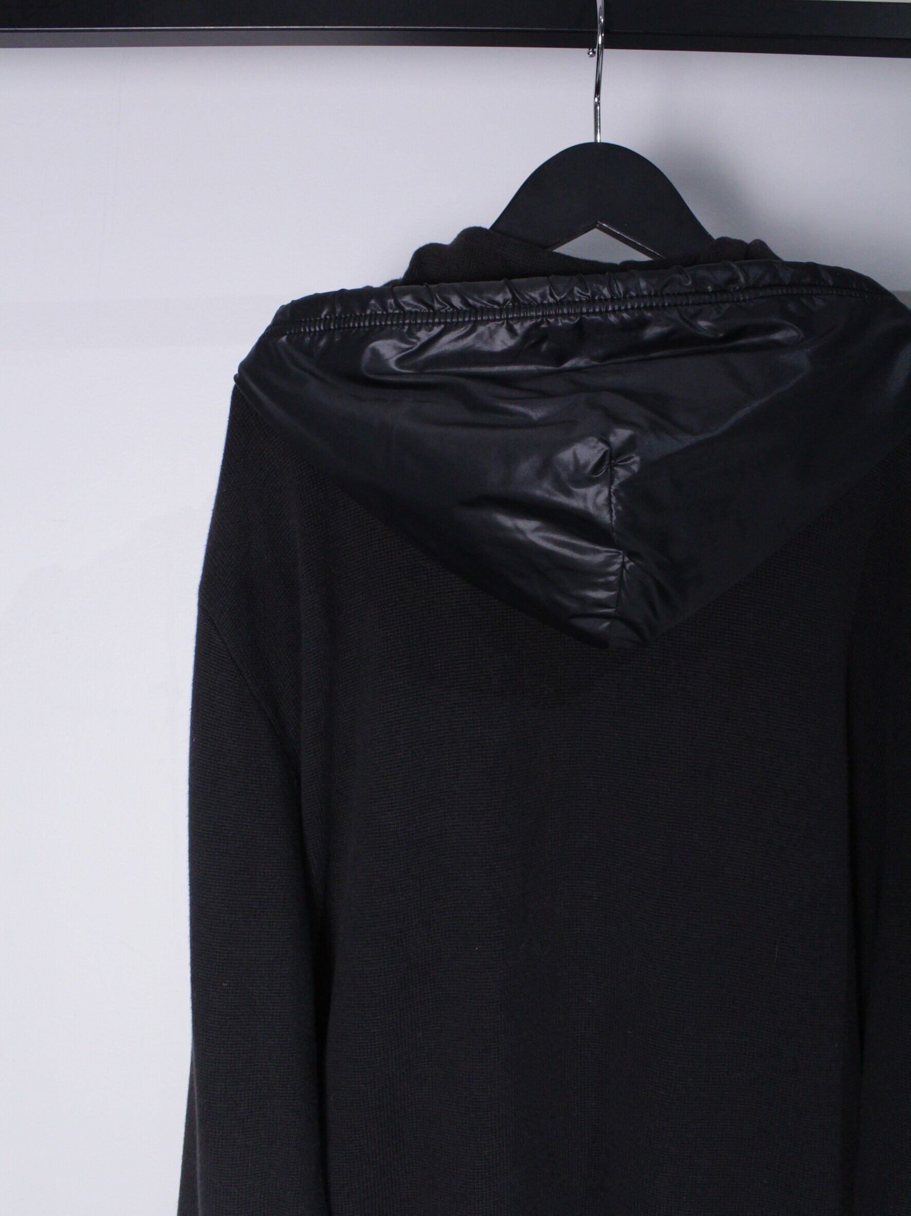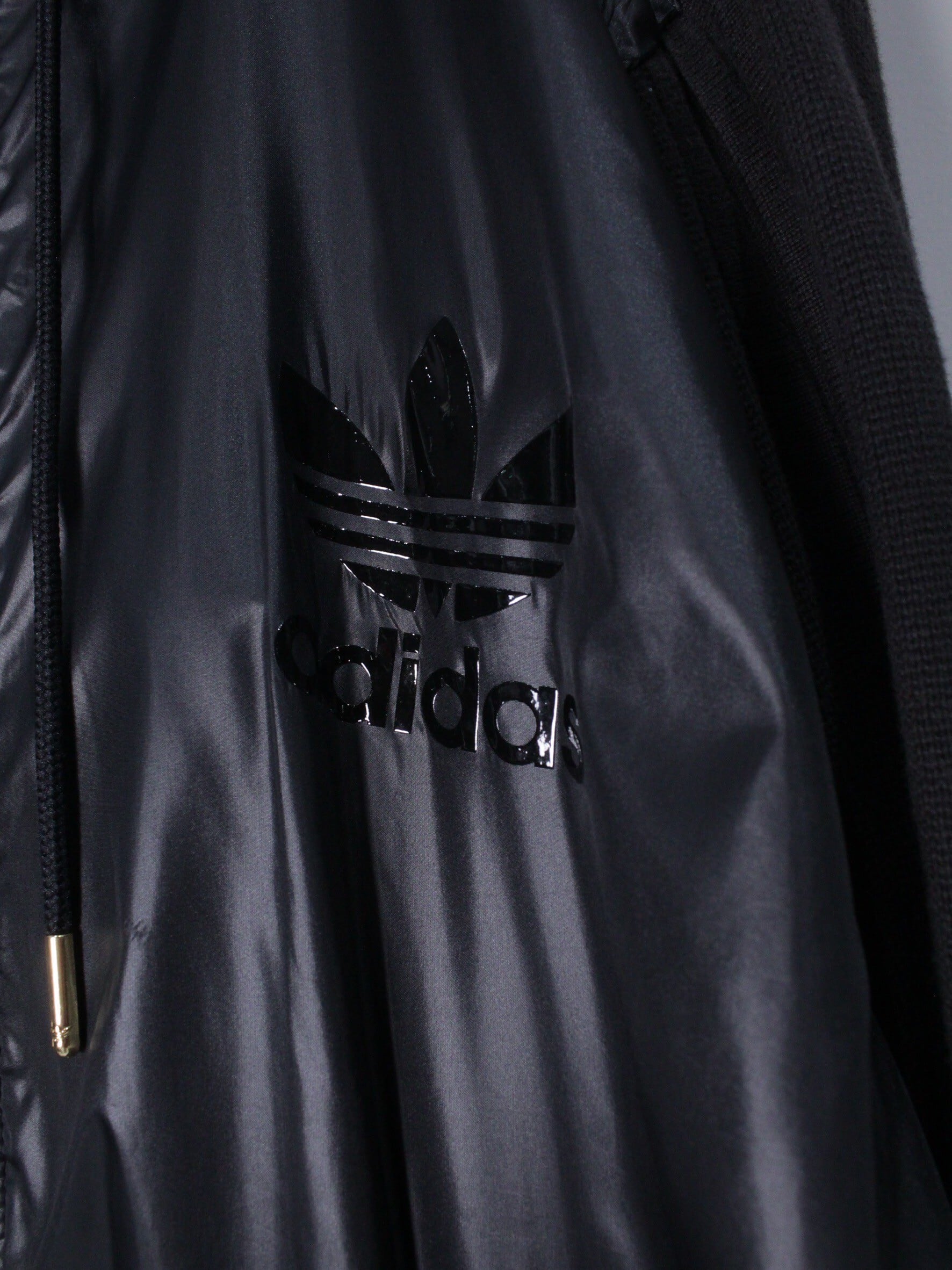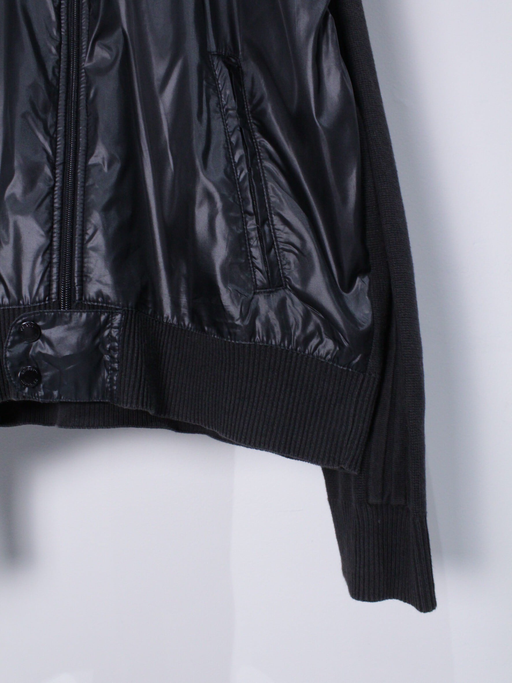 ブラックのニット素材をベースに、艶のある素材を前身頃に切り替えたトラックジャケット。スポーツブランドでこのテンションの服はなかなか見つからないかと。