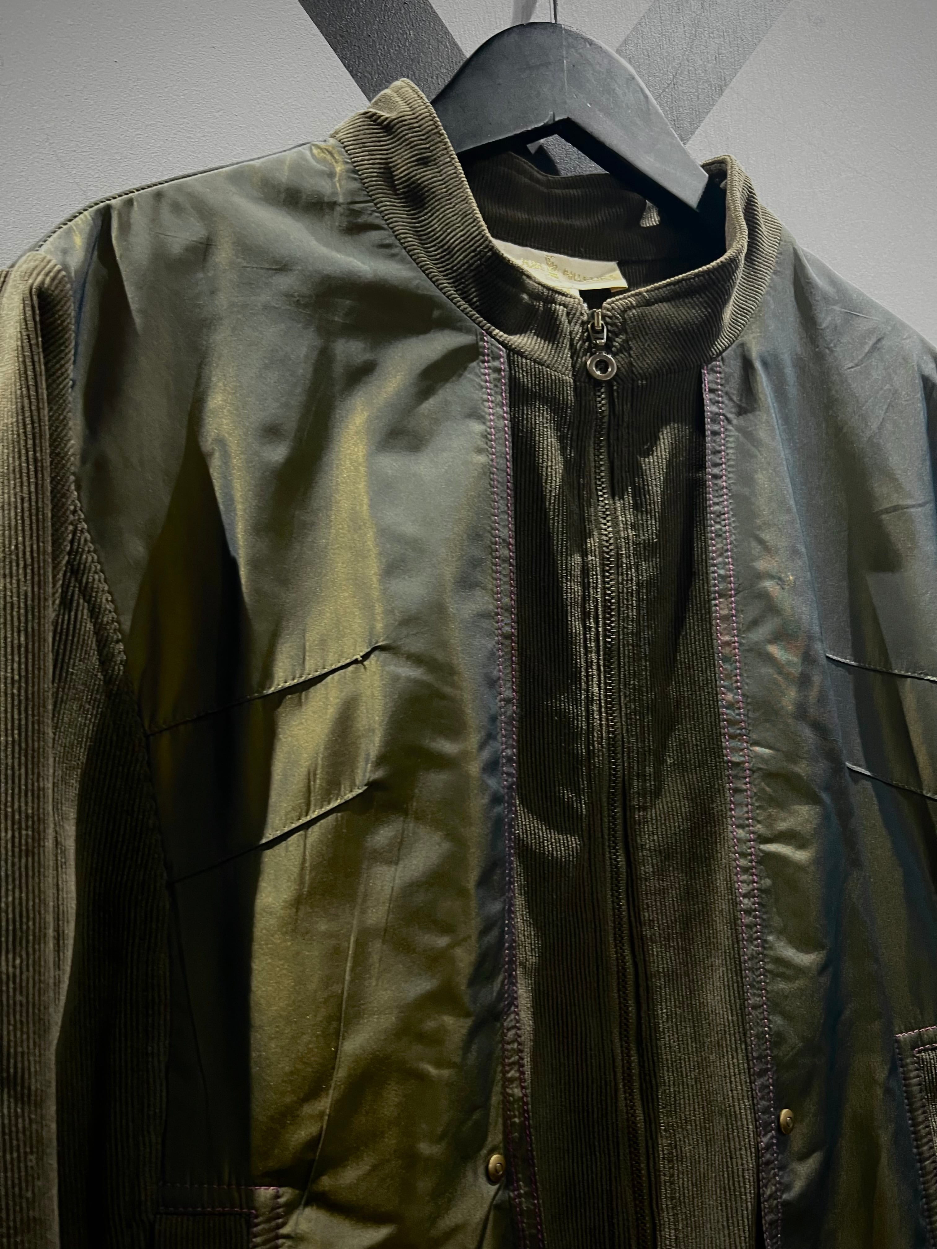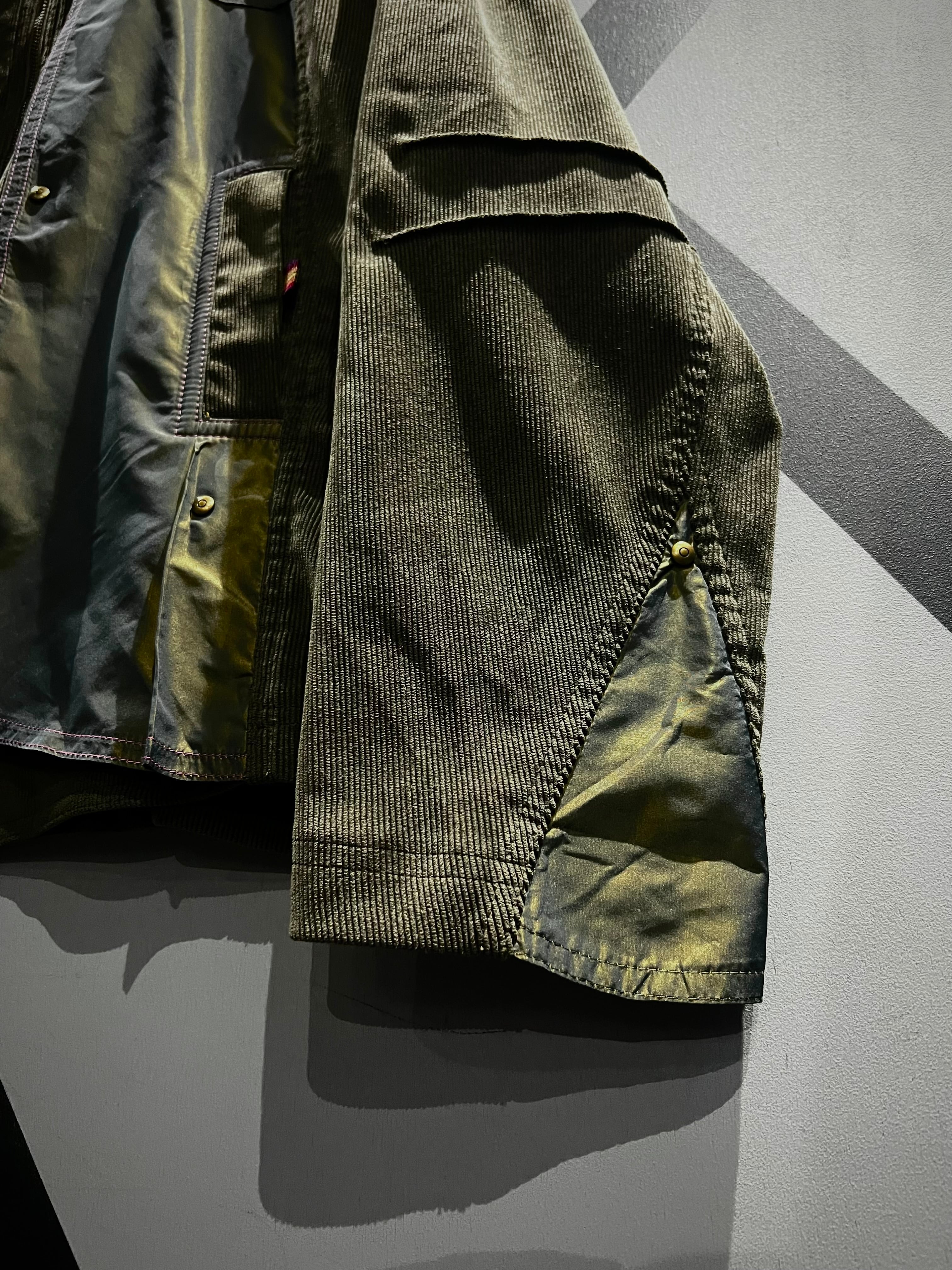 渋さ見せるブラウンカラーのコーデュロイをベースに、前身頃から背面にかけてナイロンを切り替えた1着。