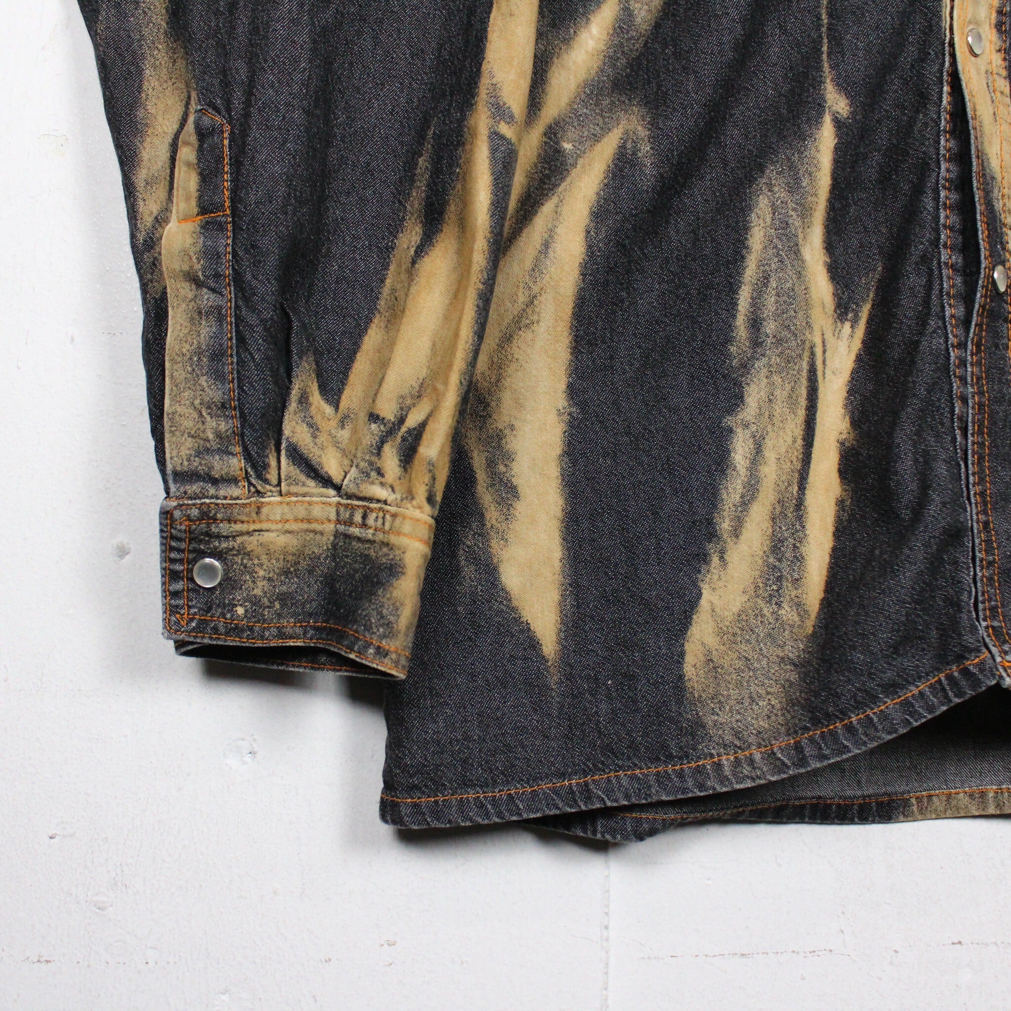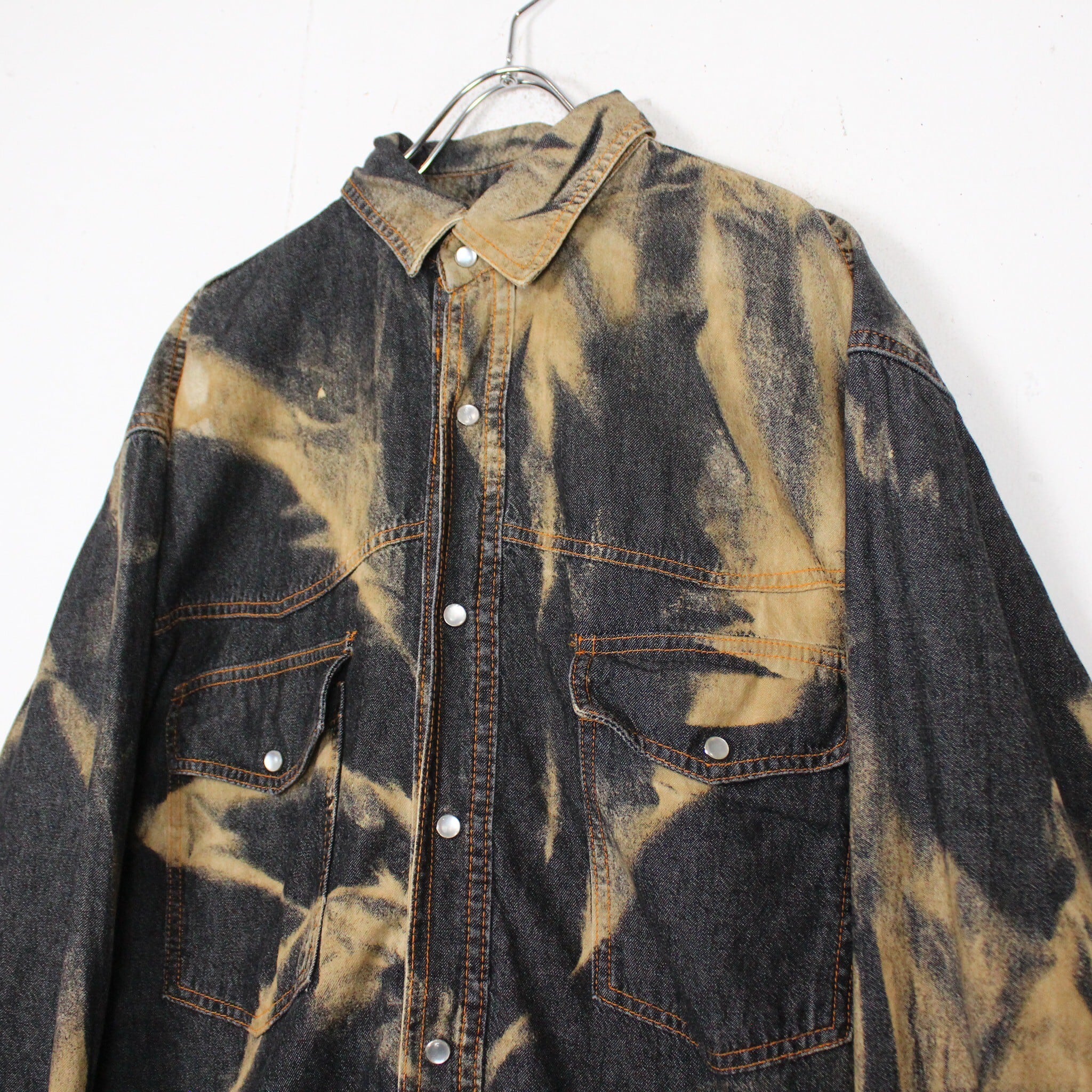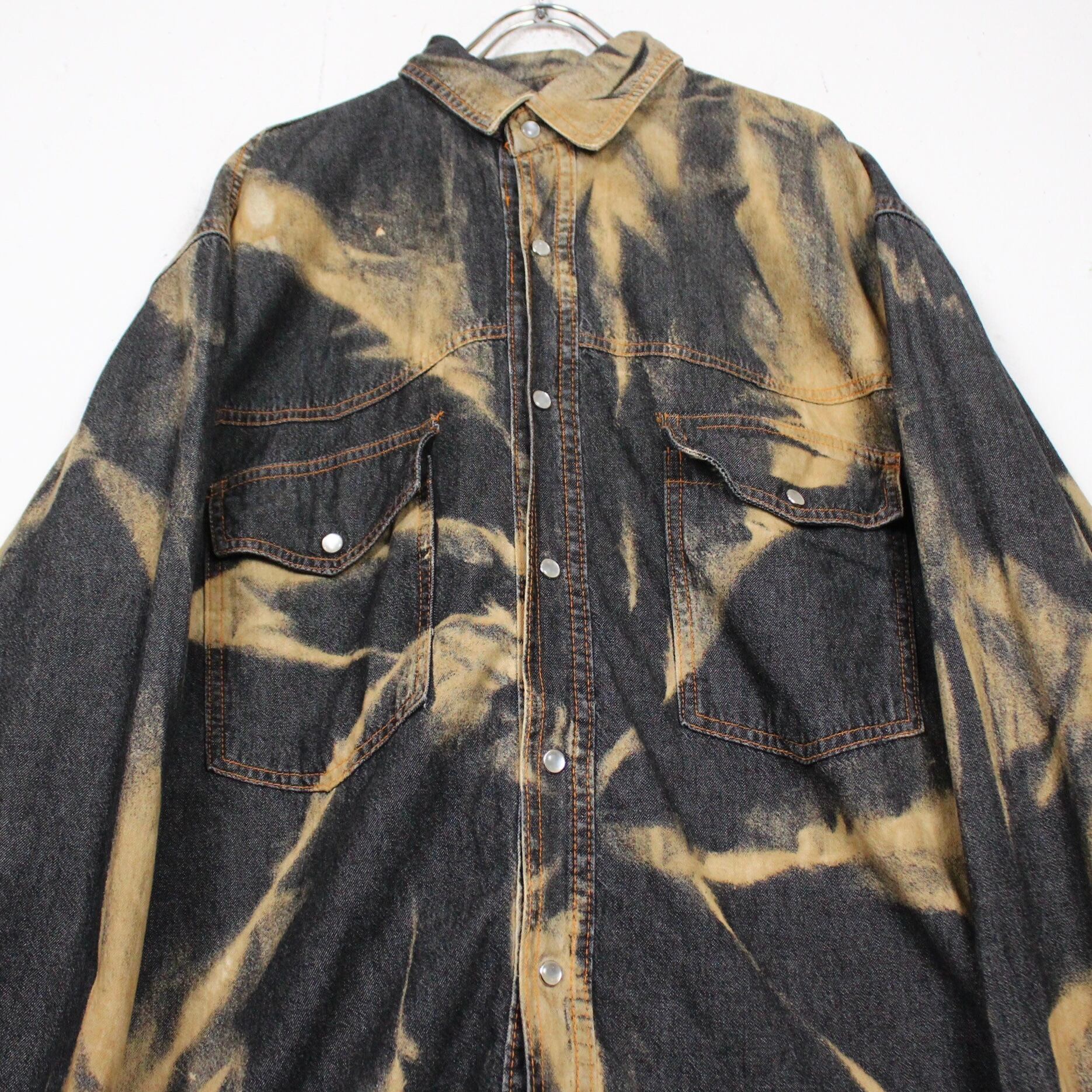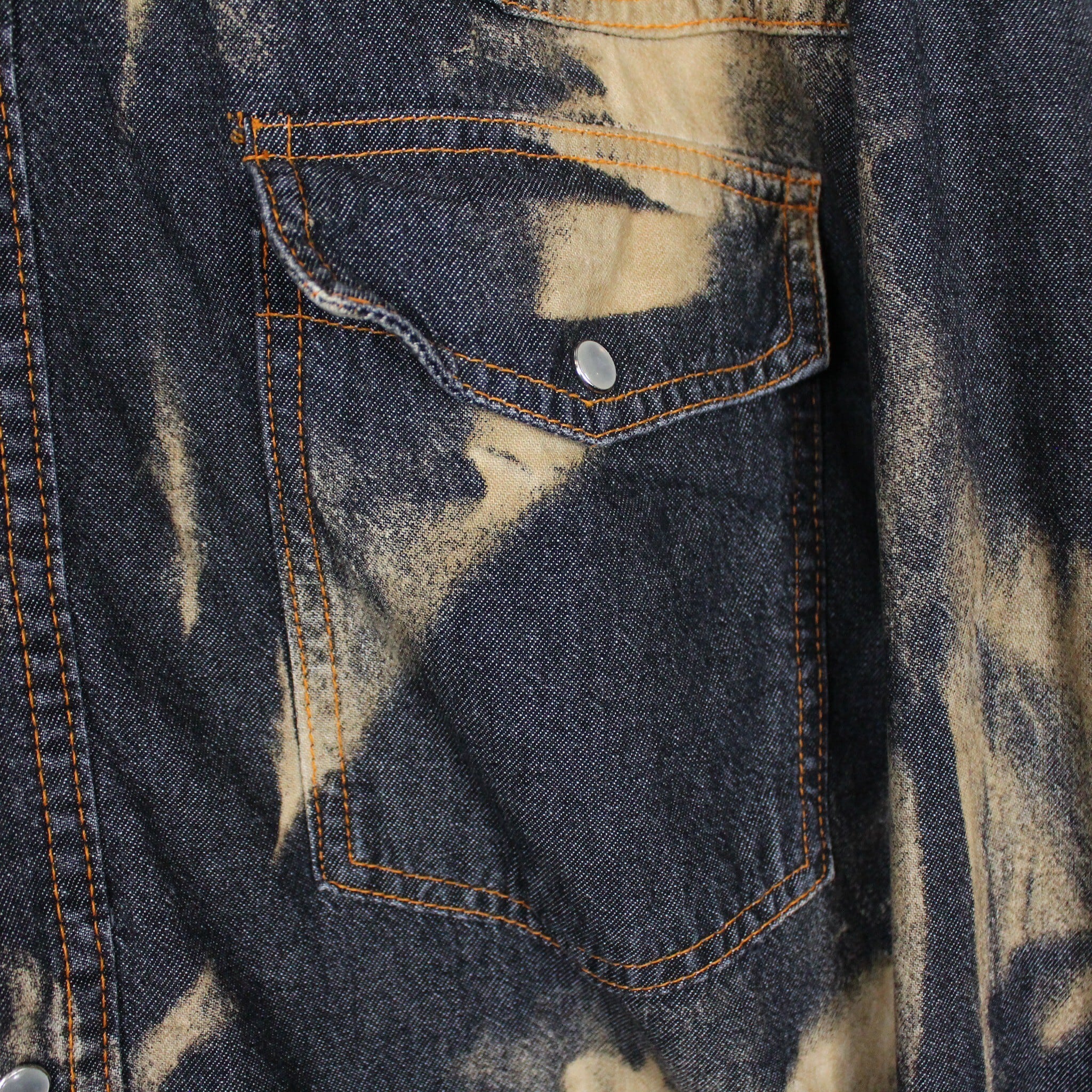 ブラックデニムのボディをベースに、タイダイ染めの技法を用いた捻れ模様のブリーチを施した長袖シャツ。