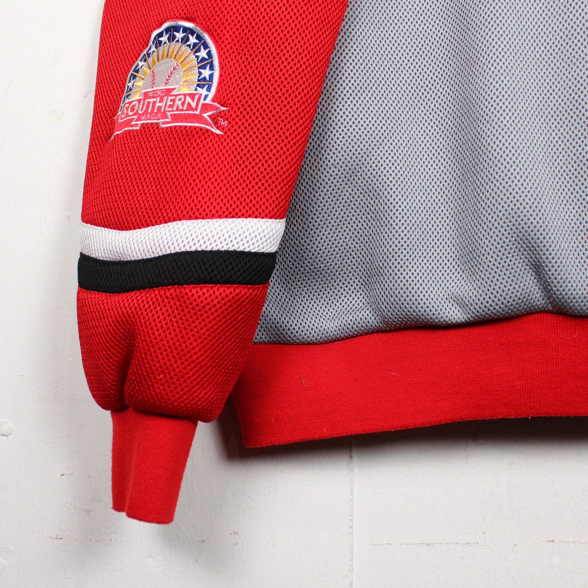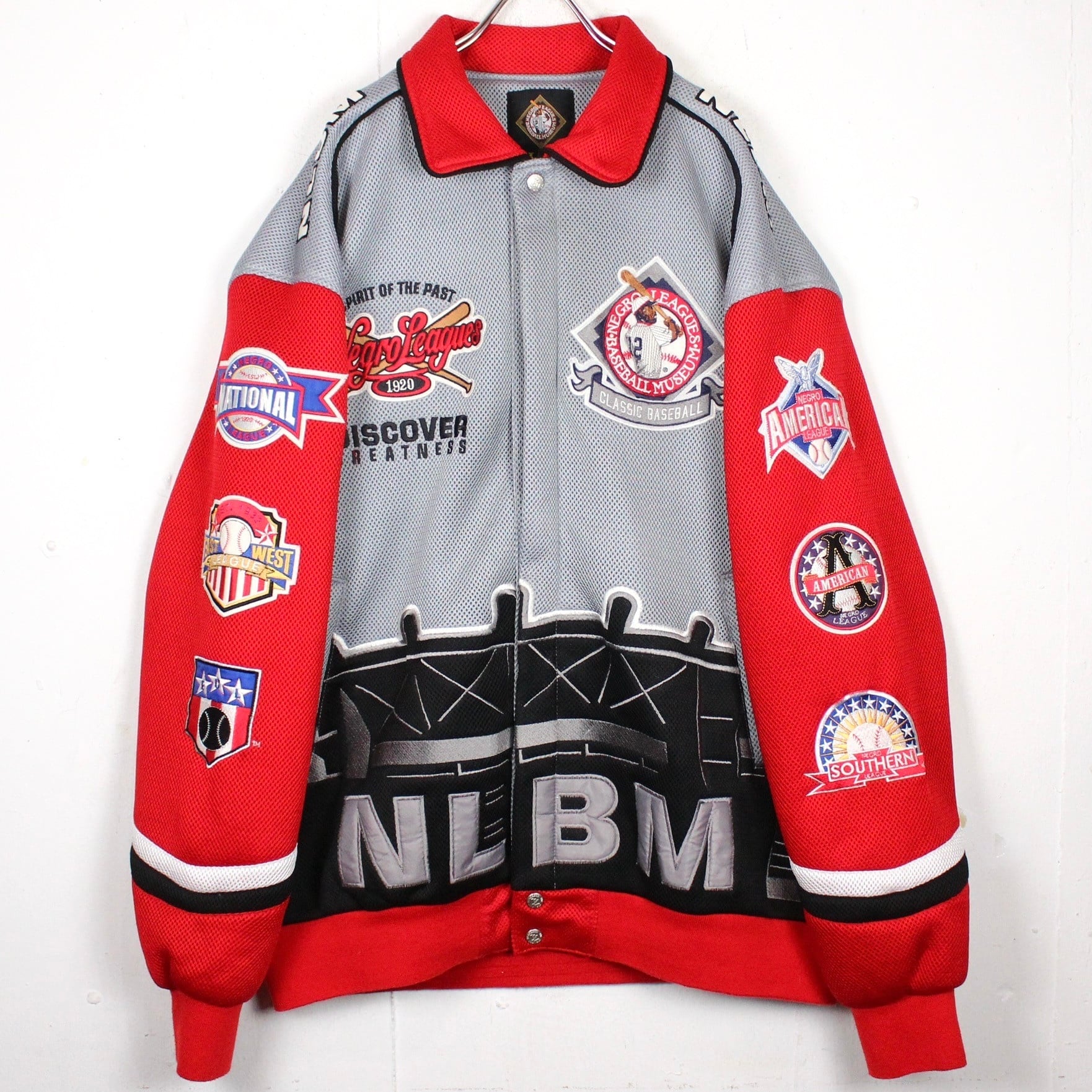 グレーと発色の良い赤色のメッシュ素材を切り替えたボディに、フロントやアーム、バックにまでニグロリーグのワッペンが施されたデザインのスタジャン。フロントの裾あたりには球場を型どった切り替えが施された遊び心のあるデザイン性も◎