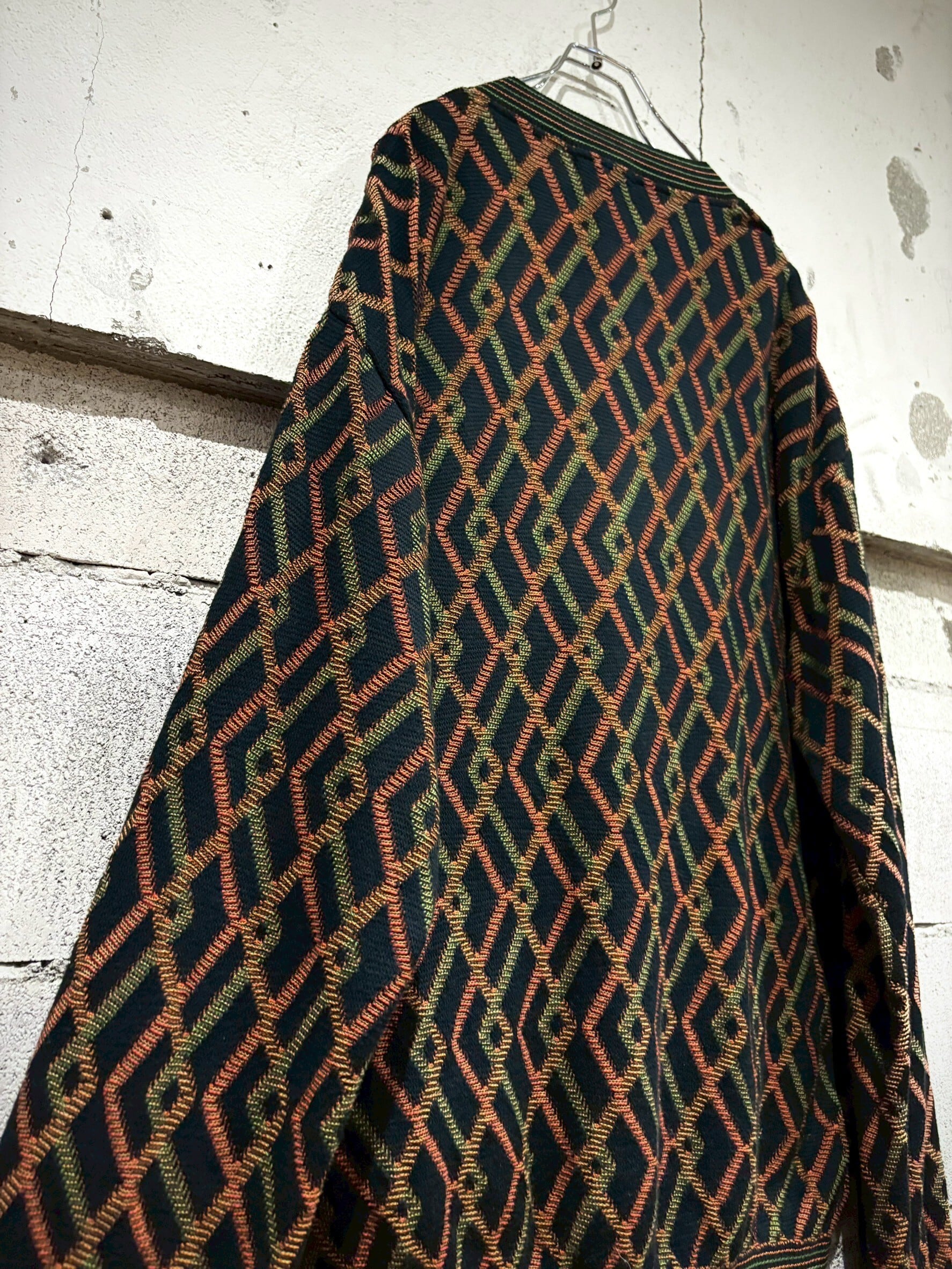 ブラックのボディをベースに、オレンジ×緑てダイヤモンド柄を載せたカナダ製のニットカーディガン。