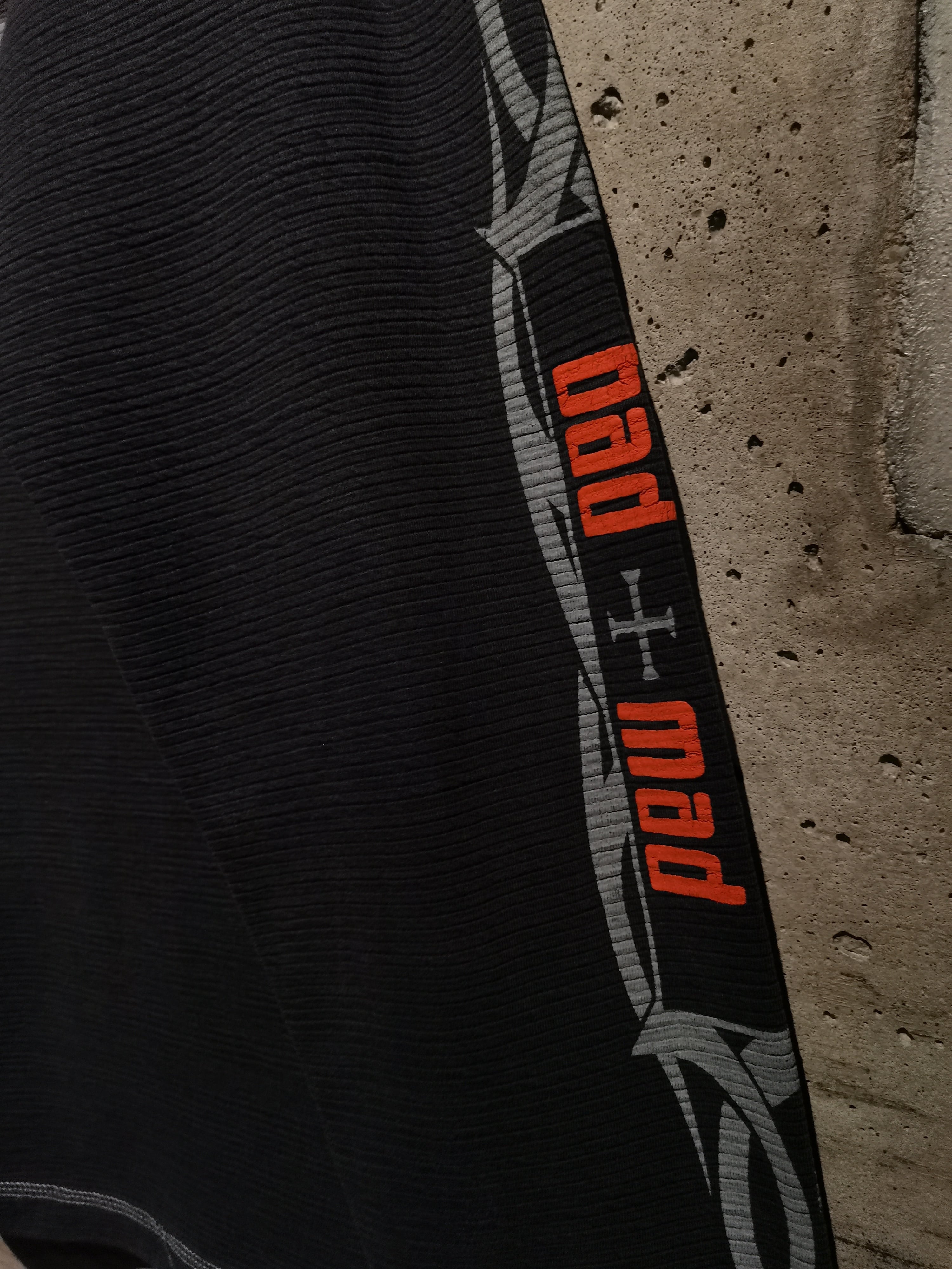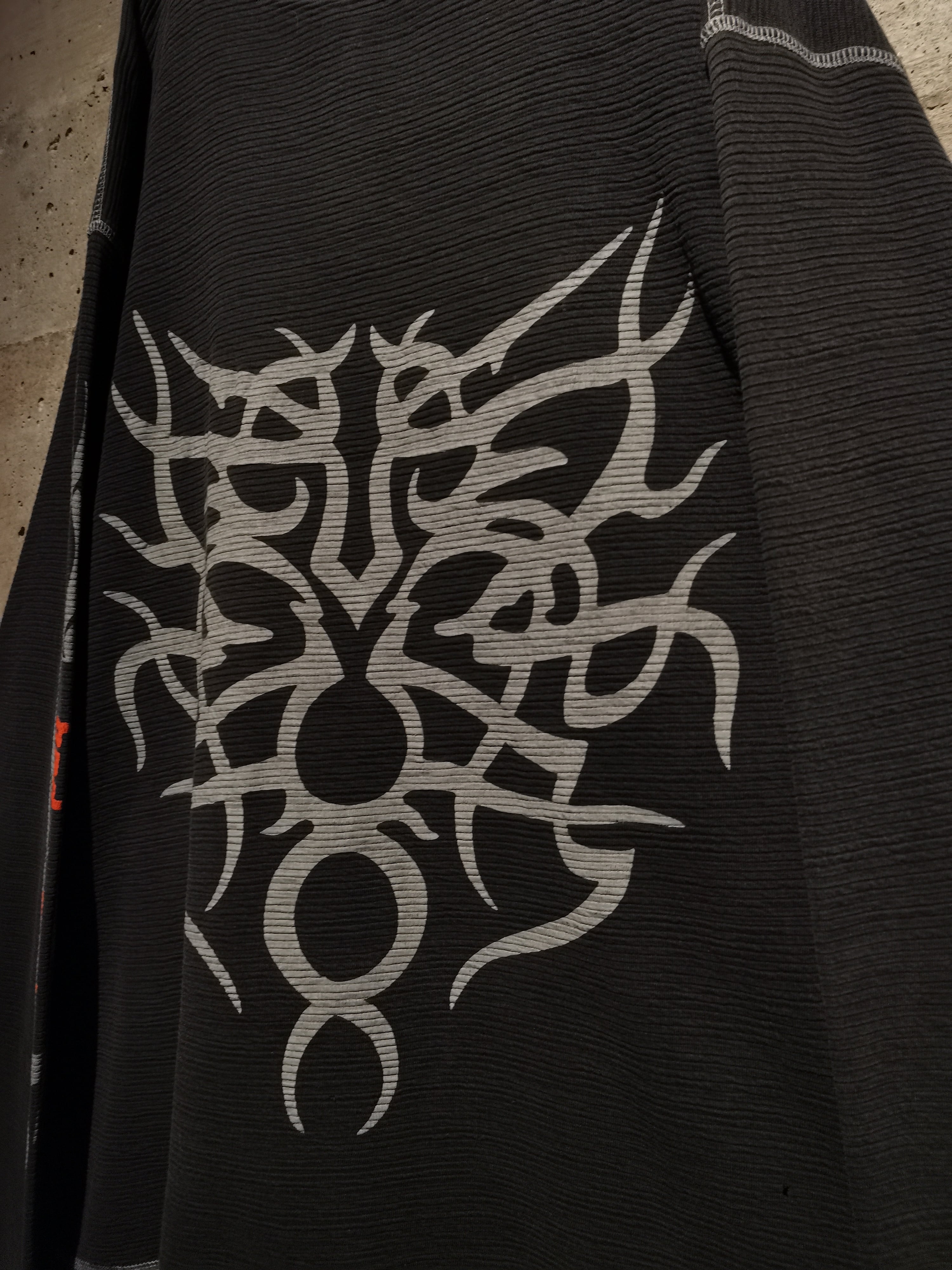 畝のある独特なテキスタイルを用いたボディに、フロントにインパクトのあるトライバル調のモチーフ、アームと背面にはトライバルデザイン×ブランドネームを載せたロンT。